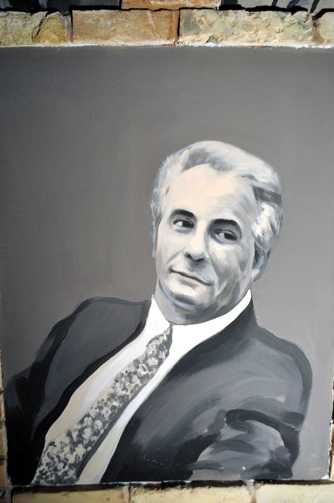 Egy vendéglátóhely falfelületeiről köszönnek vissza a legnagyobb maffiózók. Fotorealisztikus portrékép festés. Budapest - 2012