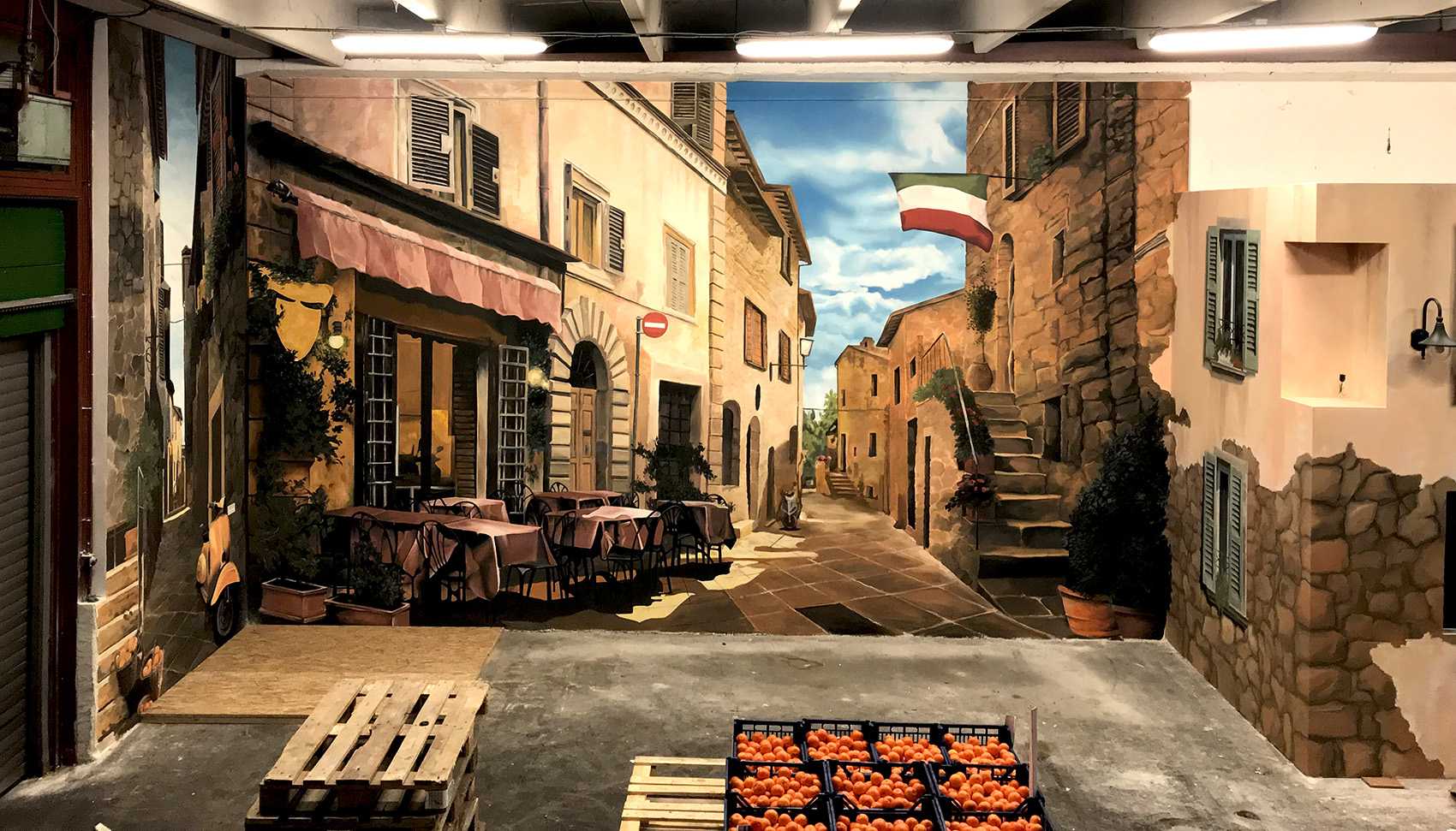 Raktárépületben készült, olasz kisvárosi utcát ábrázoló fal freskó. A 150 m2-es festmény 7 nap alatt készült el. Budapest, 2018