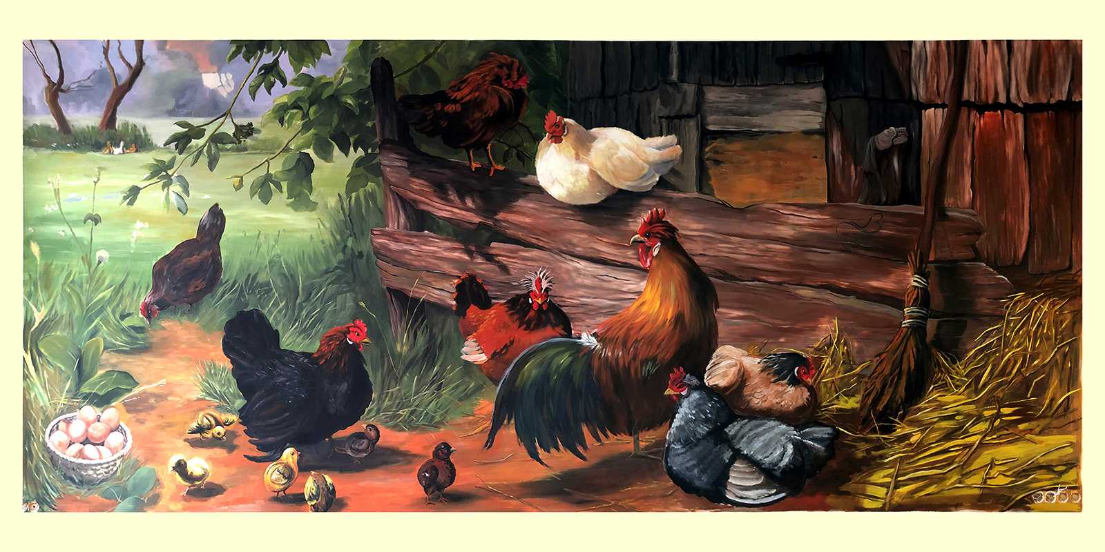 Egy tojás kereskedés belső falfelületére készült dekorfestés. Budaörs, 2020