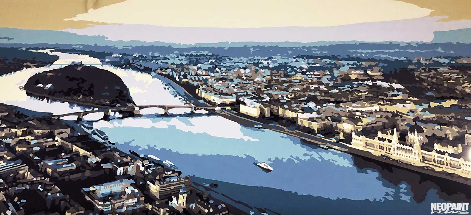 Dekorációs falfestmény egy belvárosi irodában. A beltéri falfestés egy grafikailag átdolgoztt fotó alapján készült. A színekre bontott képen a háttérben…