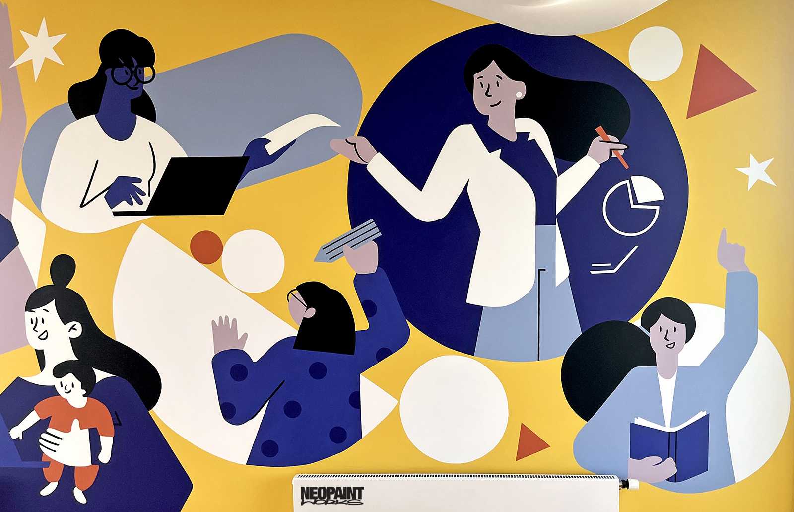Az Education First nemzetközi cég budapesti irodájának dekorációs festése, adott grafikai tervek alapján.2025, Budapest