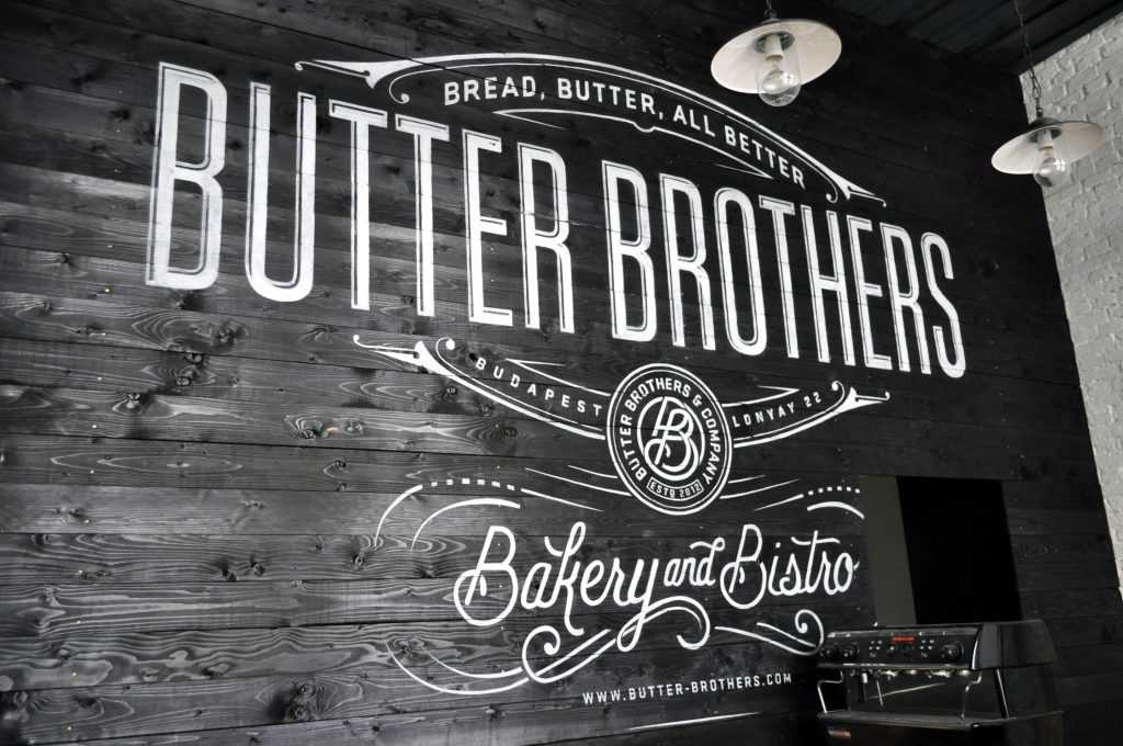 Vintage hangulatú faldekoráció és cégtábla egy belvárosi pékségben. Budapest, Lónyai utca - 2014