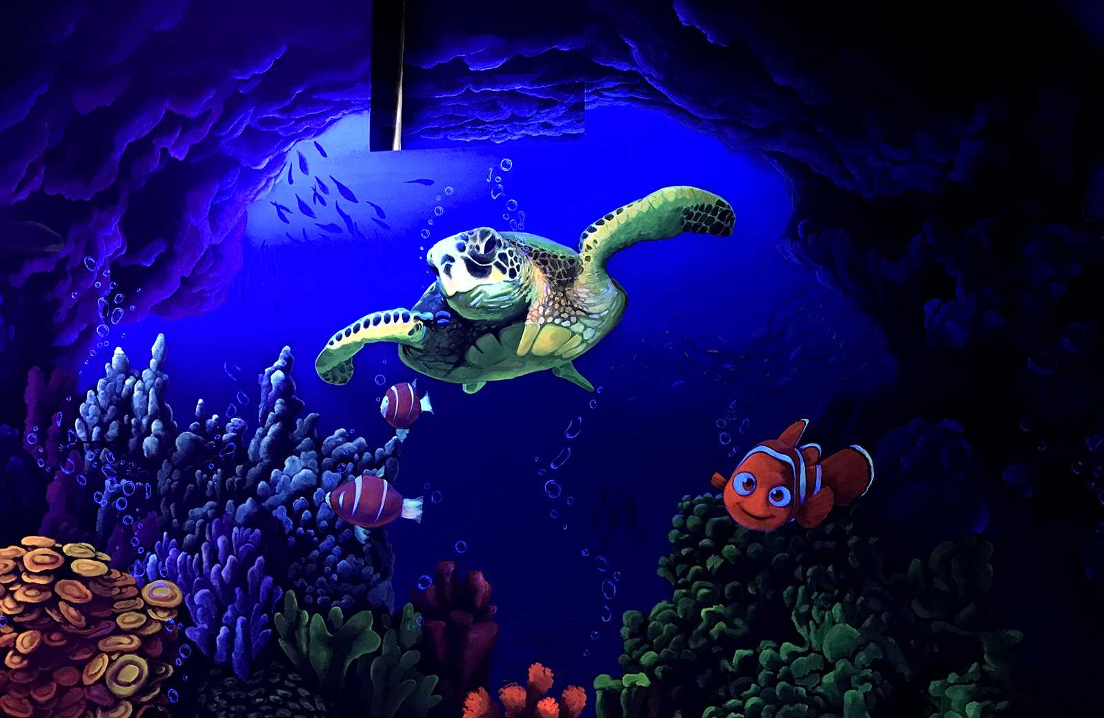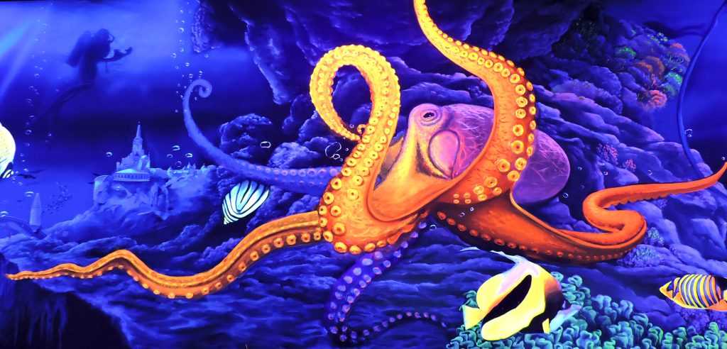 A németországi Villingen-Schwenningen-ben készült 3D-s, UV falfestmény 500m2 felületen, vízalatti világ és állatkert témakörökben. 2019
