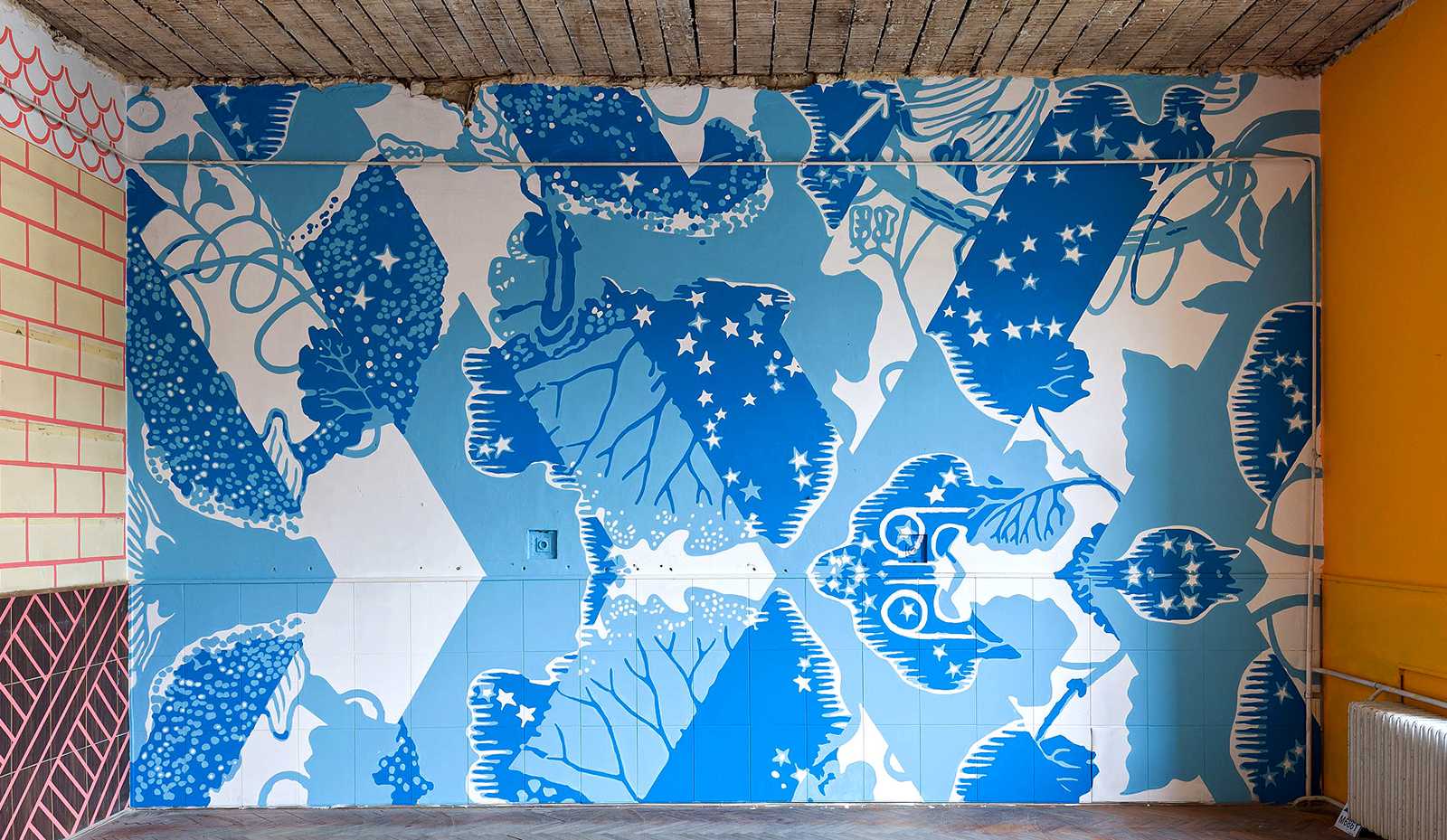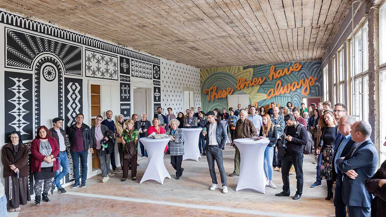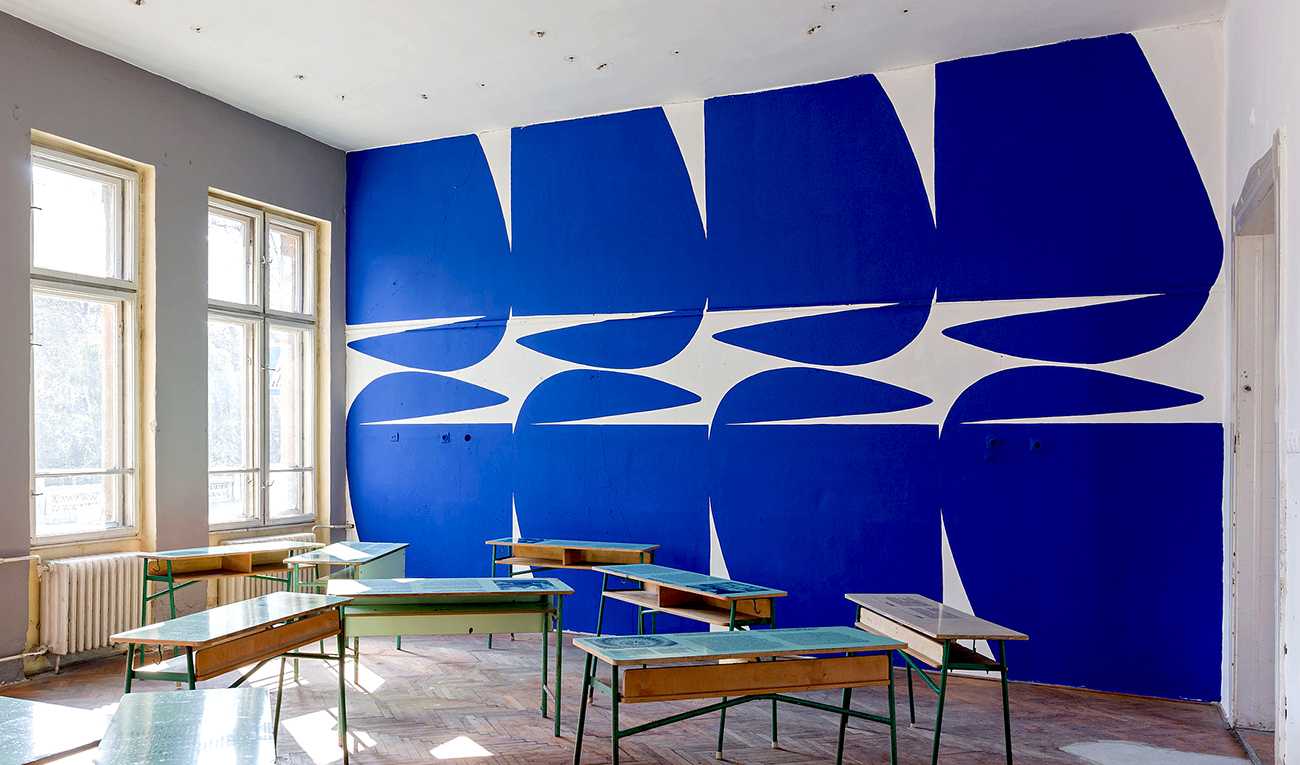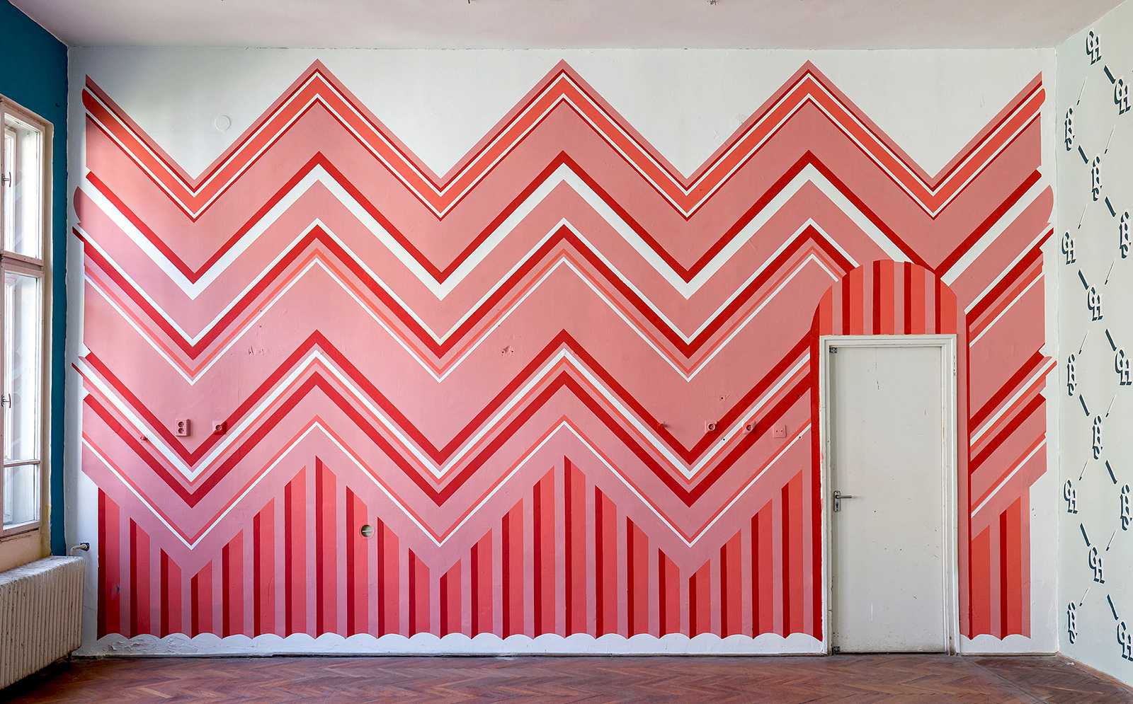 A 12 fal – Építészet és kortárs ornamentika. Épiteszek által tervezett grafikák kerültek felfestésre, egy régi iskola falfelületeire. Design-festés.