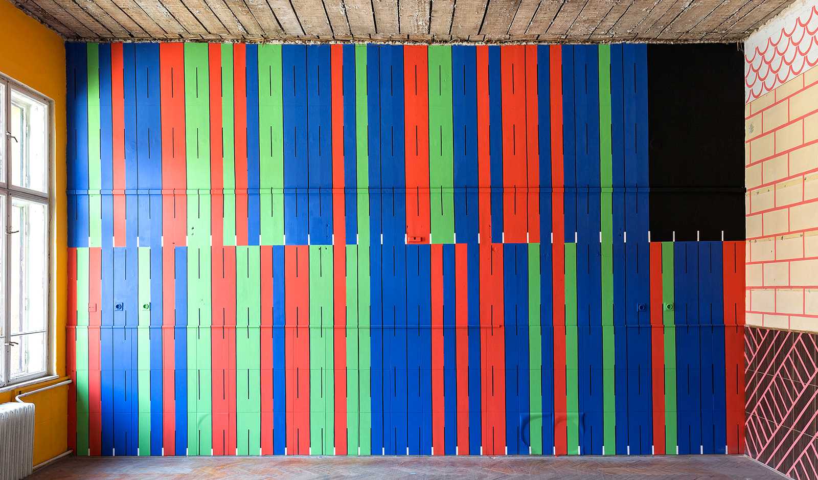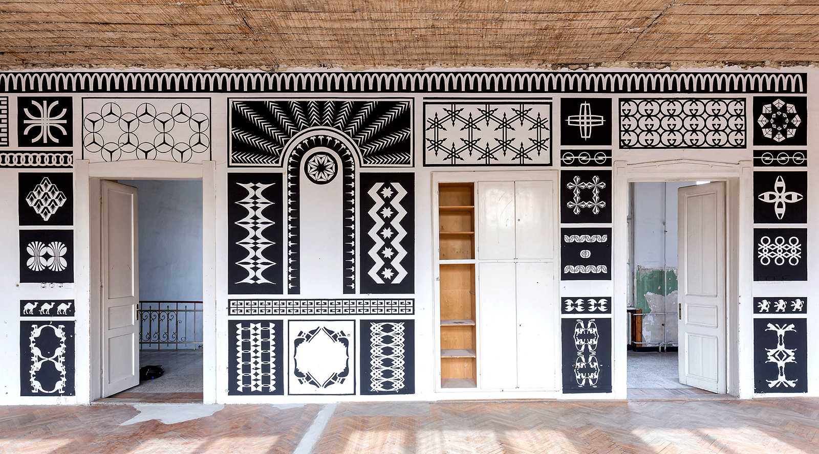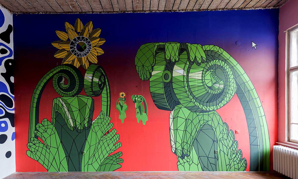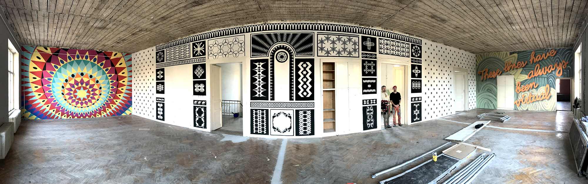 A 12 fal – Építészet és kortárs ornamentika. Épiteszek által tervezett grafikák kerültek felfestésre, egy régi iskola falfelületeire. Design-festés.