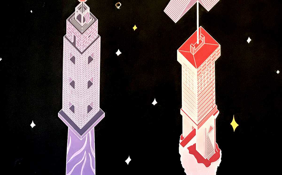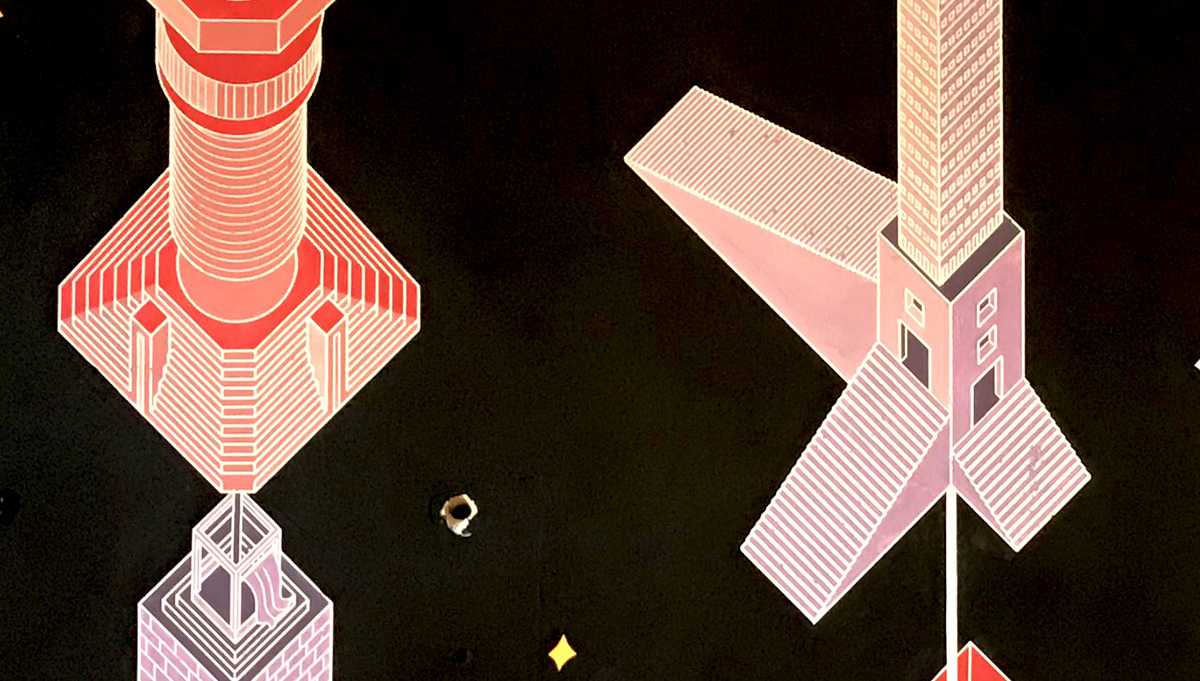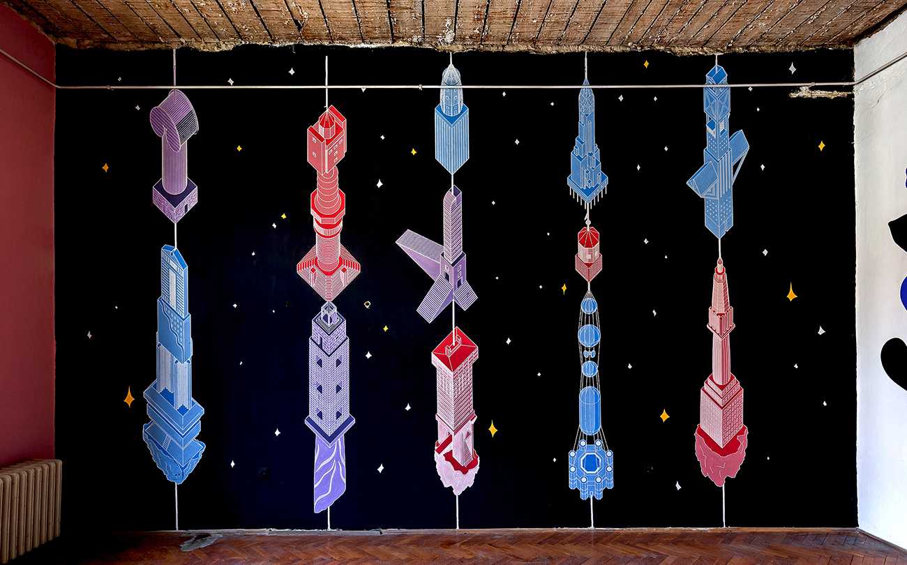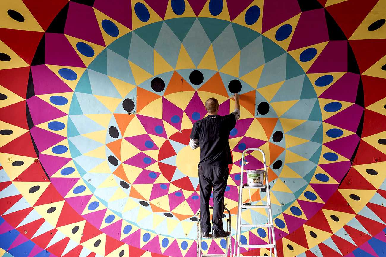 A 12 fal – Építészet és kortárs ornamentika. Épiteszek által tervezett grafikák kerültek felfestésre, egy régi iskola falfelületeire. Design-festés.