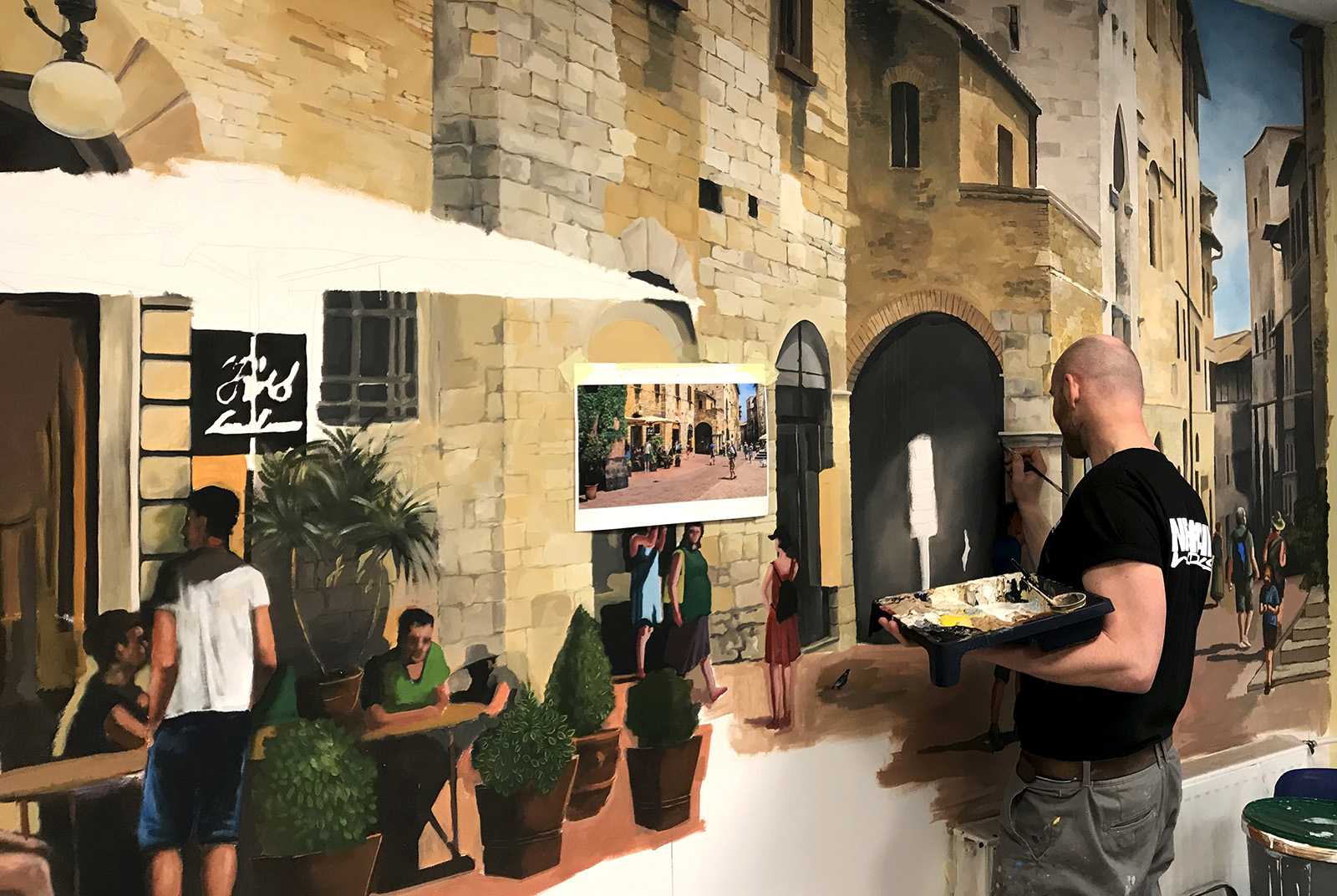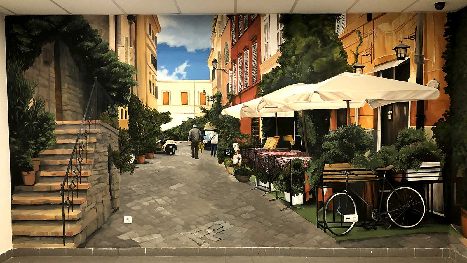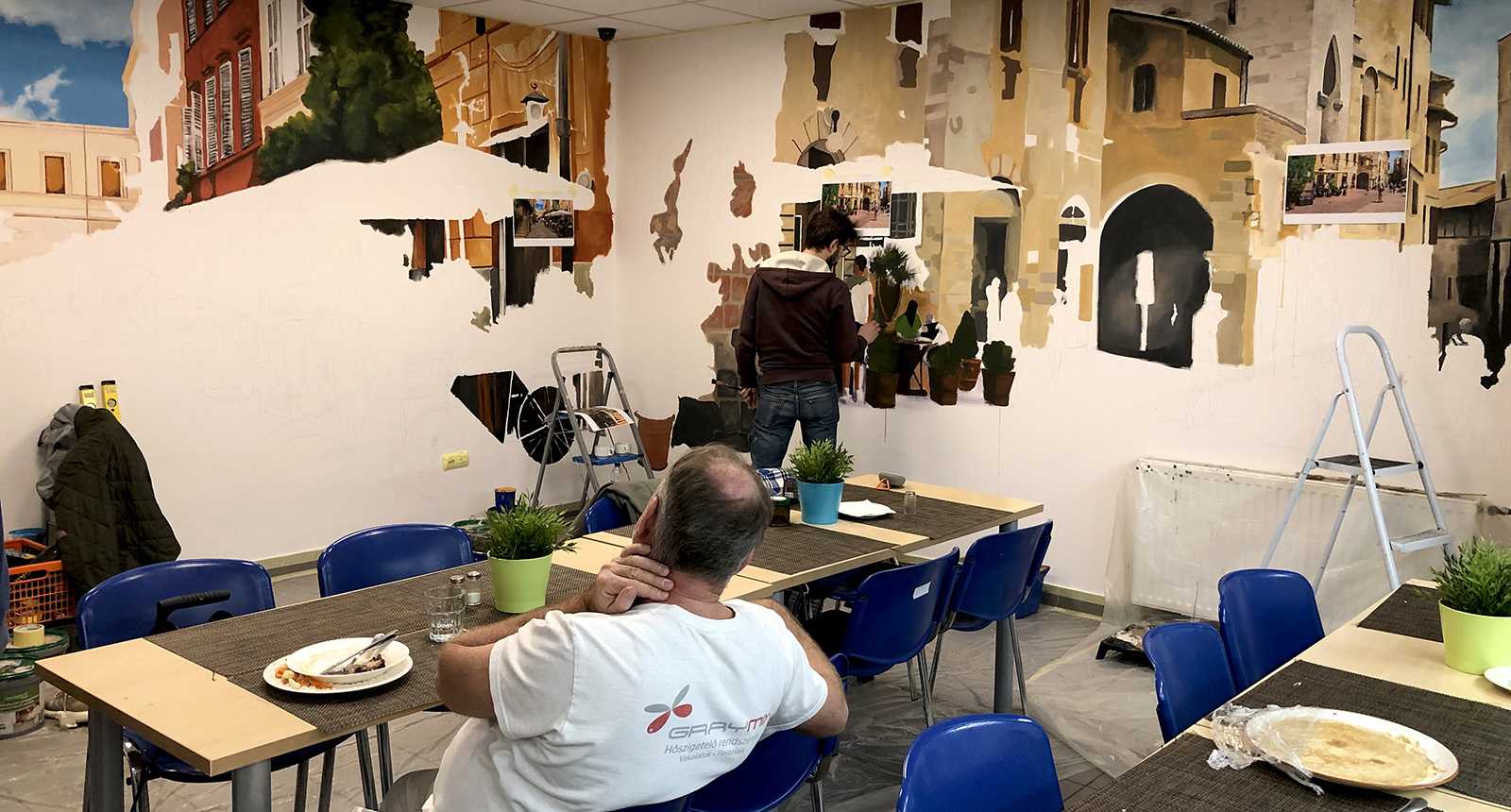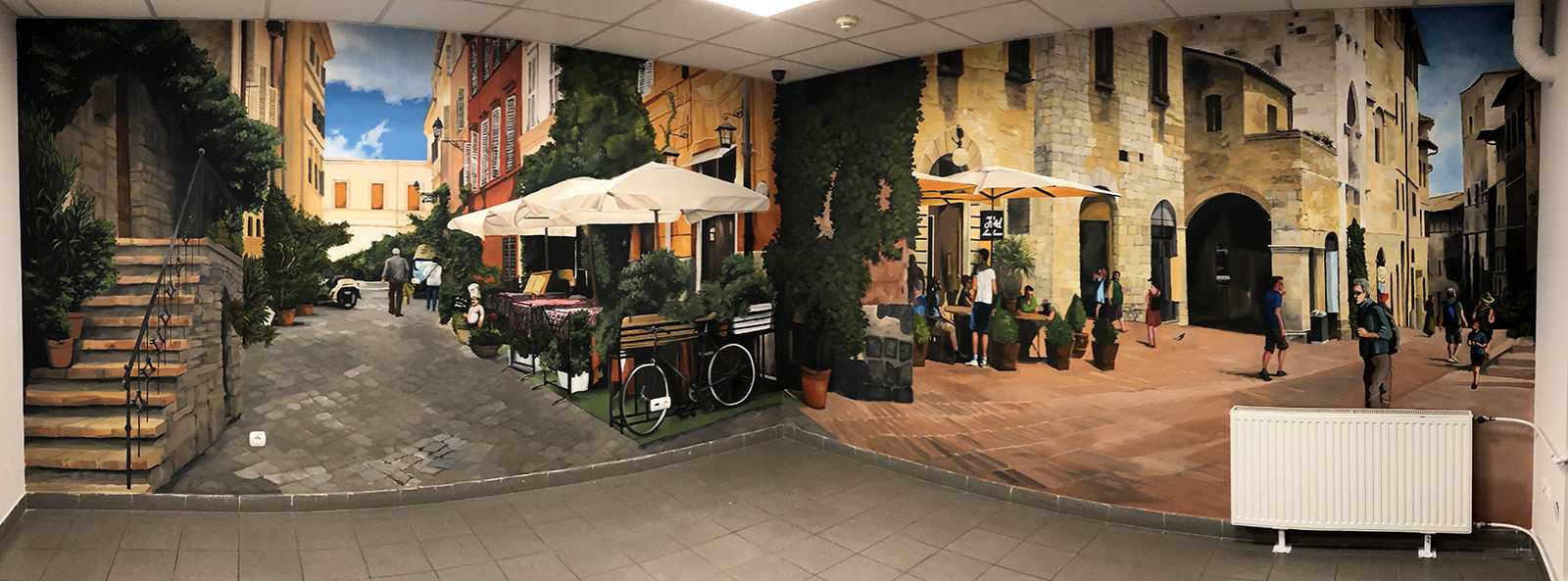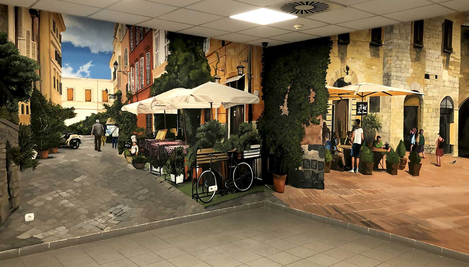 CittadinaOlasz kisvárosi utcákat ábrázoló beltéri faldekoráció a Hotel Novotel dolgozói kantinjában. Budapest, 2020