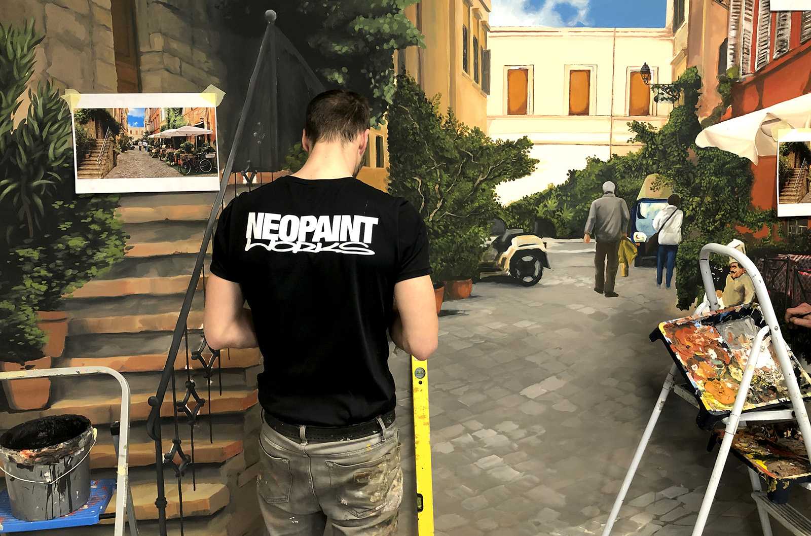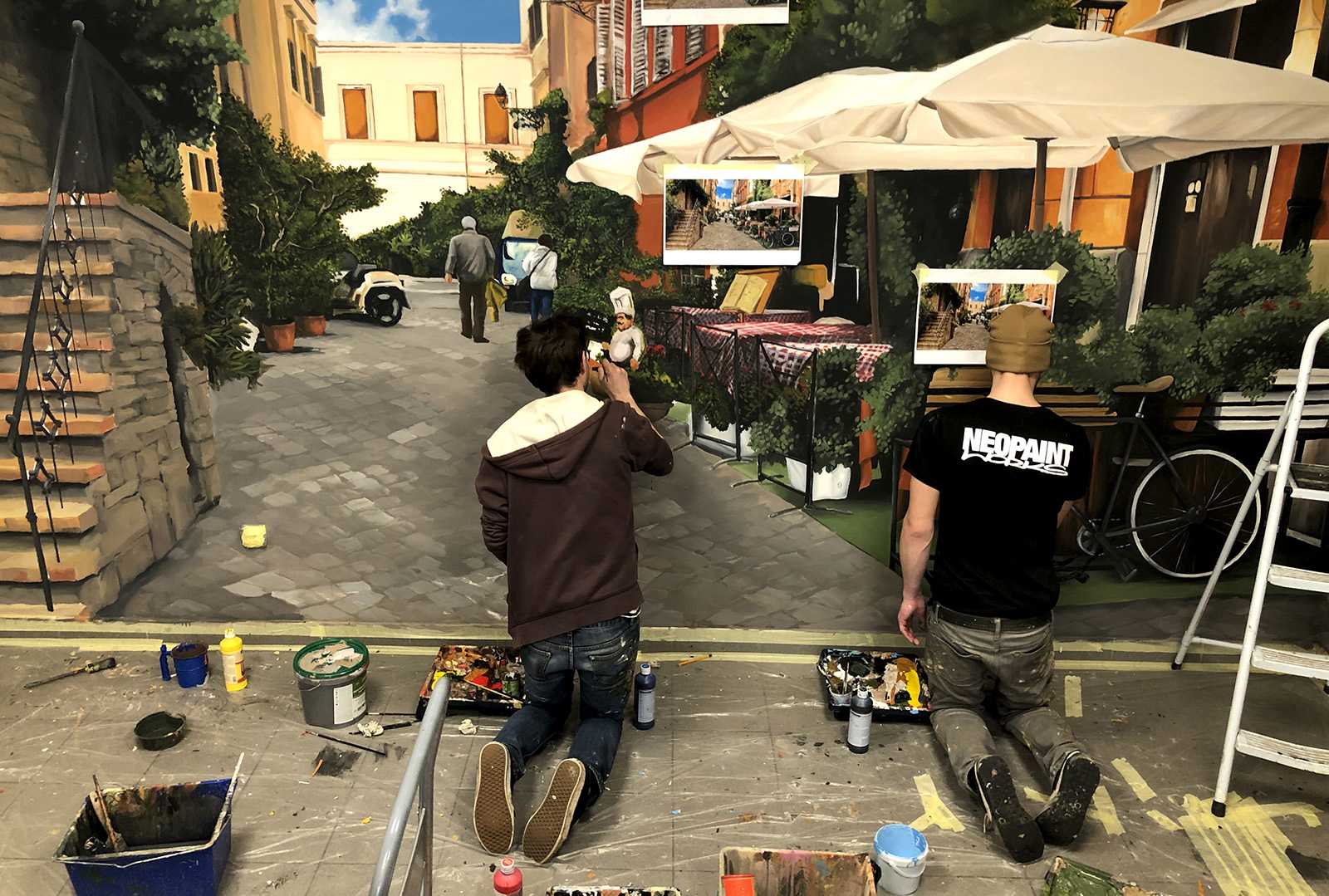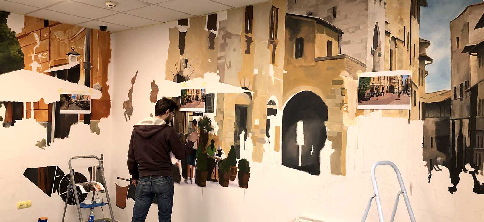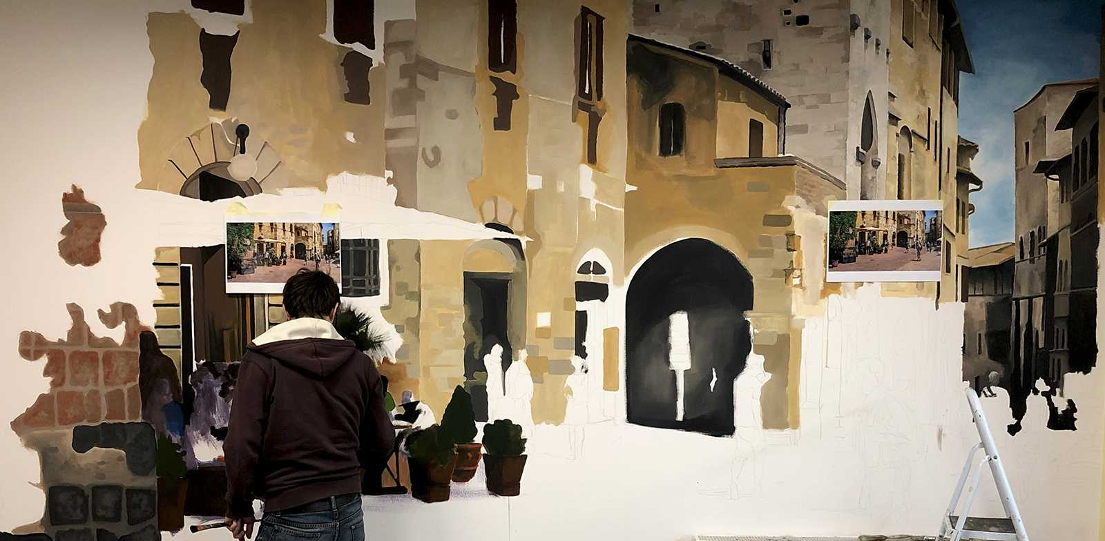 CittadinaOlasz kisvárosi utcákat ábrázoló beltéri faldekoráció a Hotel Novotel dolgozói kantinjában. Budapest, 2020