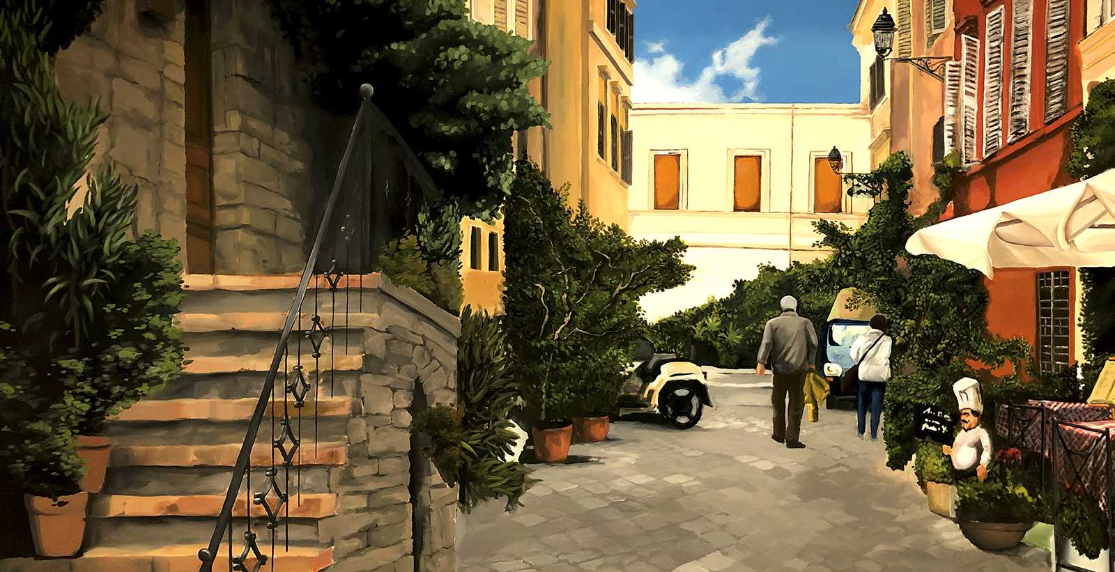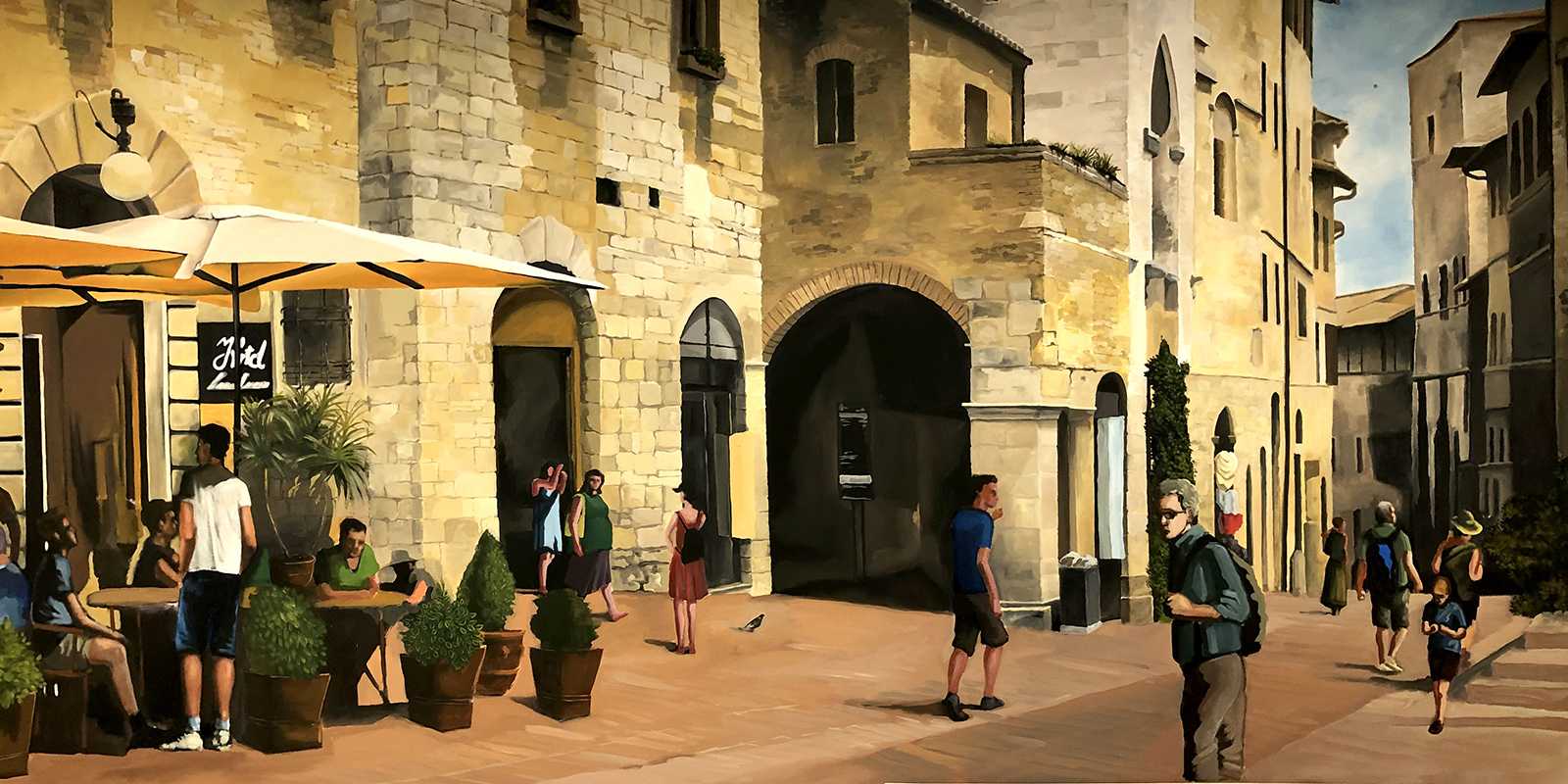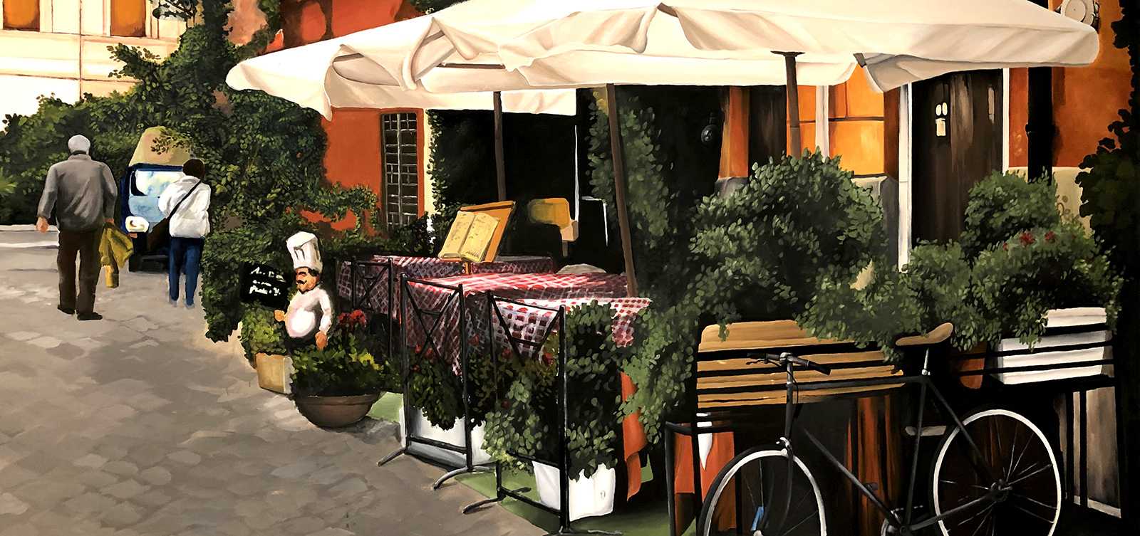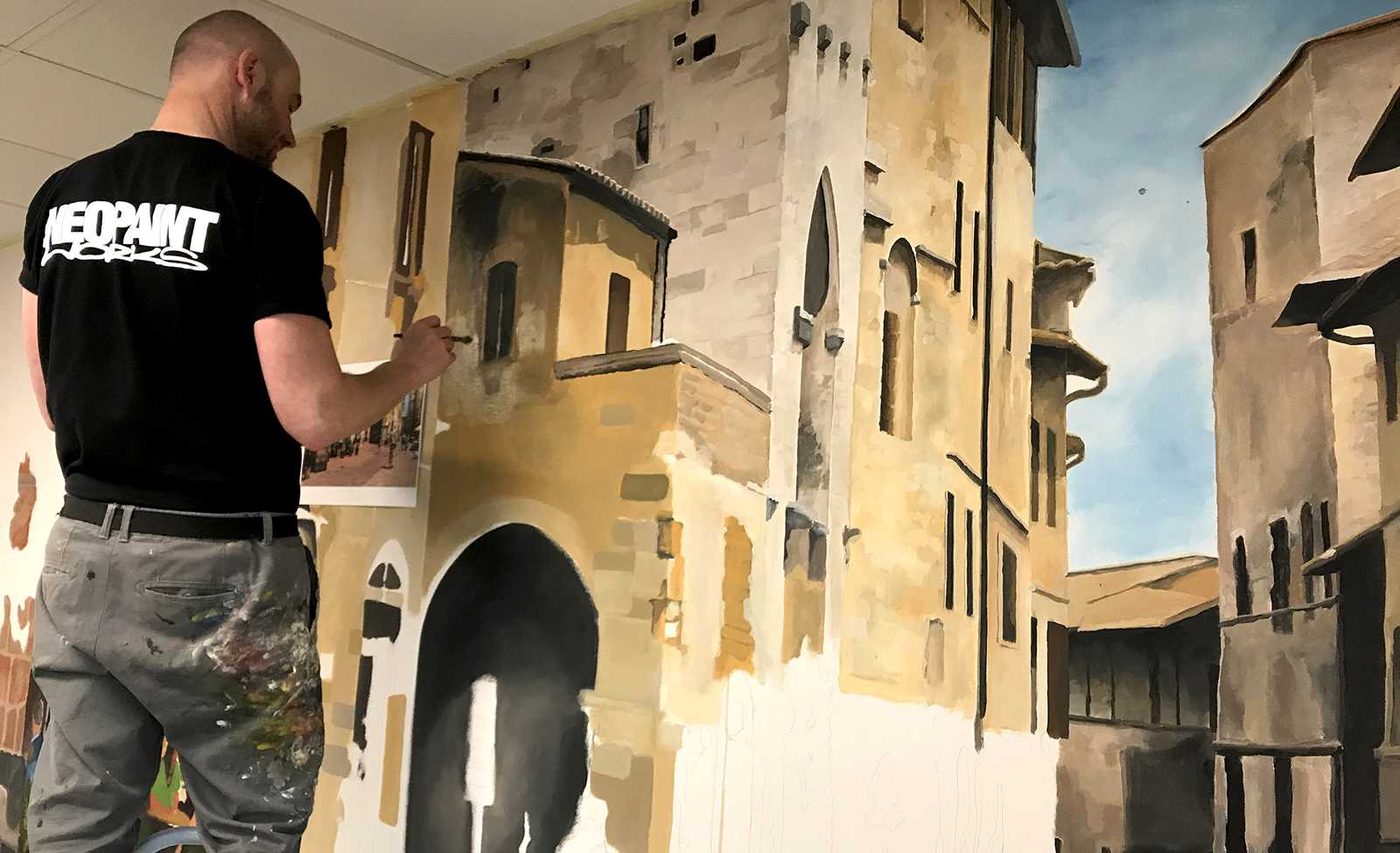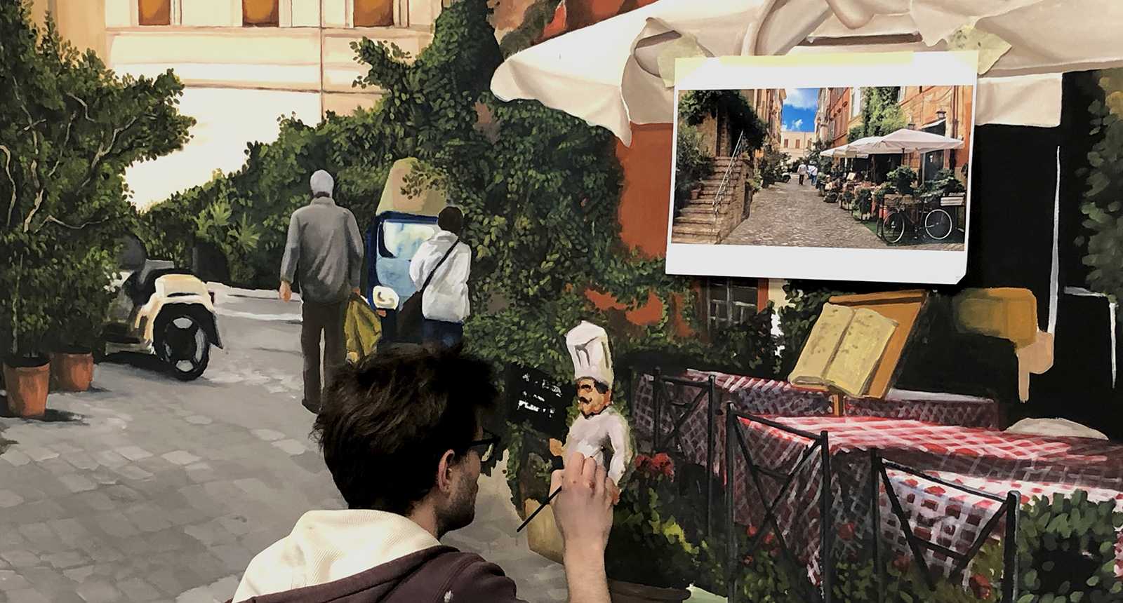 CittadinaOlasz kisvárosi utcákat ábrázoló beltéri faldekoráció a Hotel Novotel dolgozói kantinjában. Budapest, 2020
