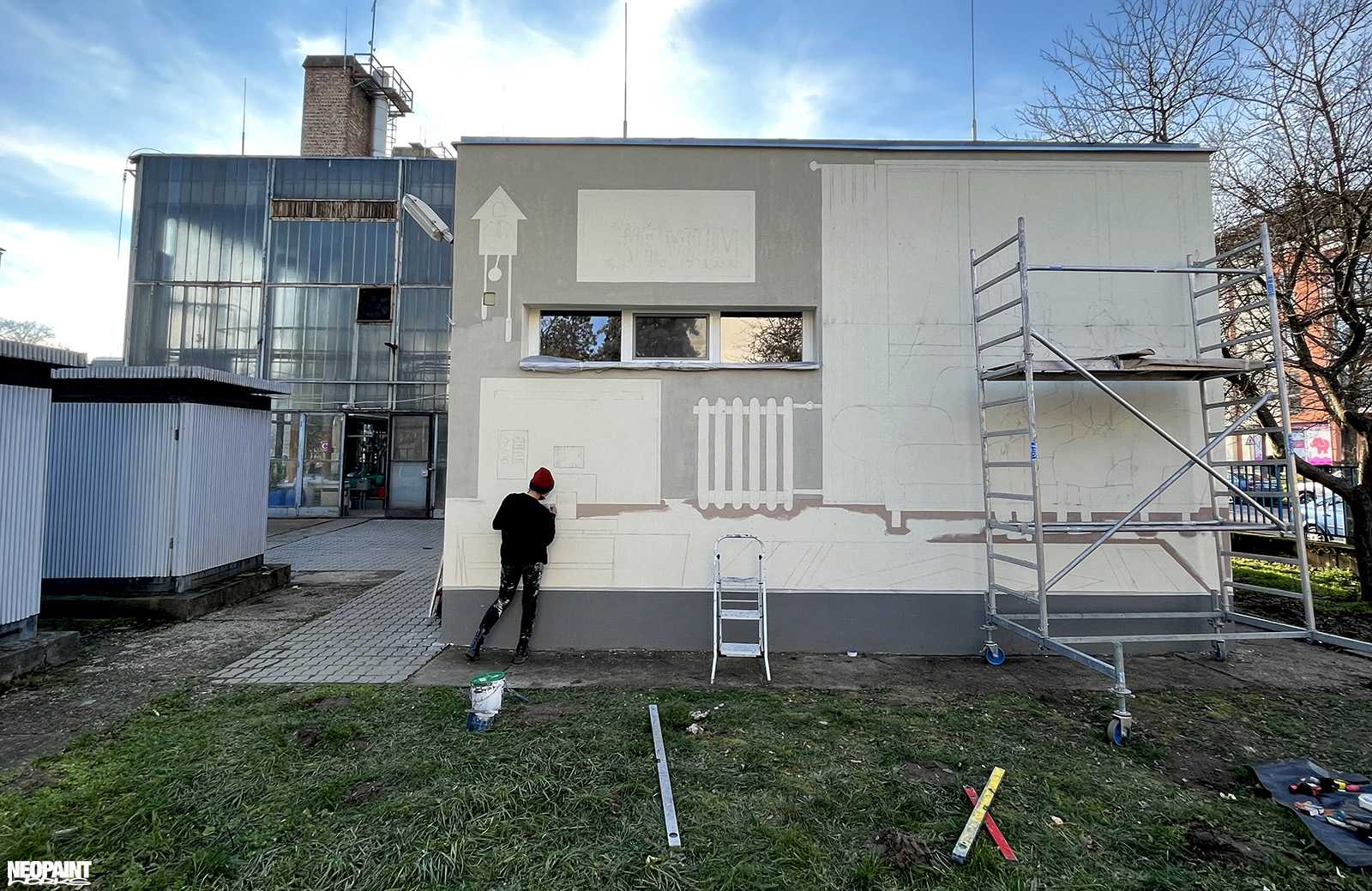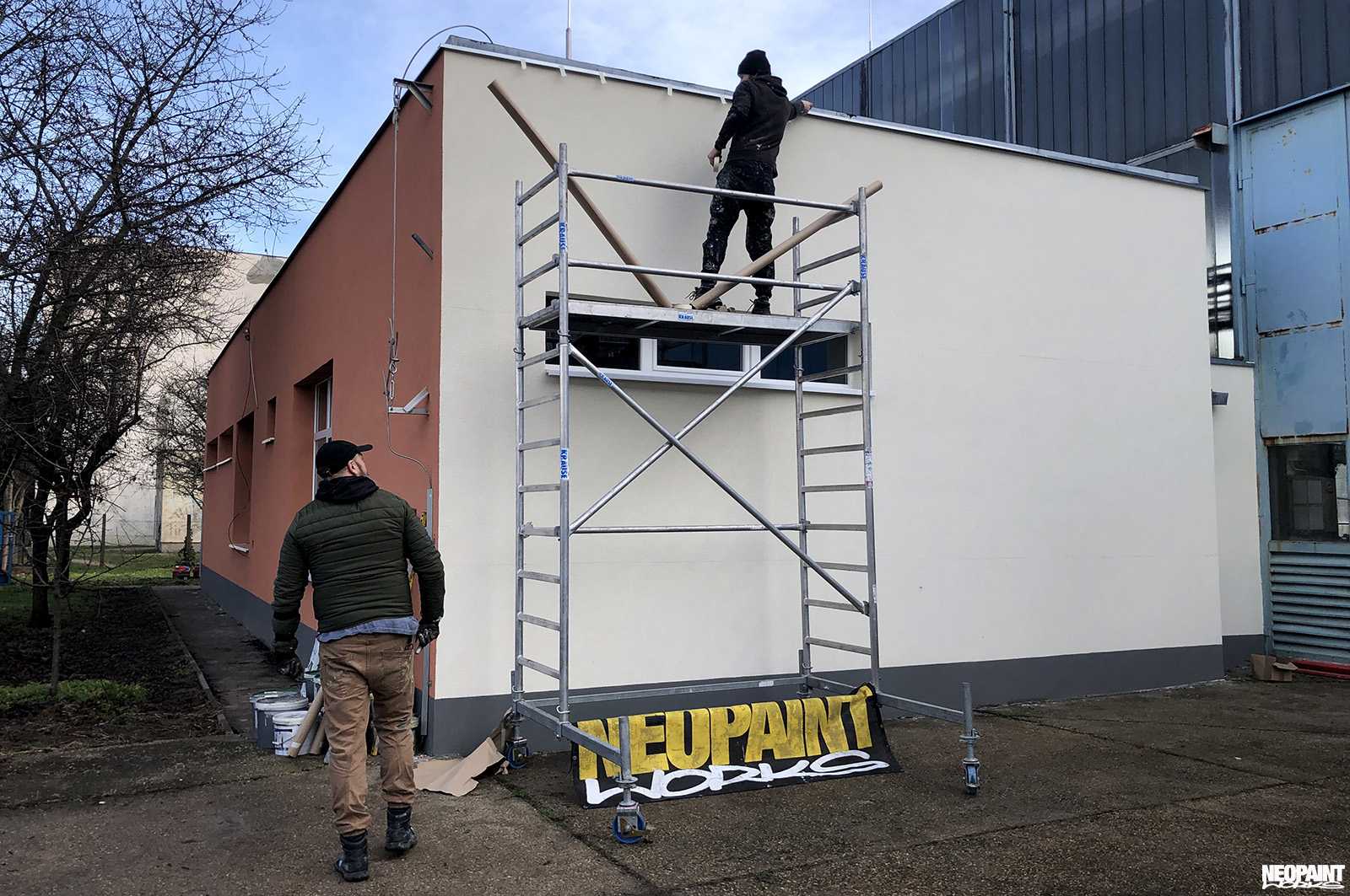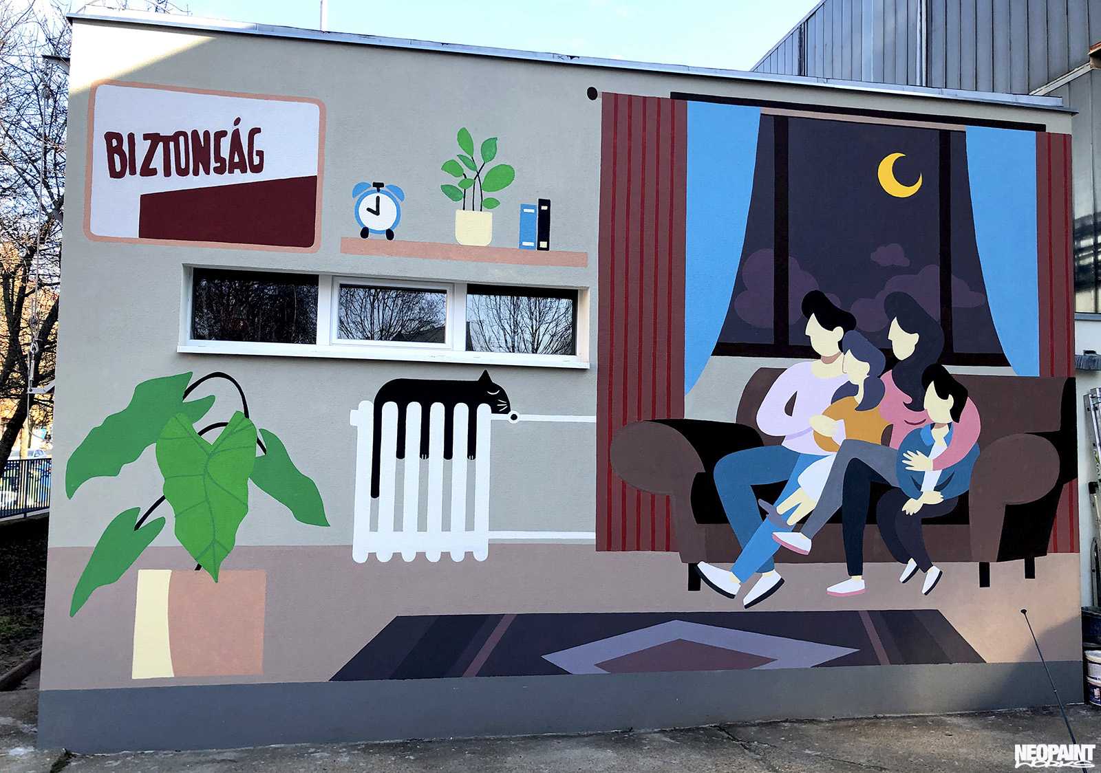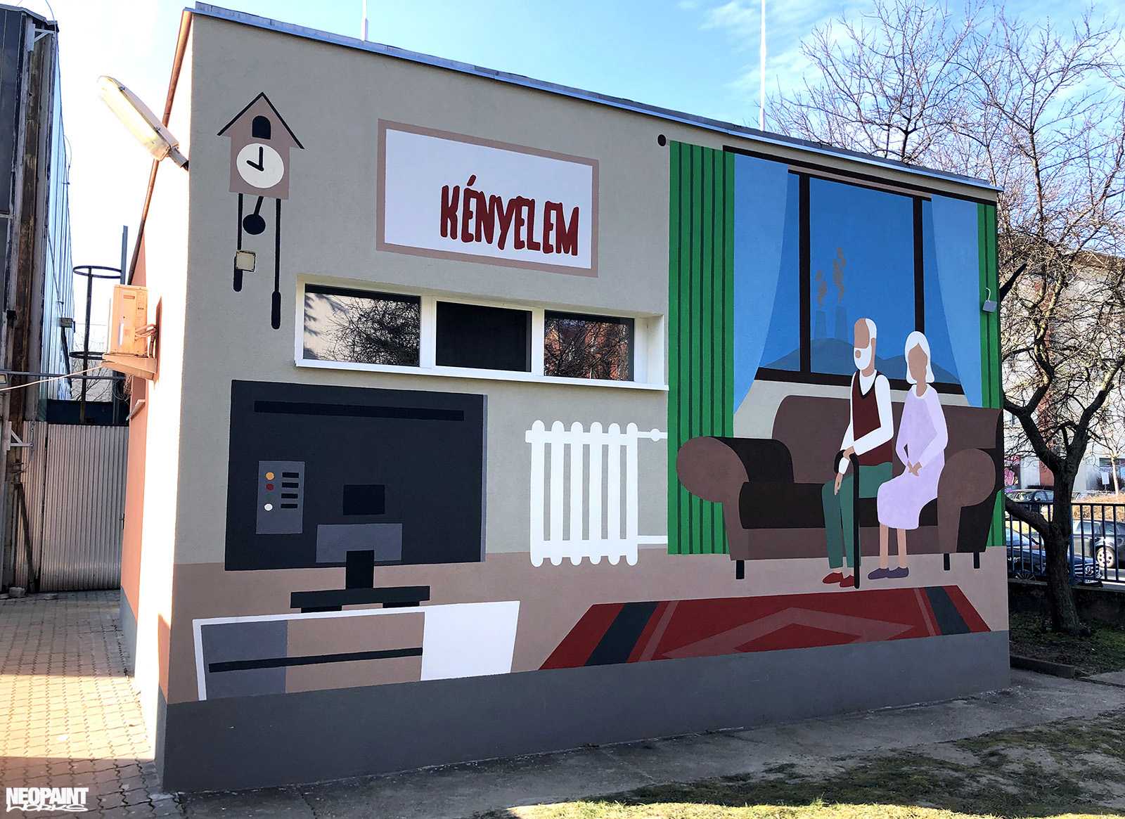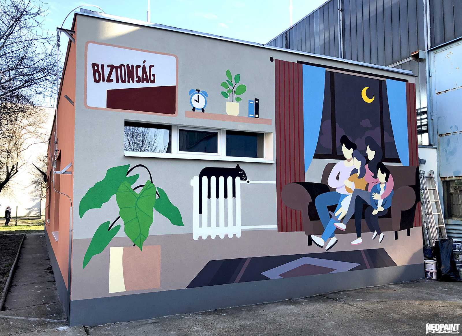 A gödöllői gáztározó egyik épületénék két oldalára készült falfestményeink. A grafikai tervek kapcsán konkrét elképzelése volt a megrendelőnek, melyek figyelembevételével terveztünk. A falfestmények négy nap alatt készültek el a téli hidegben.