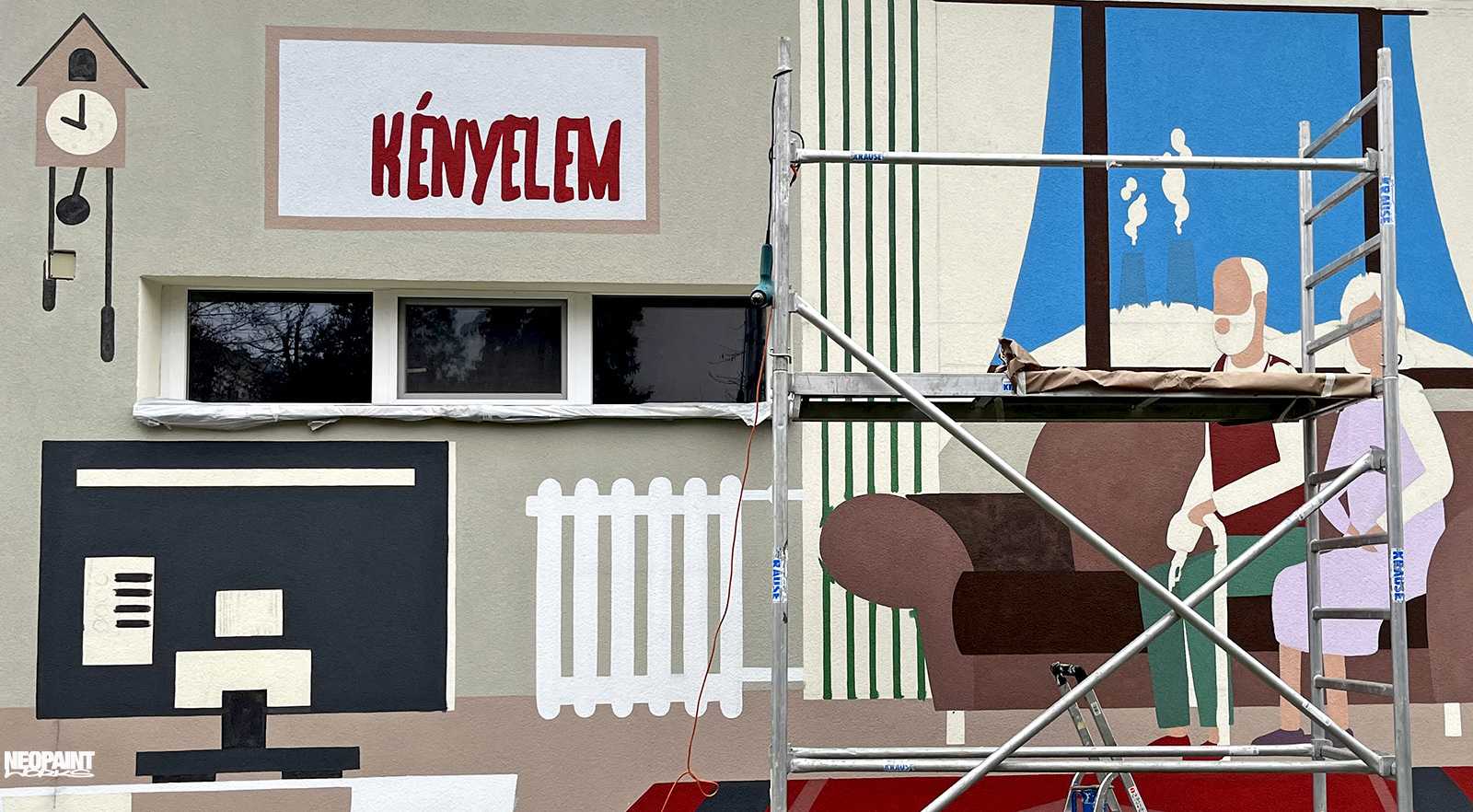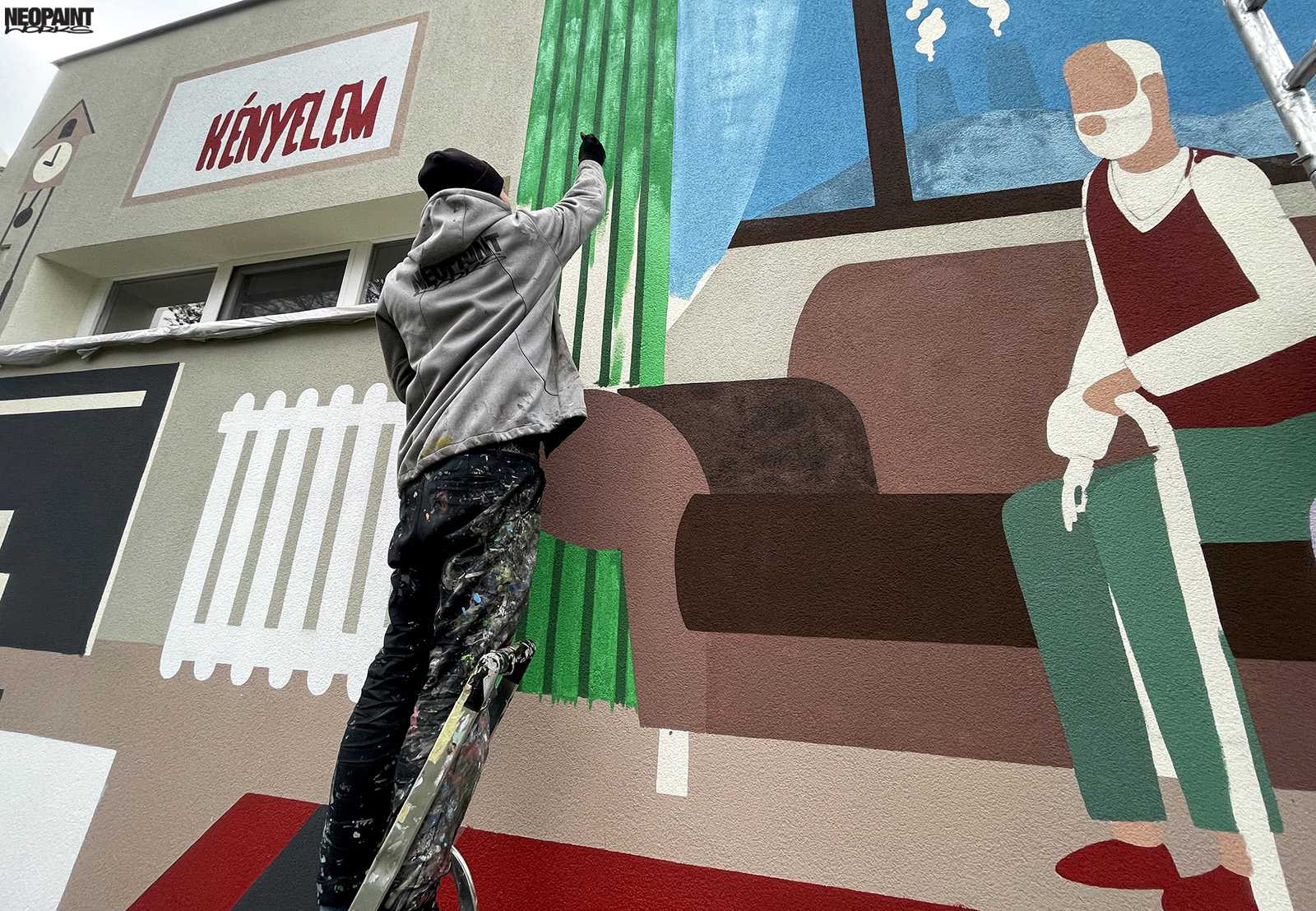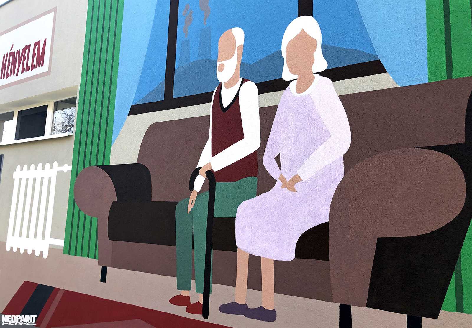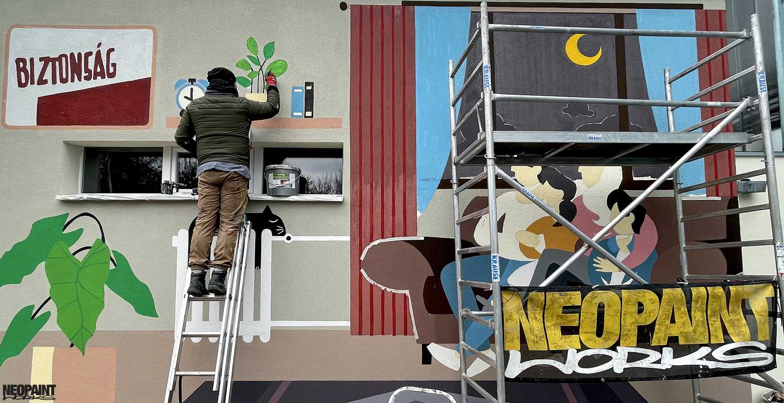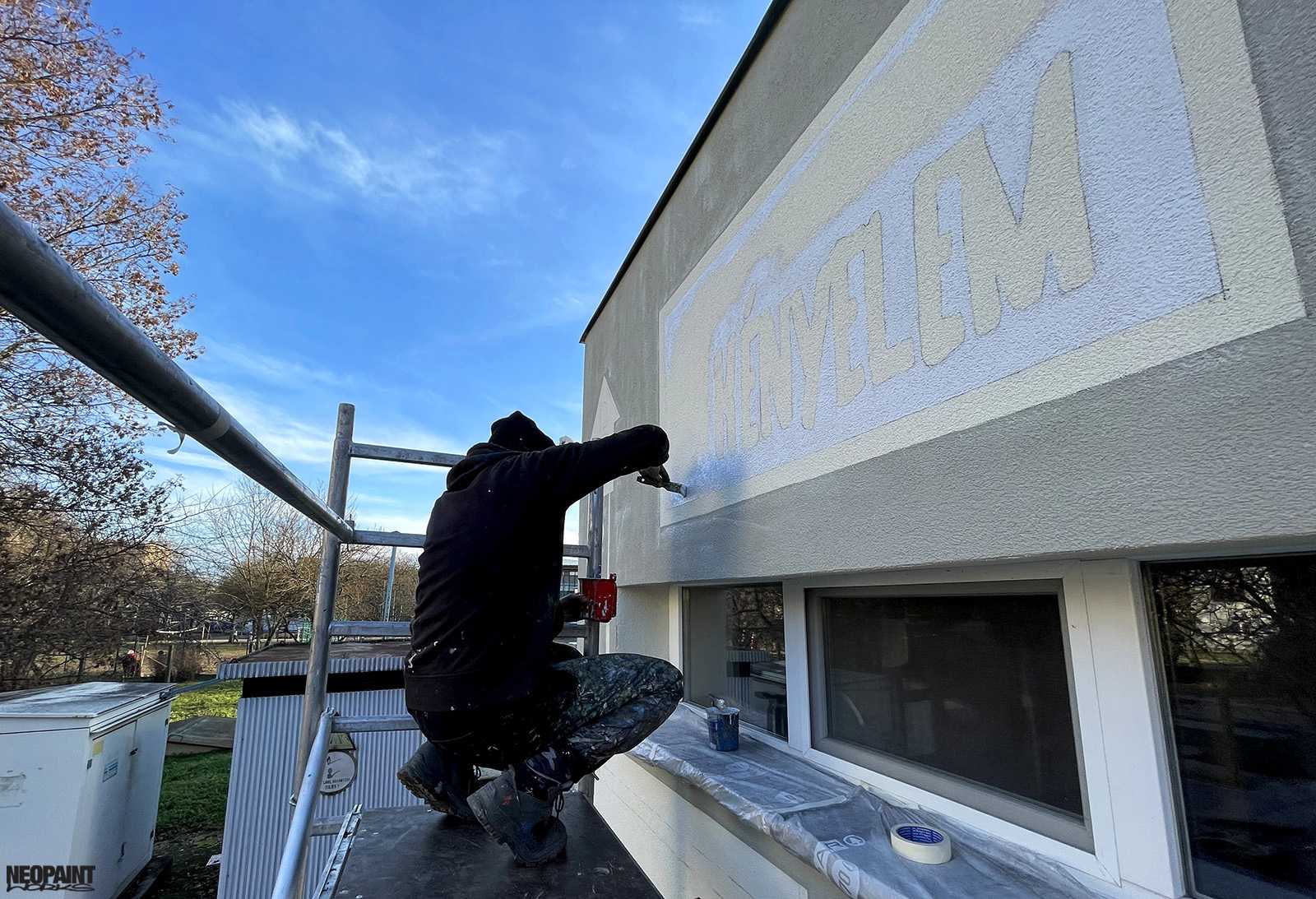 A gödöllői gáztározó egyik épületénék két oldalára készült falfestményeink. A grafikai tervek kapcsán konkrét elképzelése volt a megrendelőnek, melyek figyelembevételével terveztünk. A falfestmények négy nap alatt készültek el a téli hidegben.