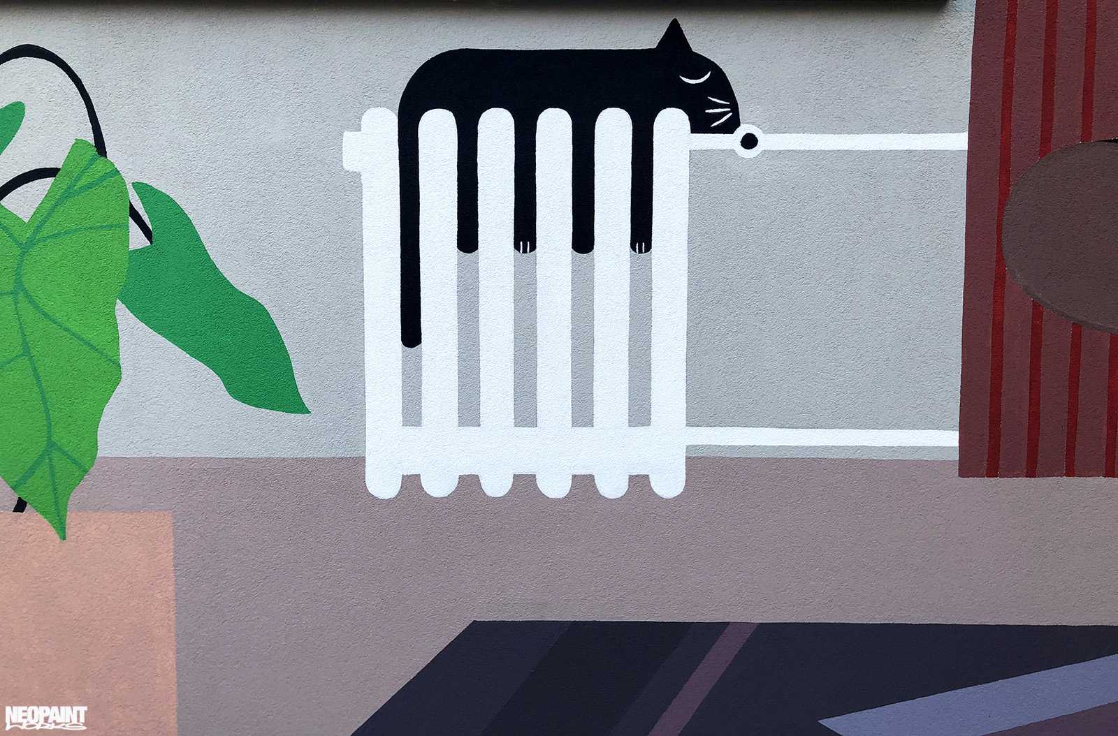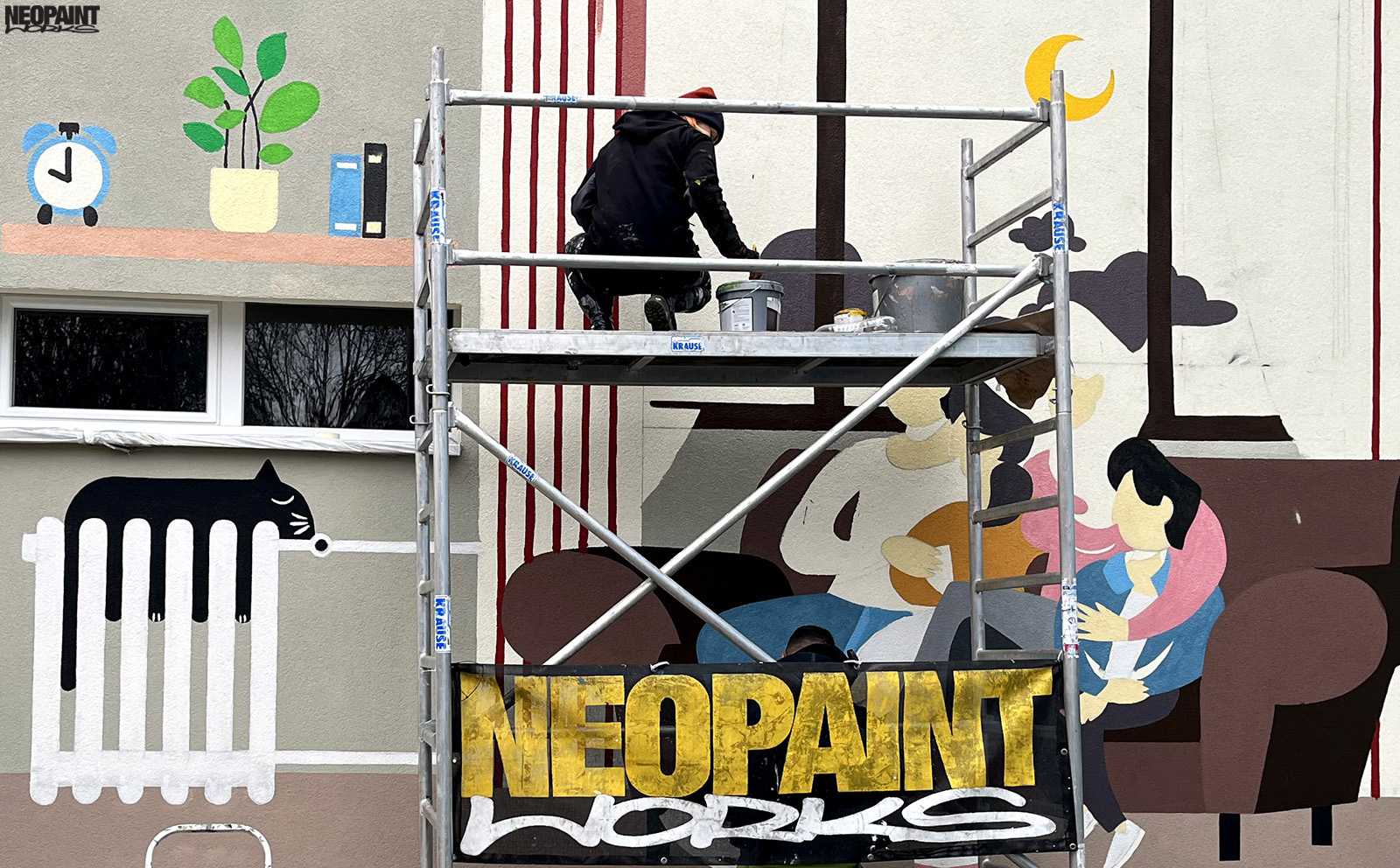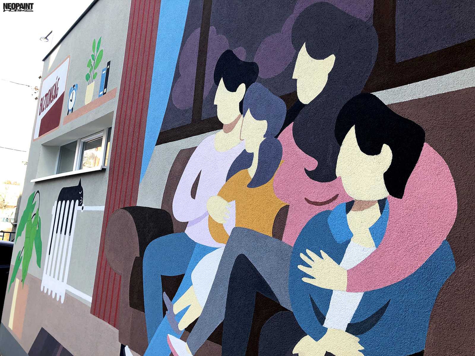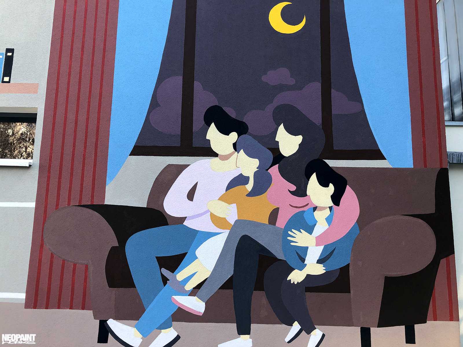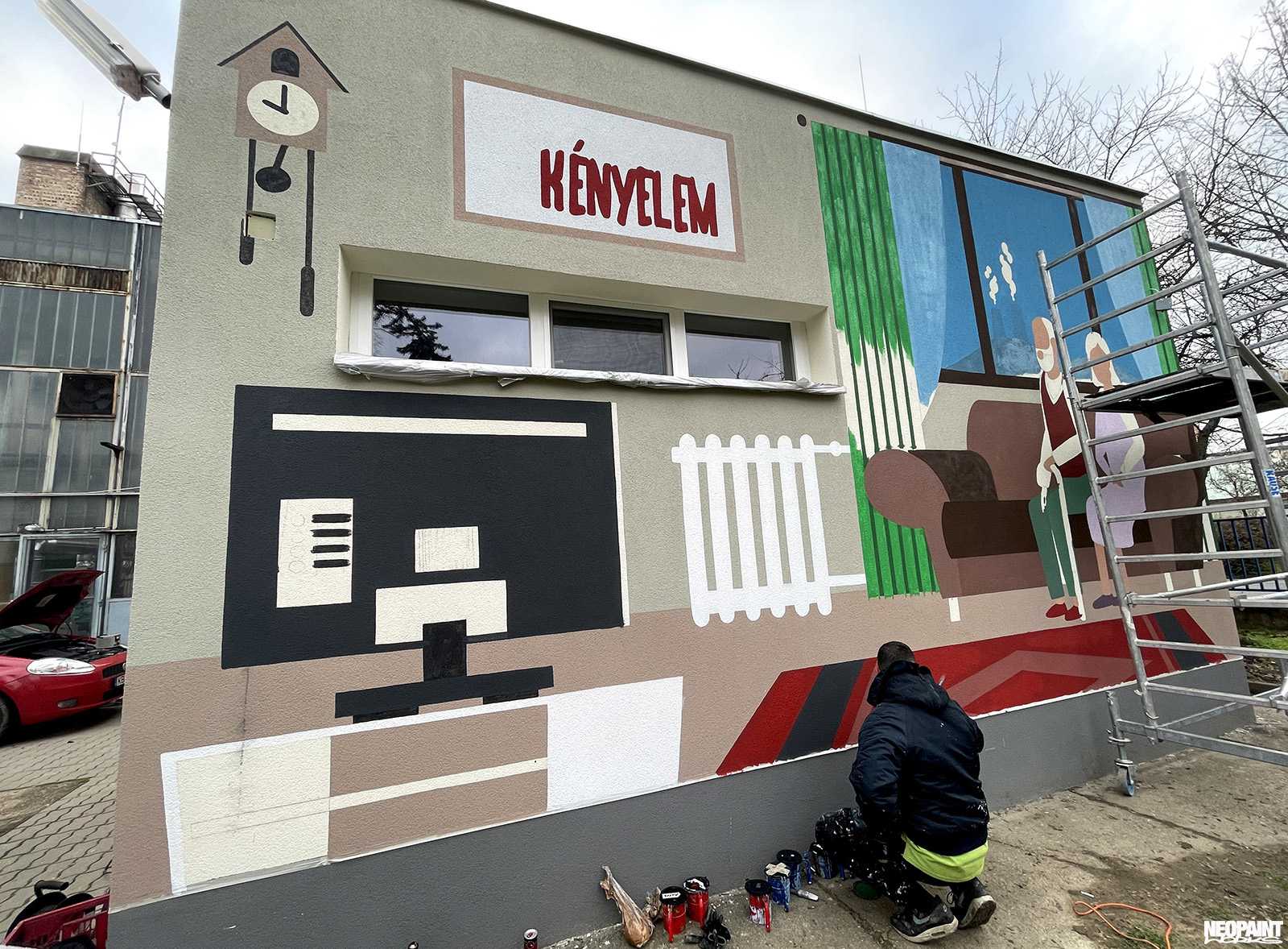 A gödöllői gáztározó egyik épületénék két oldalára készült falfestményeink. A grafikai tervek kapcsán konkrét elképzelése volt a megrendelőnek, melyek figyelembevételével terveztünk. A falfestmények négy nap alatt készültek el a téli hidegben.