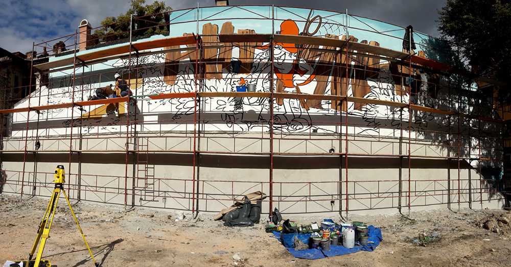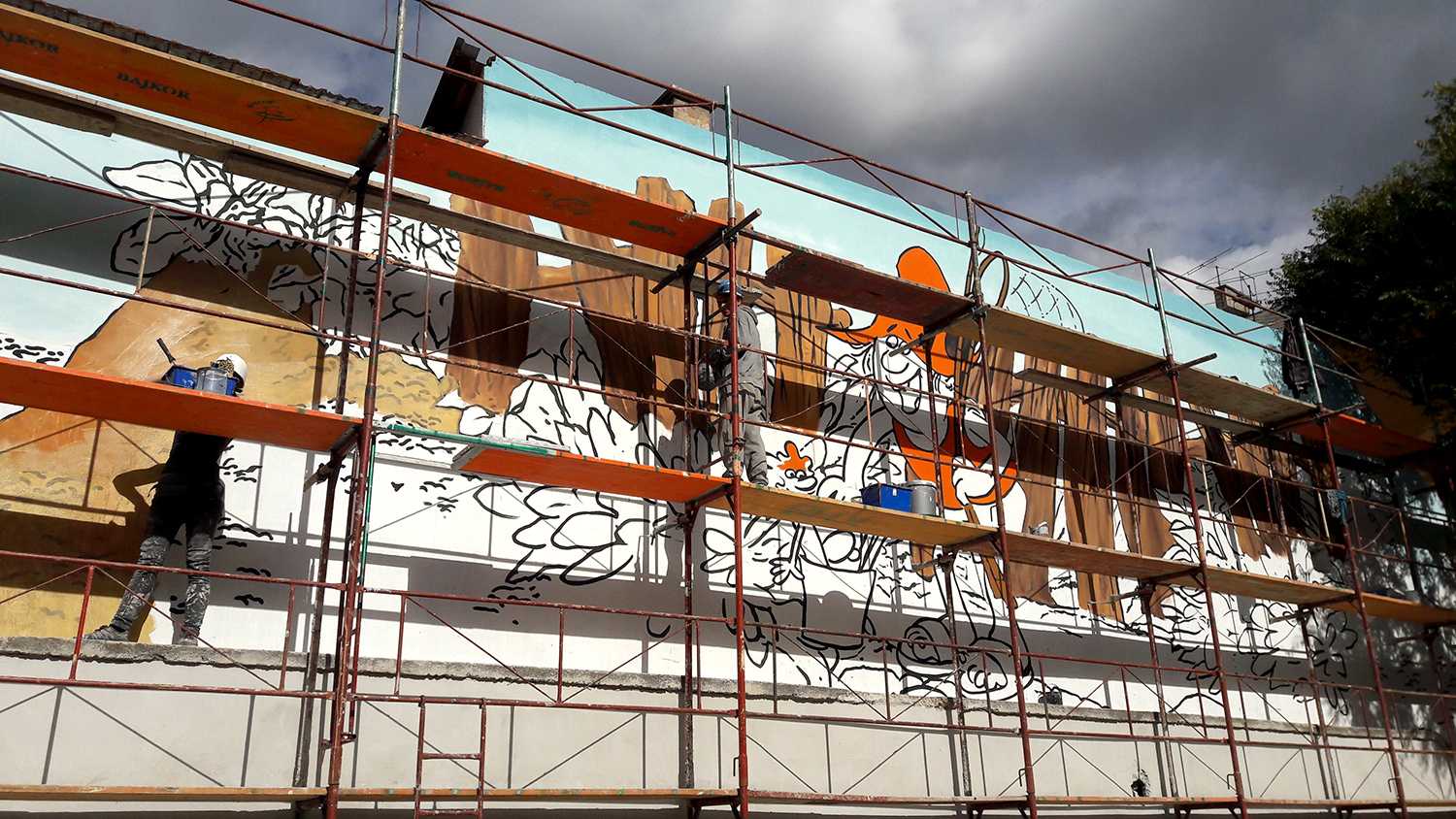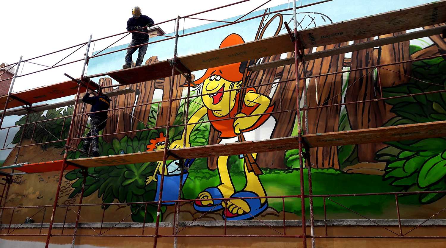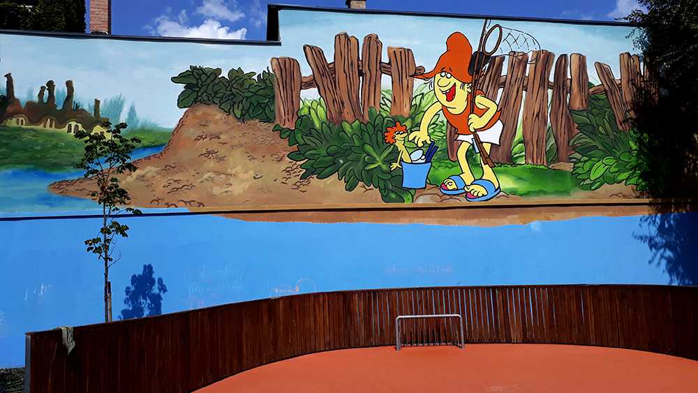 A VIII. kerületi Önkormányzat megbízásból készült el a Ho-Ho-Horgász festmény egy játszótér felújításának alkalmával. Falrajz.