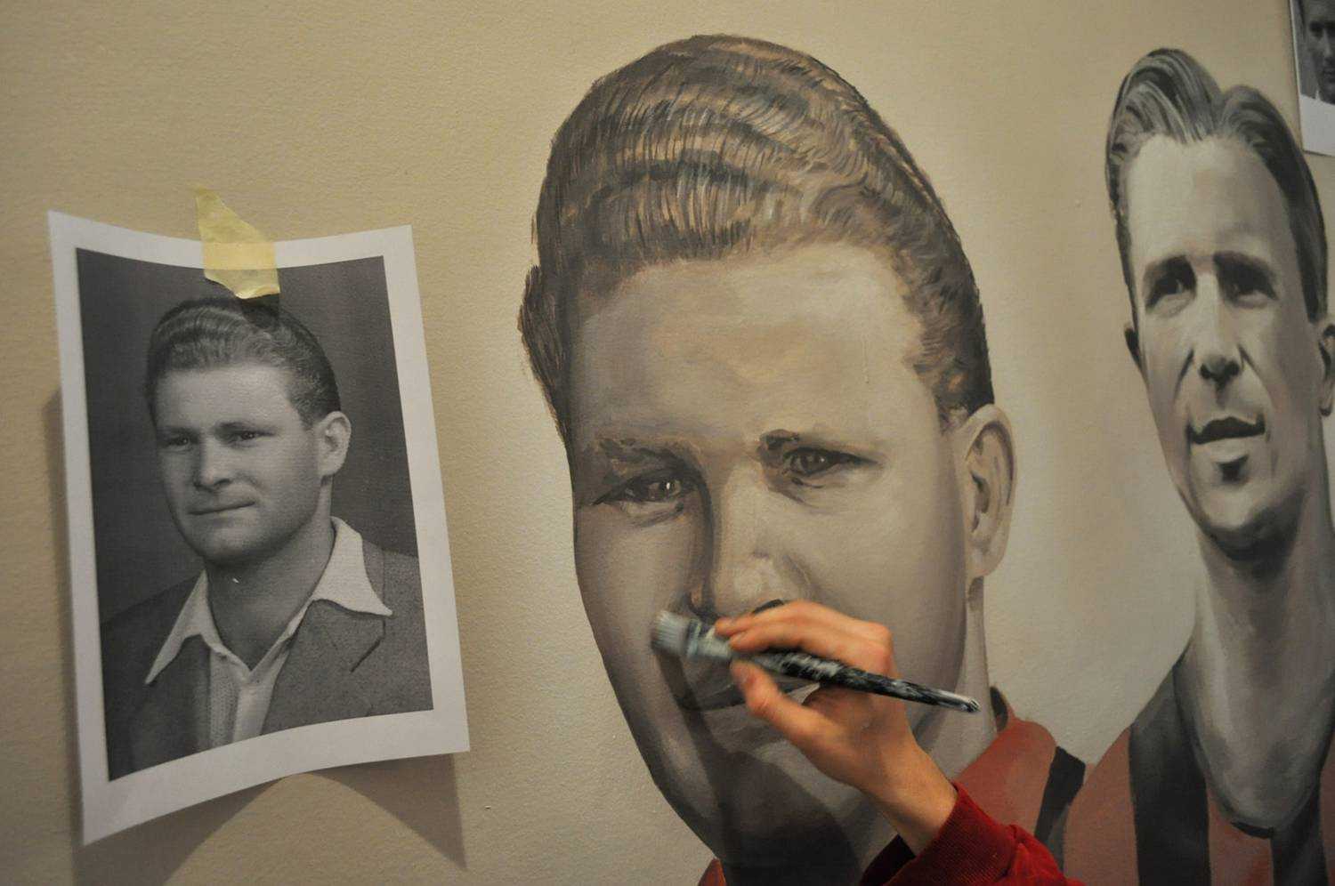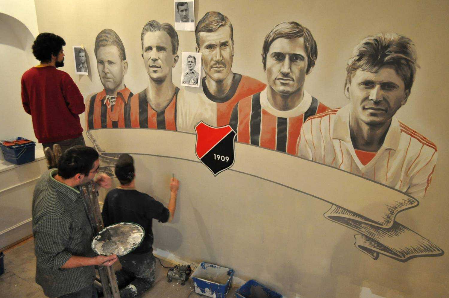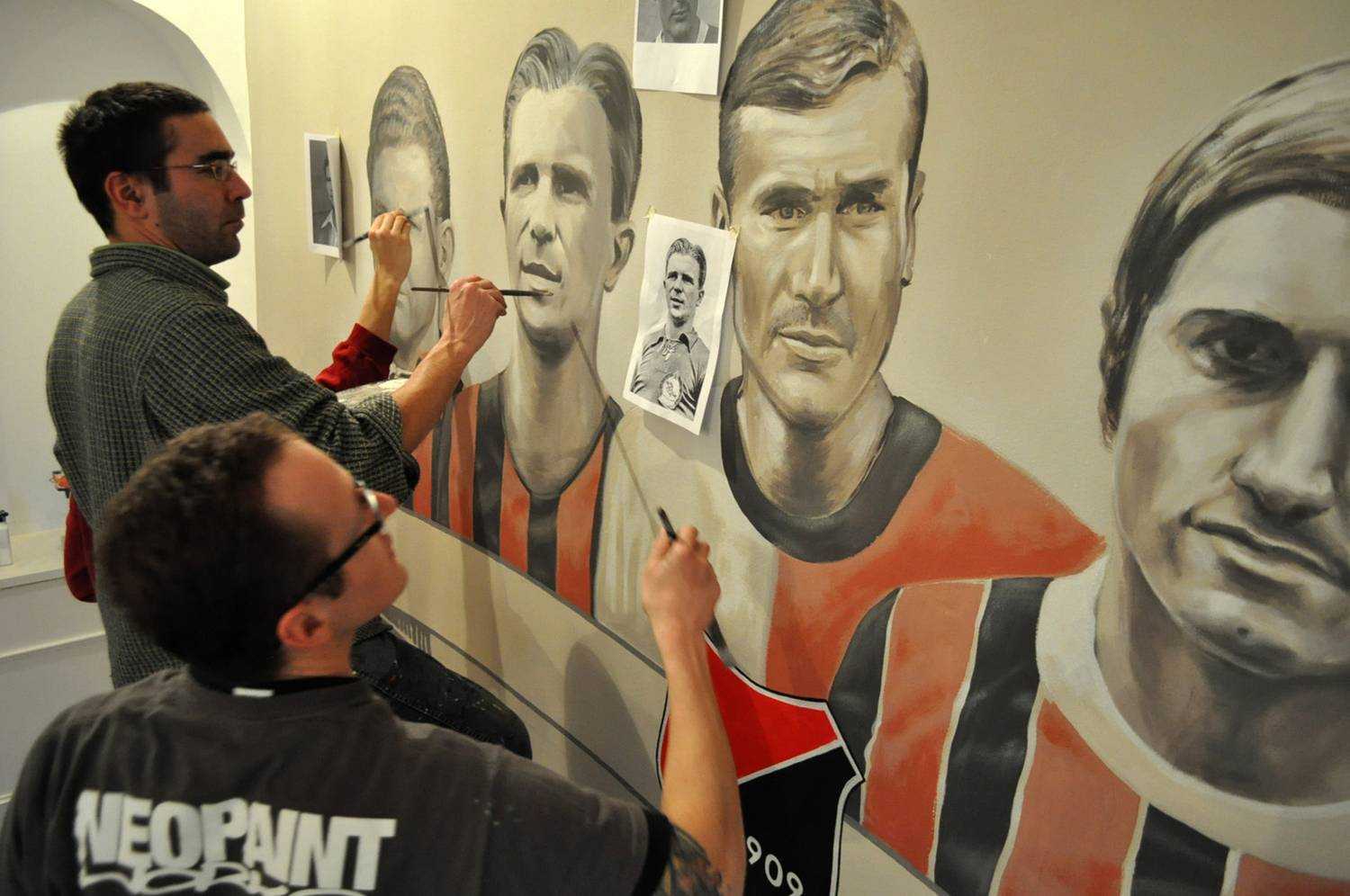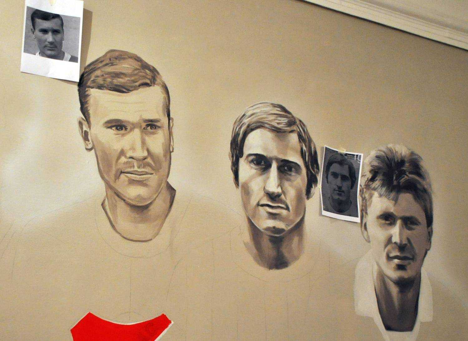 Kispest 1909A Kispesti Futball Ház-ban készült portréképek a csapat legnagyobbjairól. Kézzel festett faldekoráció. Budapest, Kispest, Fő utca 38., 2015