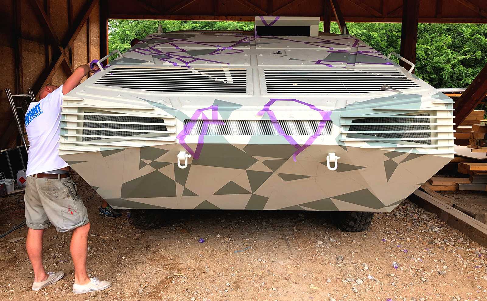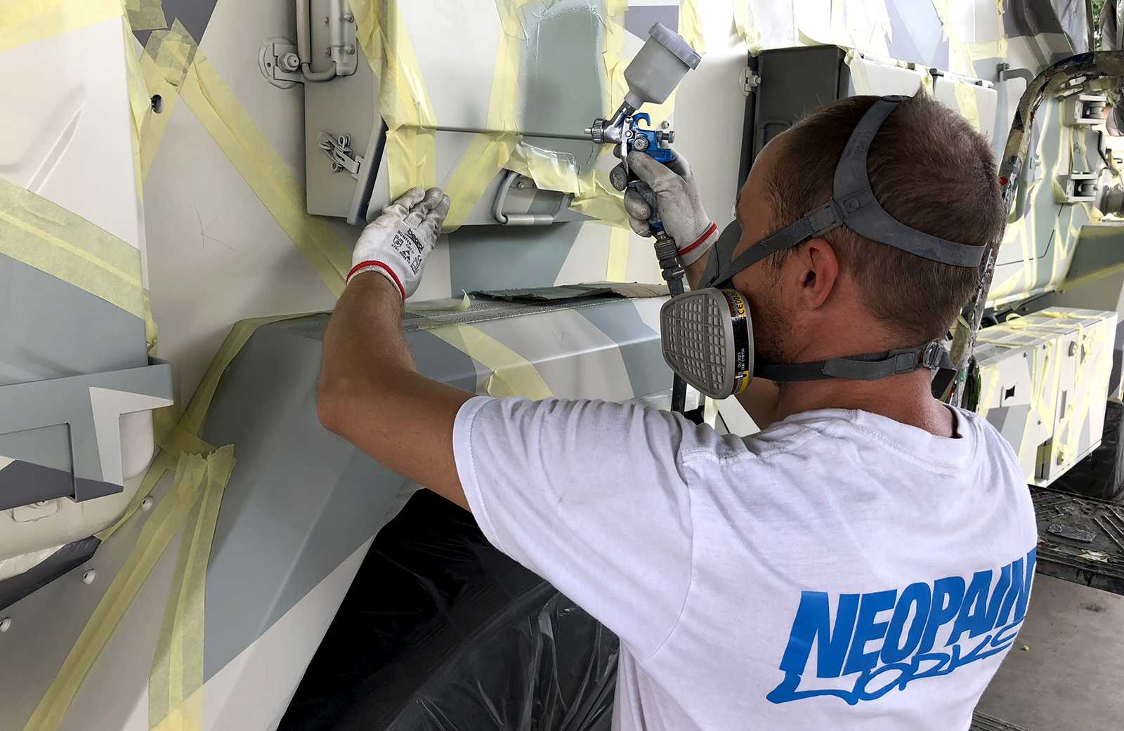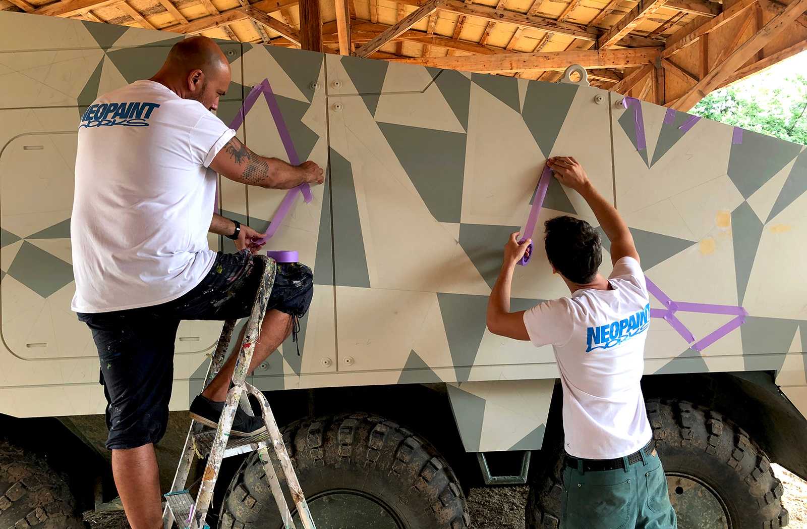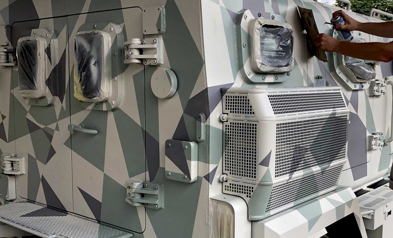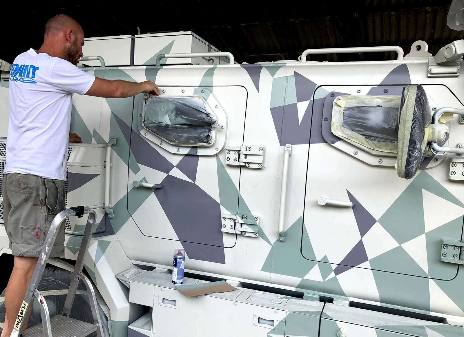Katonai járművekre (Komondor) készült háromszög-camoflage mintázatú díszítőfestés. Az óriásgépek nem bevetésre mennek, csak egy filmes produkcióra.