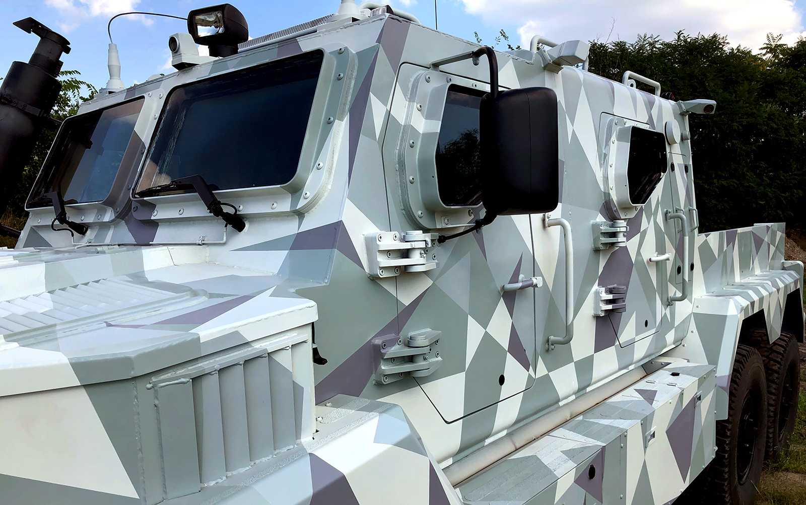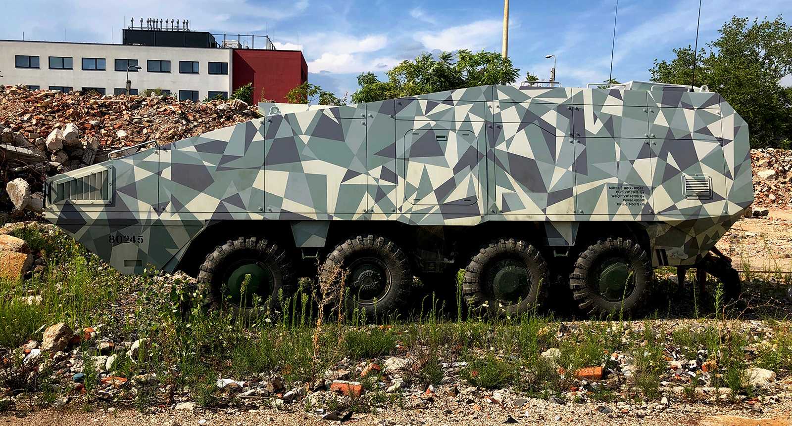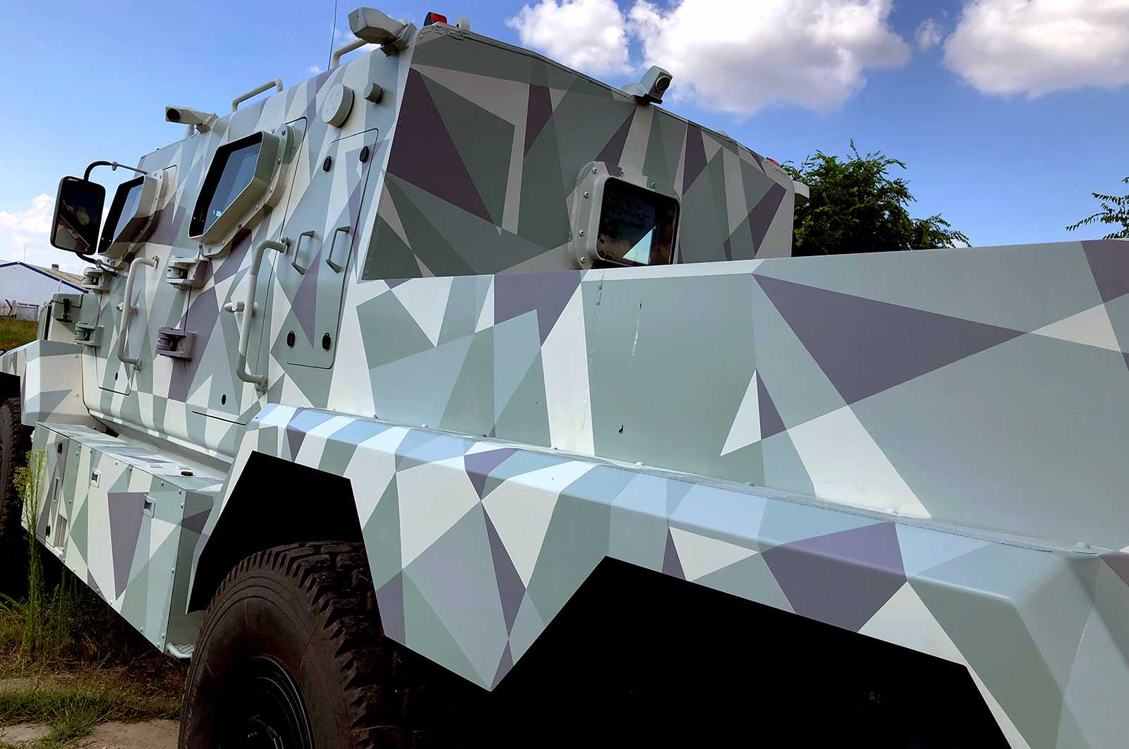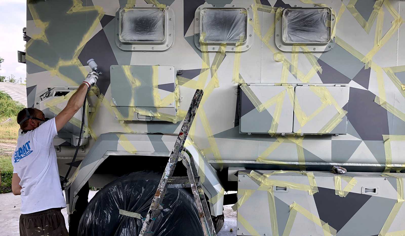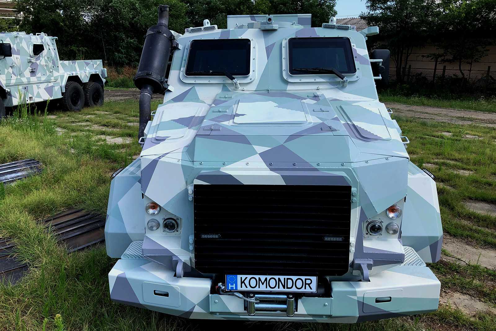 Katonai járművekre (Komondor) készült háromszög-camoflage mintázatú díszítőfestés. Az óriásgépek nem bevetésre mennek, csak egy filmes produkcióra.