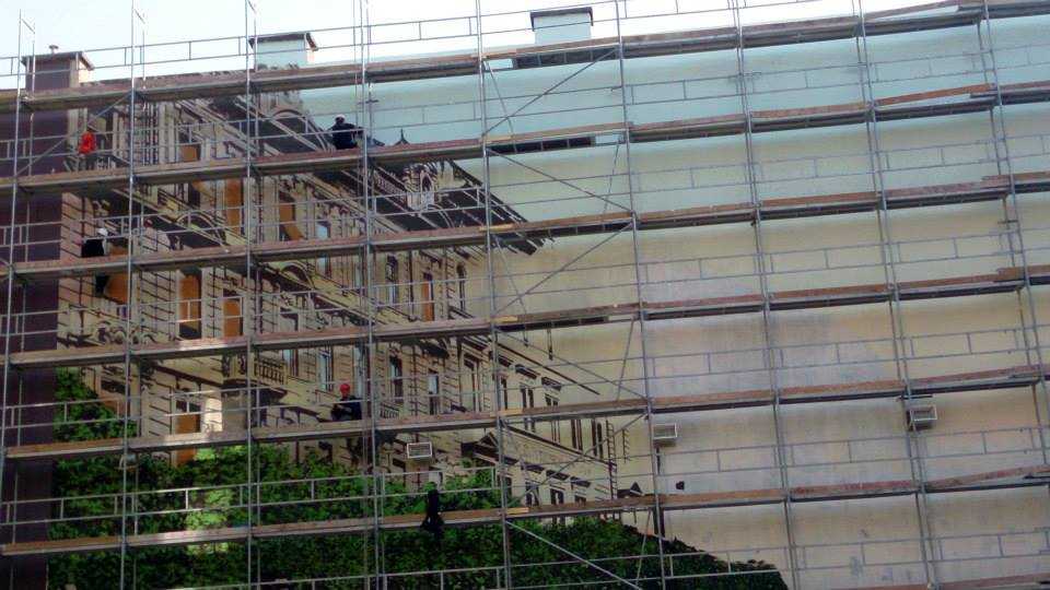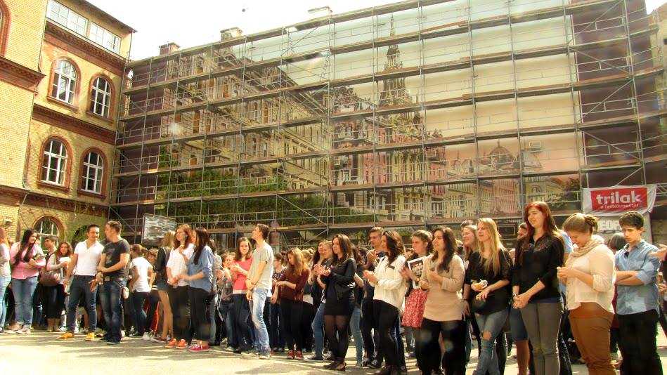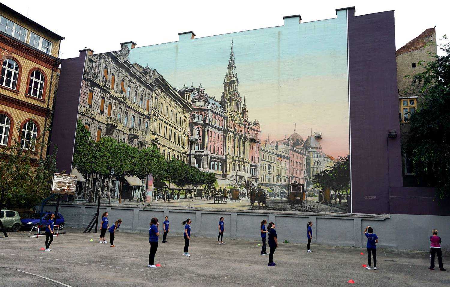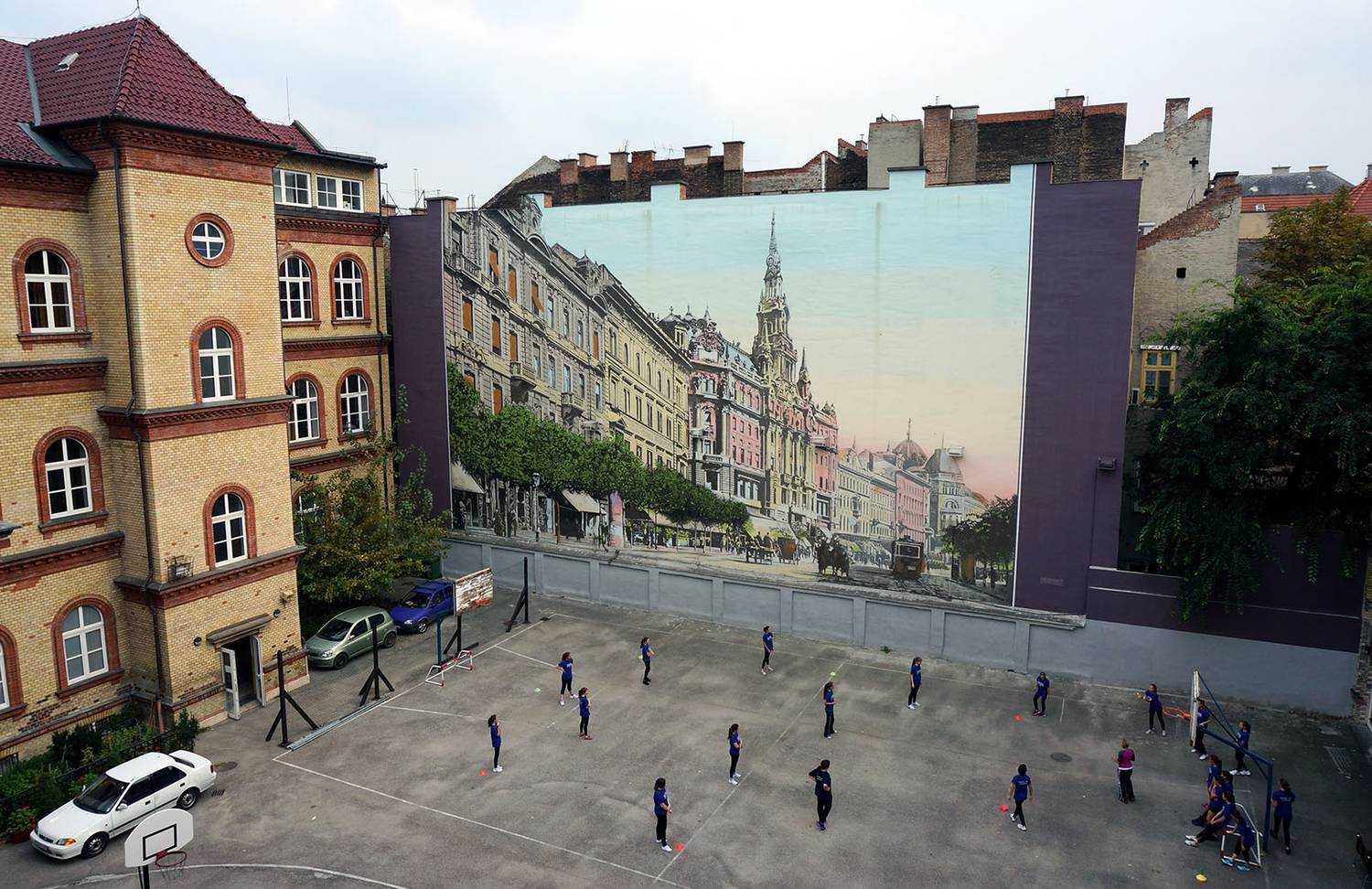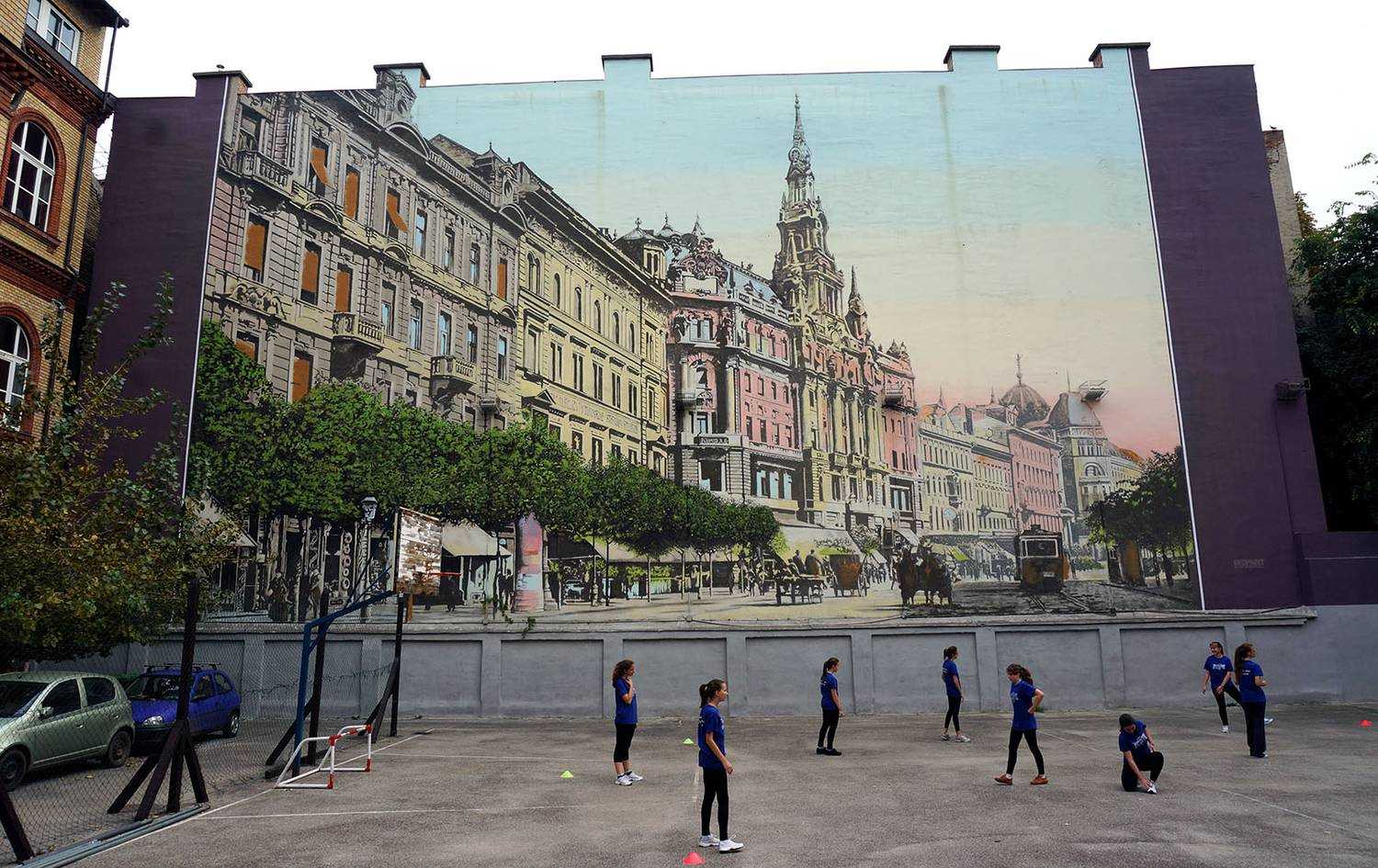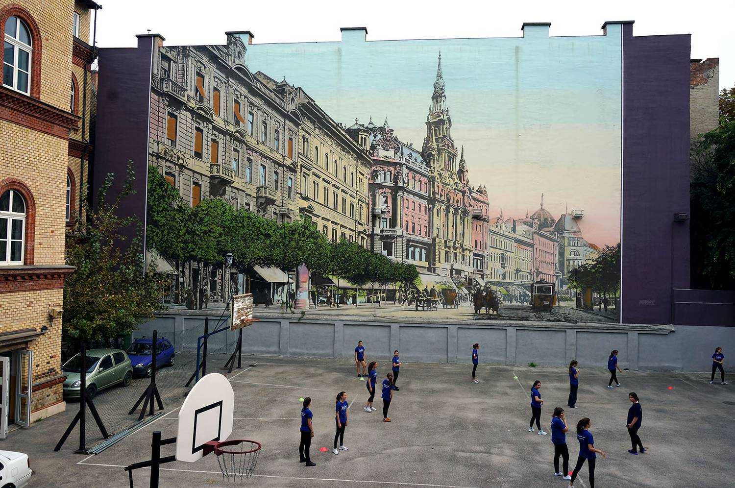 A belvárosi Madách Gimnázium belső udvarába készült, a századfordulót idéző tűzfal dekoráció. A tervezésnél fontos volt, hogy olyan képet válasszunk amely az iskolához, és annak környékéhez köthető. A kép az 1900-as évek Nagy Körútját ábrázolja, annak az utcának a sarkáról, ahol az intézmény található. A festmény egy aukción vásárolt, Svédországból megküldött képeslap alapján készült, melyet az iskola történelemtanára kutatott fel. Ezúton is köszönjük neki!