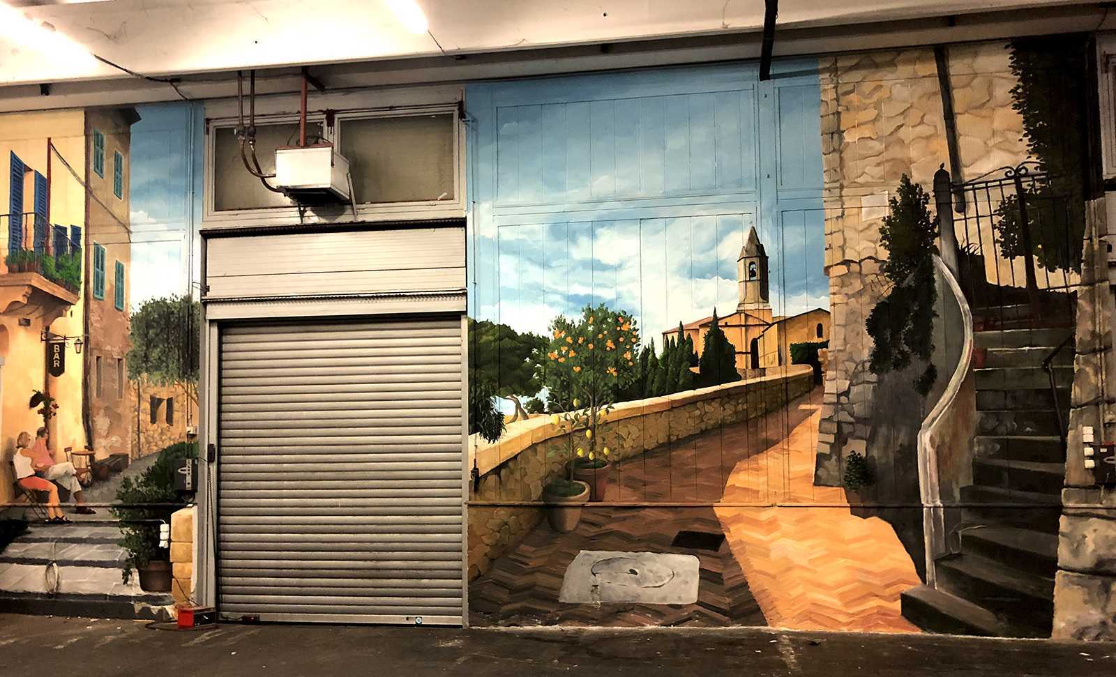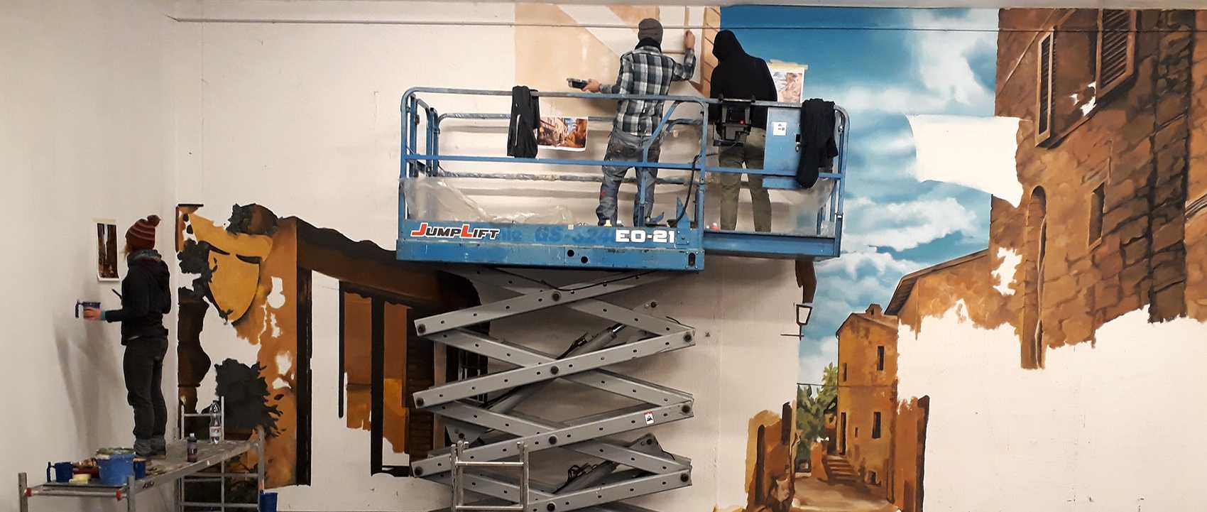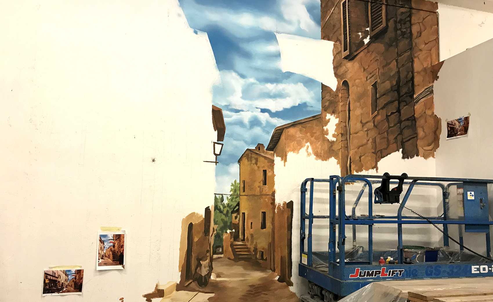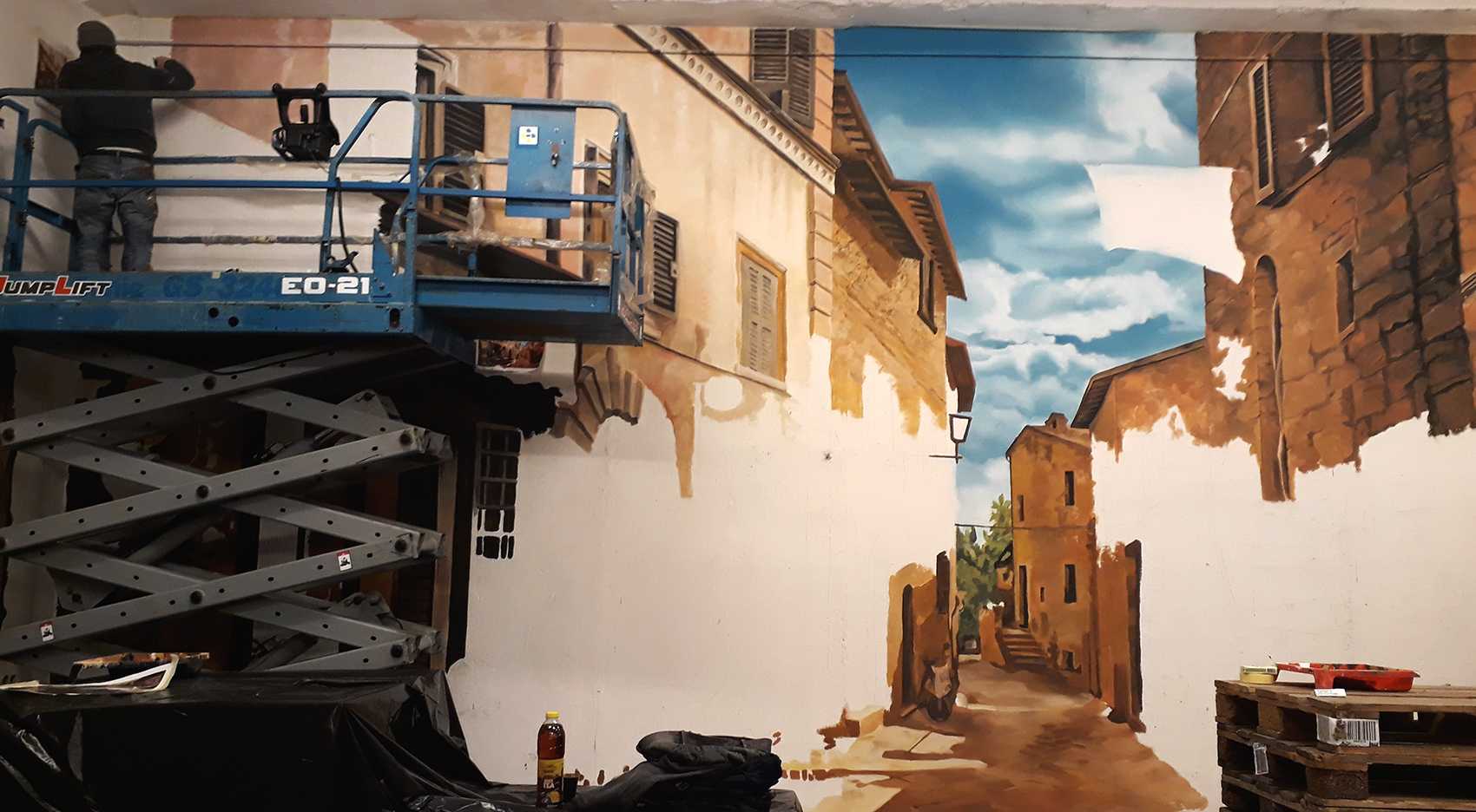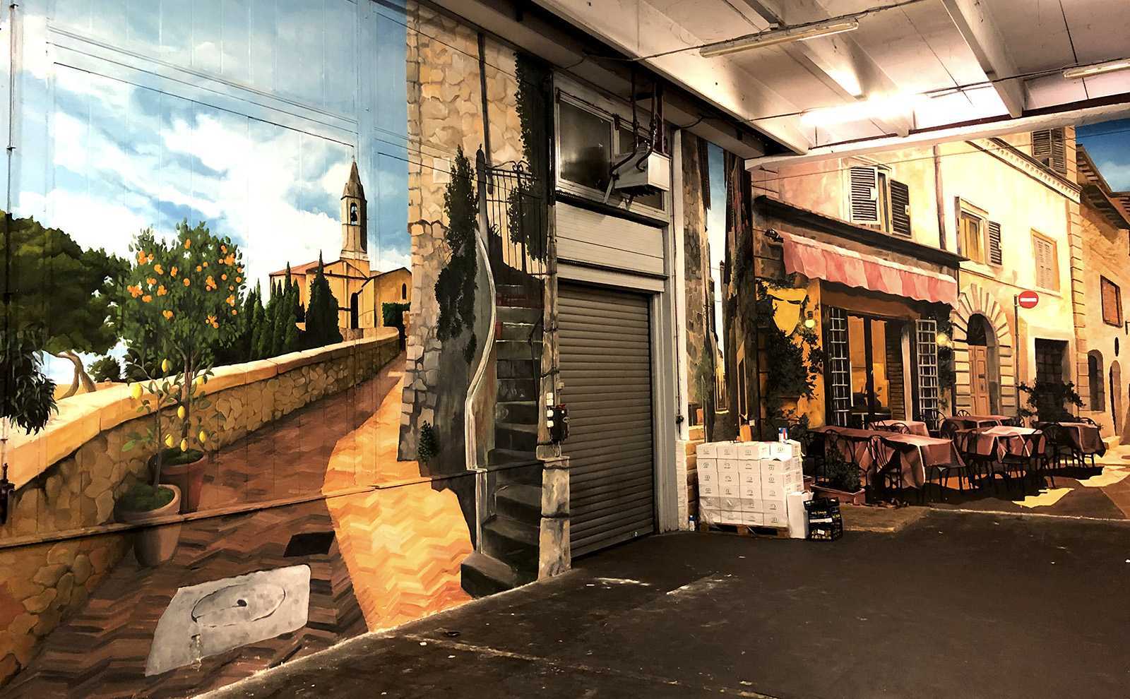 Raktárépületben készült, olasz kisvárosi utcát ábrázoló fal freskó. A 150 m2-es festmény 7 nap alatt készült el.