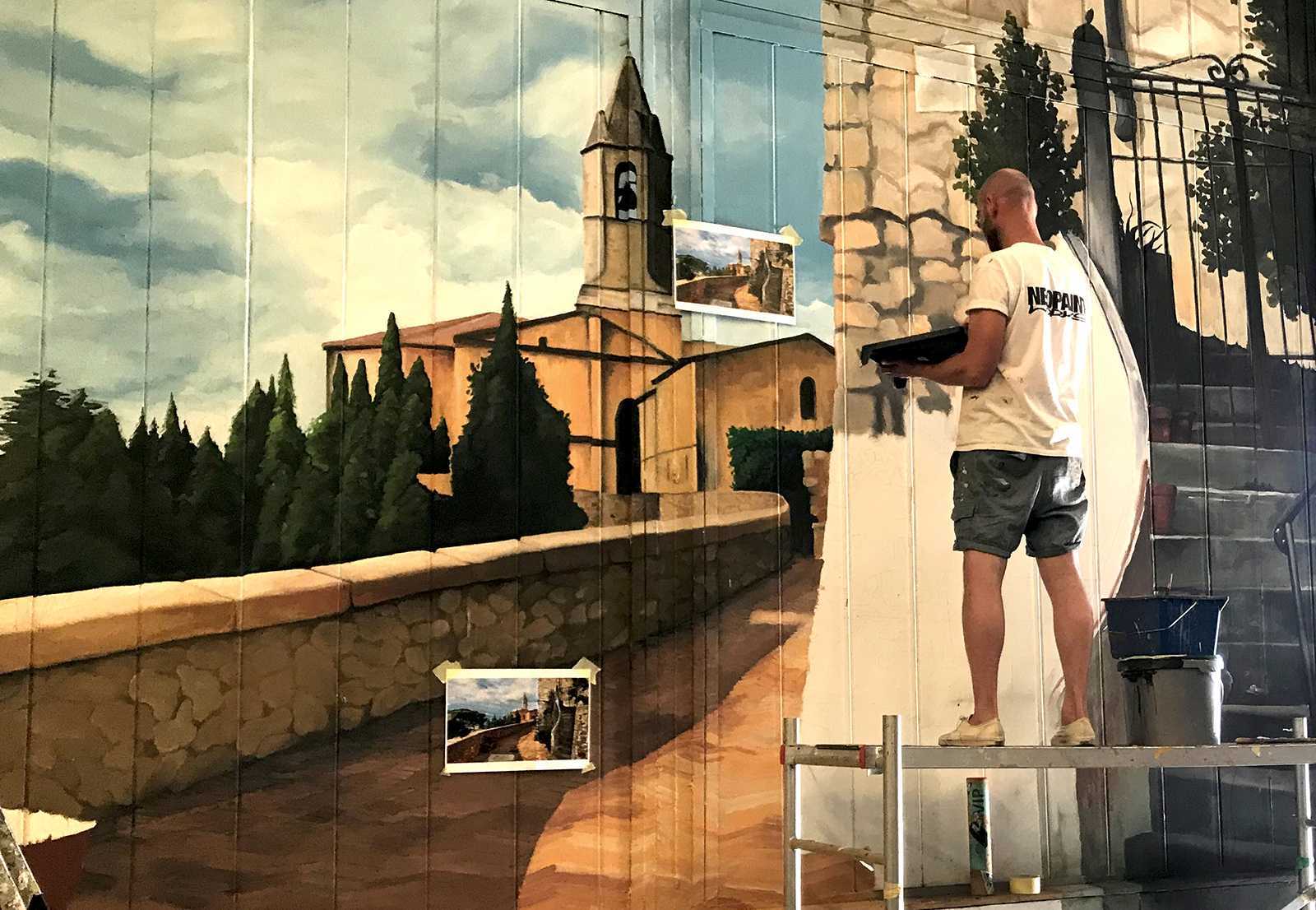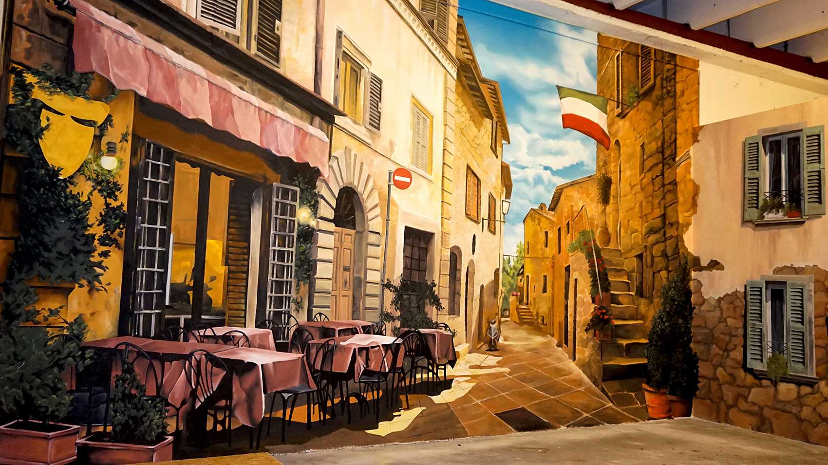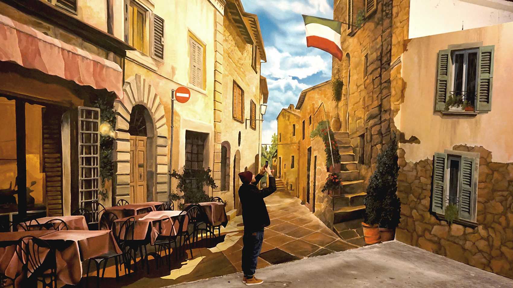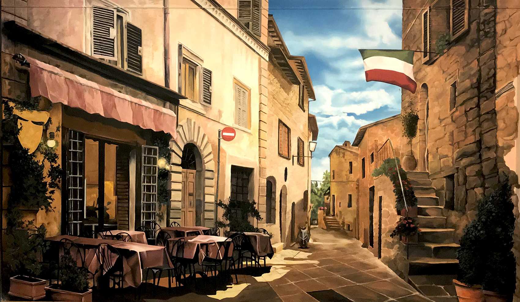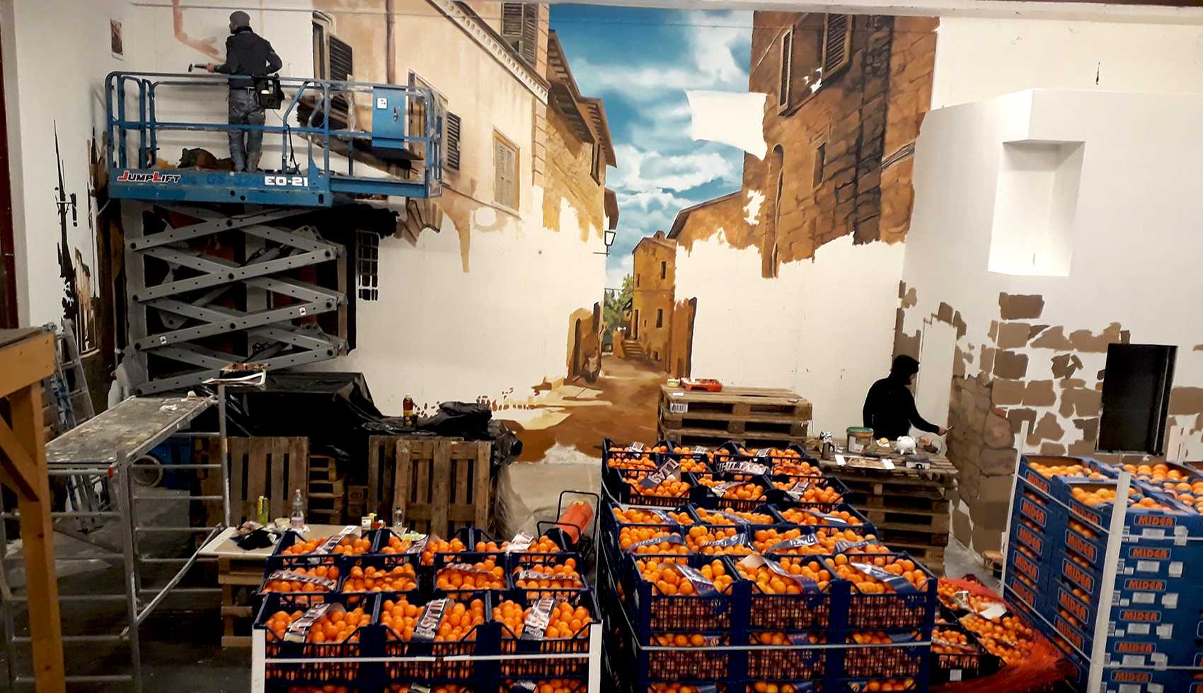 Raktárépületben készült, olasz kisvárosi utcát ábrázoló fal freskó. A 150 m2-es festmény 7 nap alatt készült el.