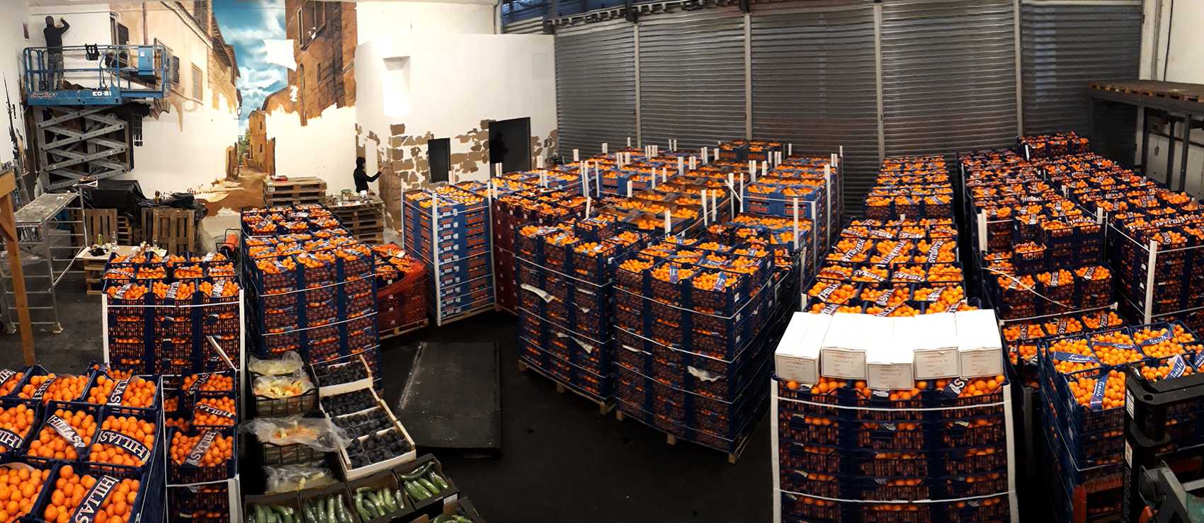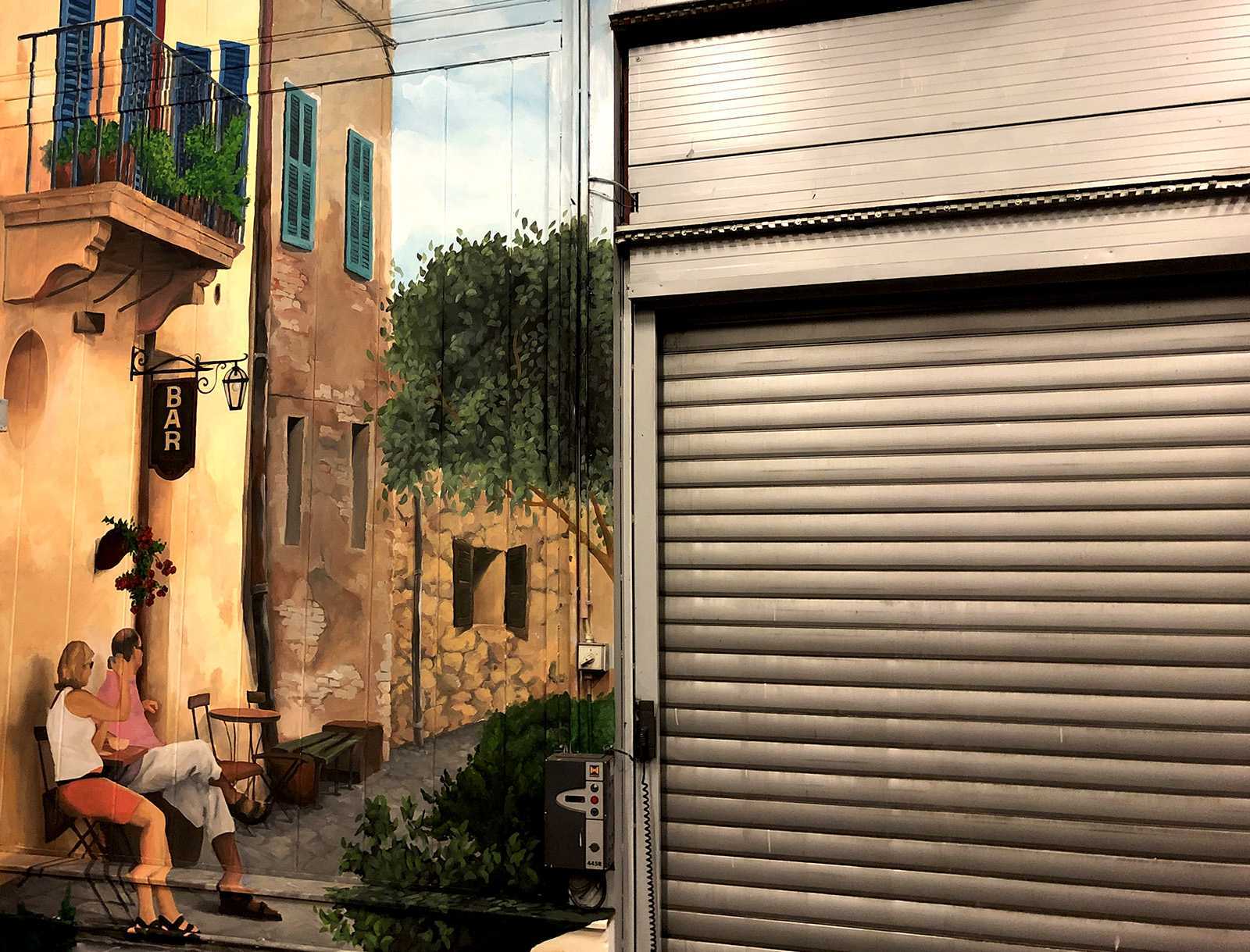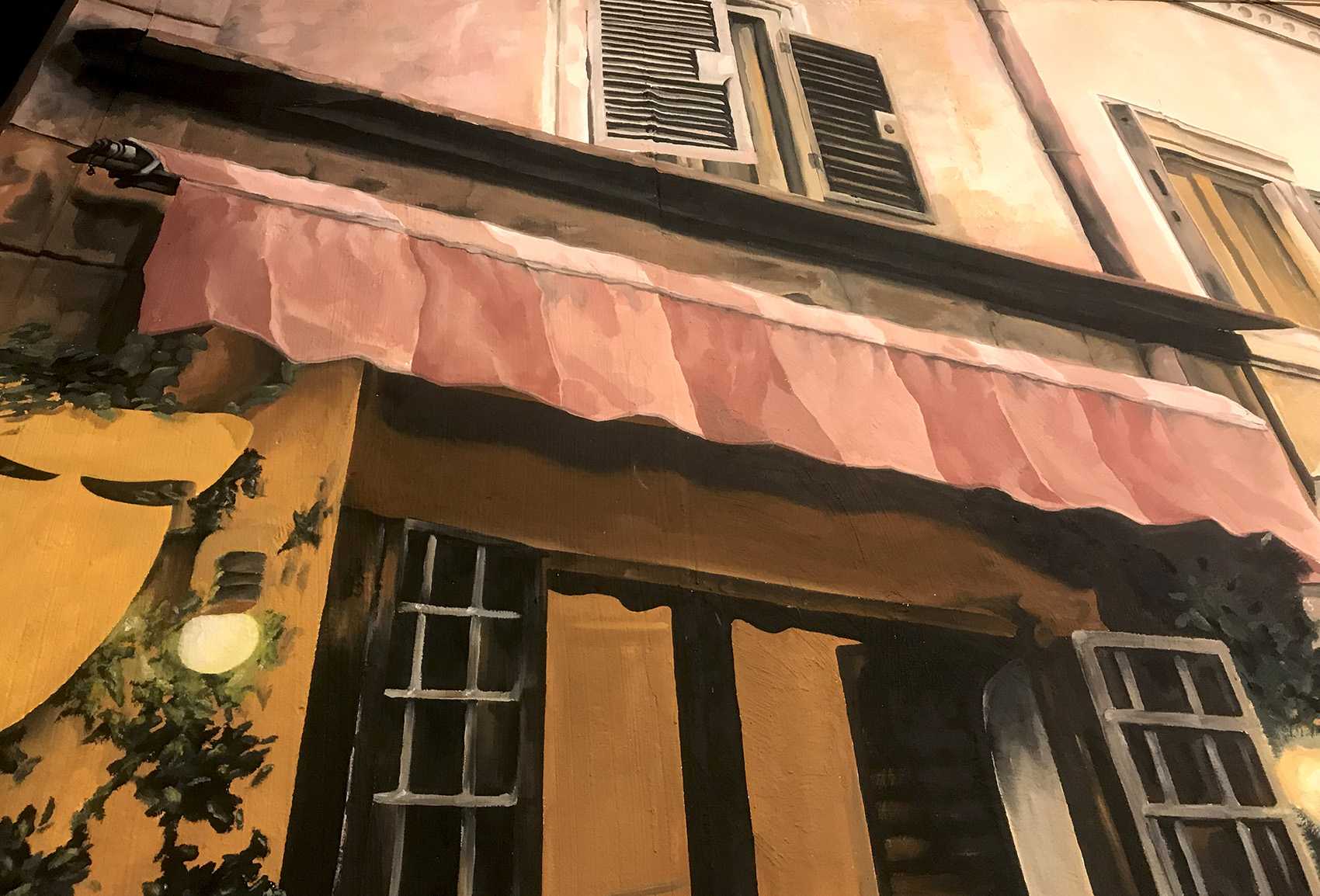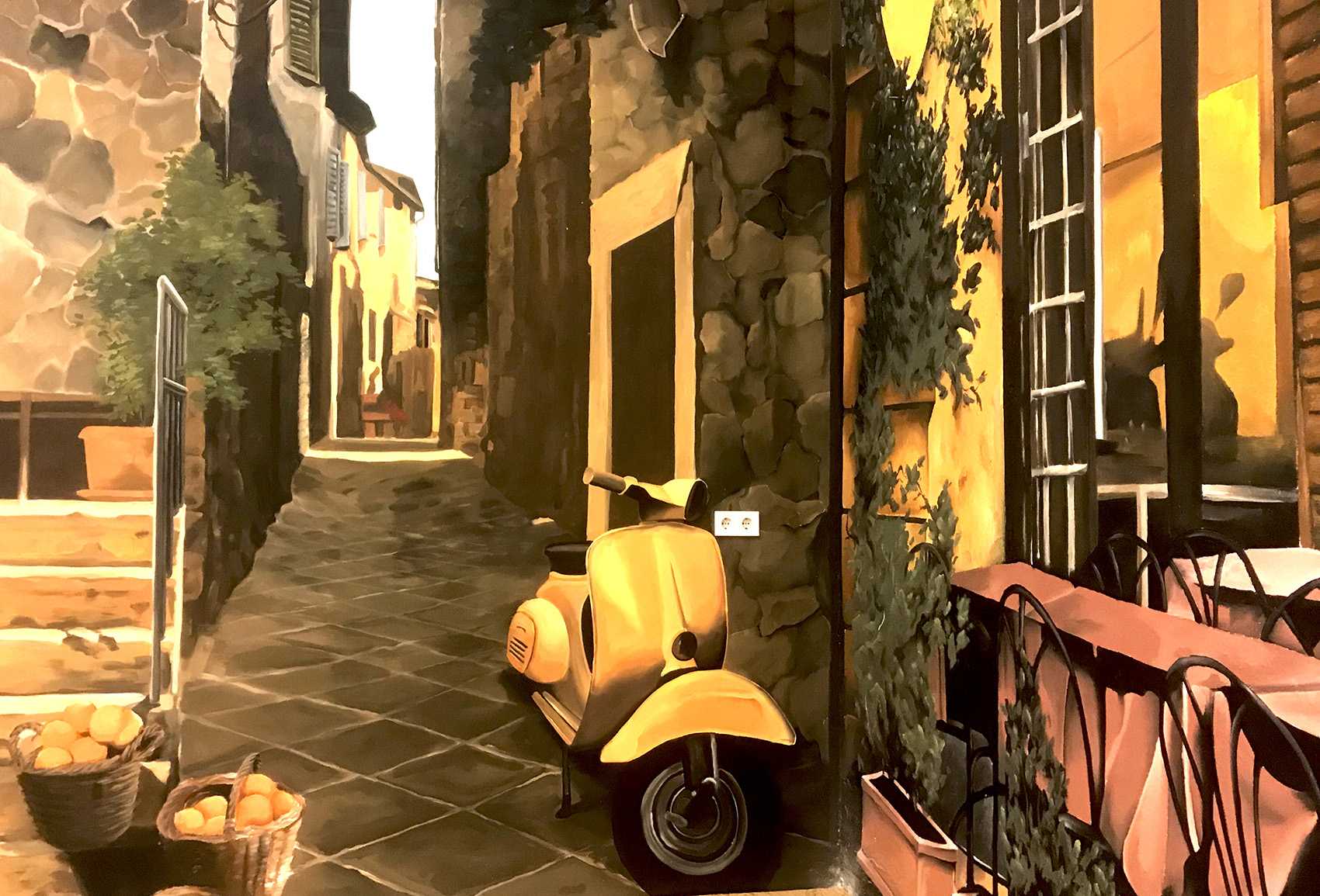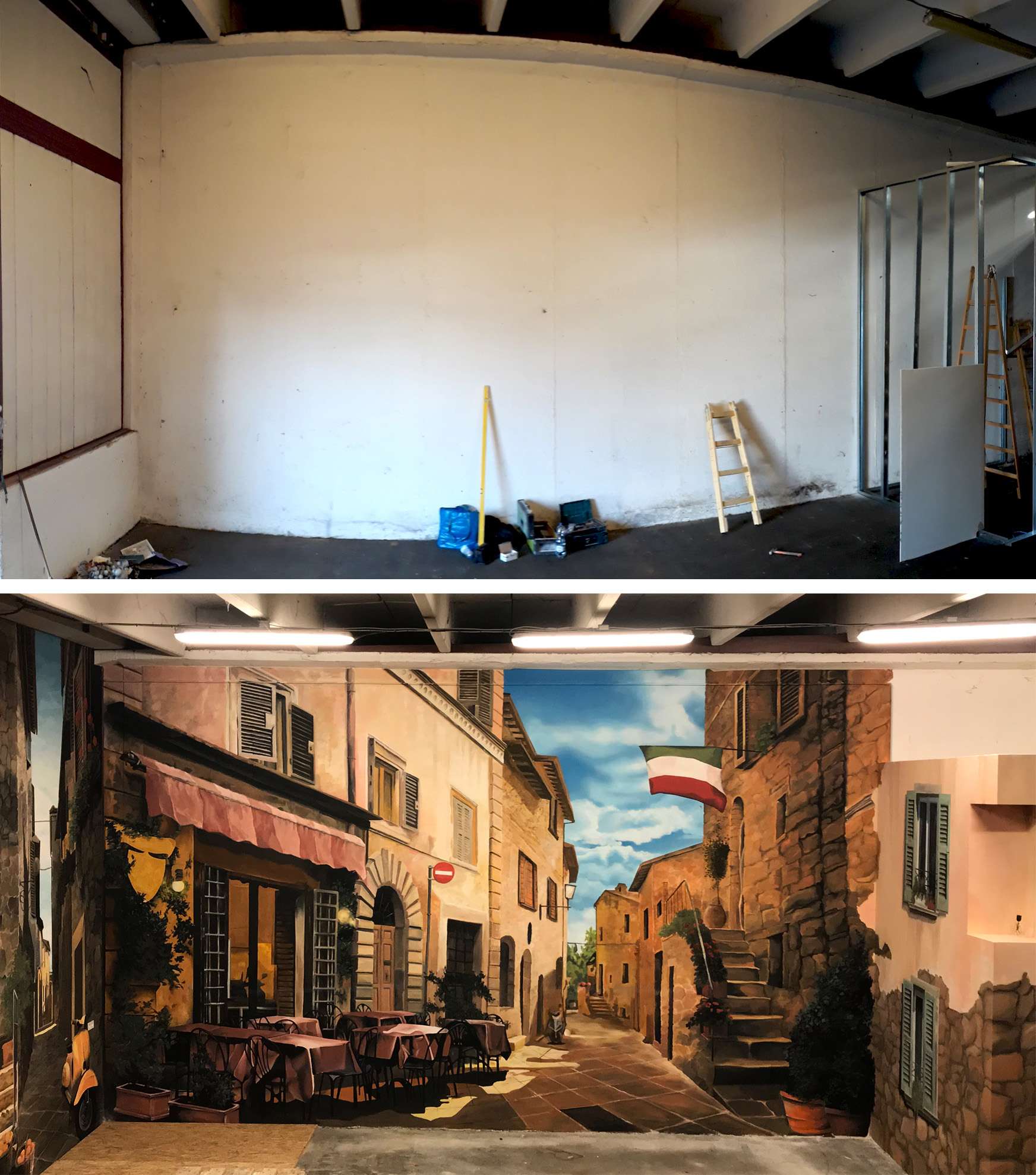 Raktárépületben készült, olasz kisvárosi utcát ábrázoló fal freskó. A 150 m2-es festmény 7 nap alatt készült el.