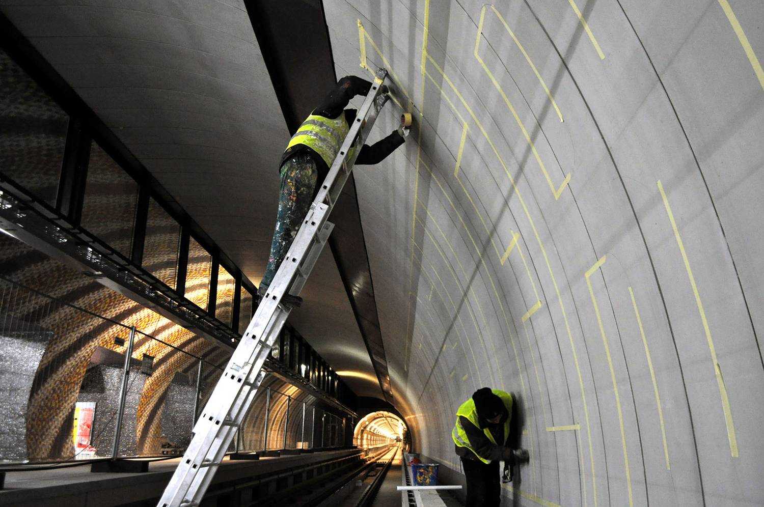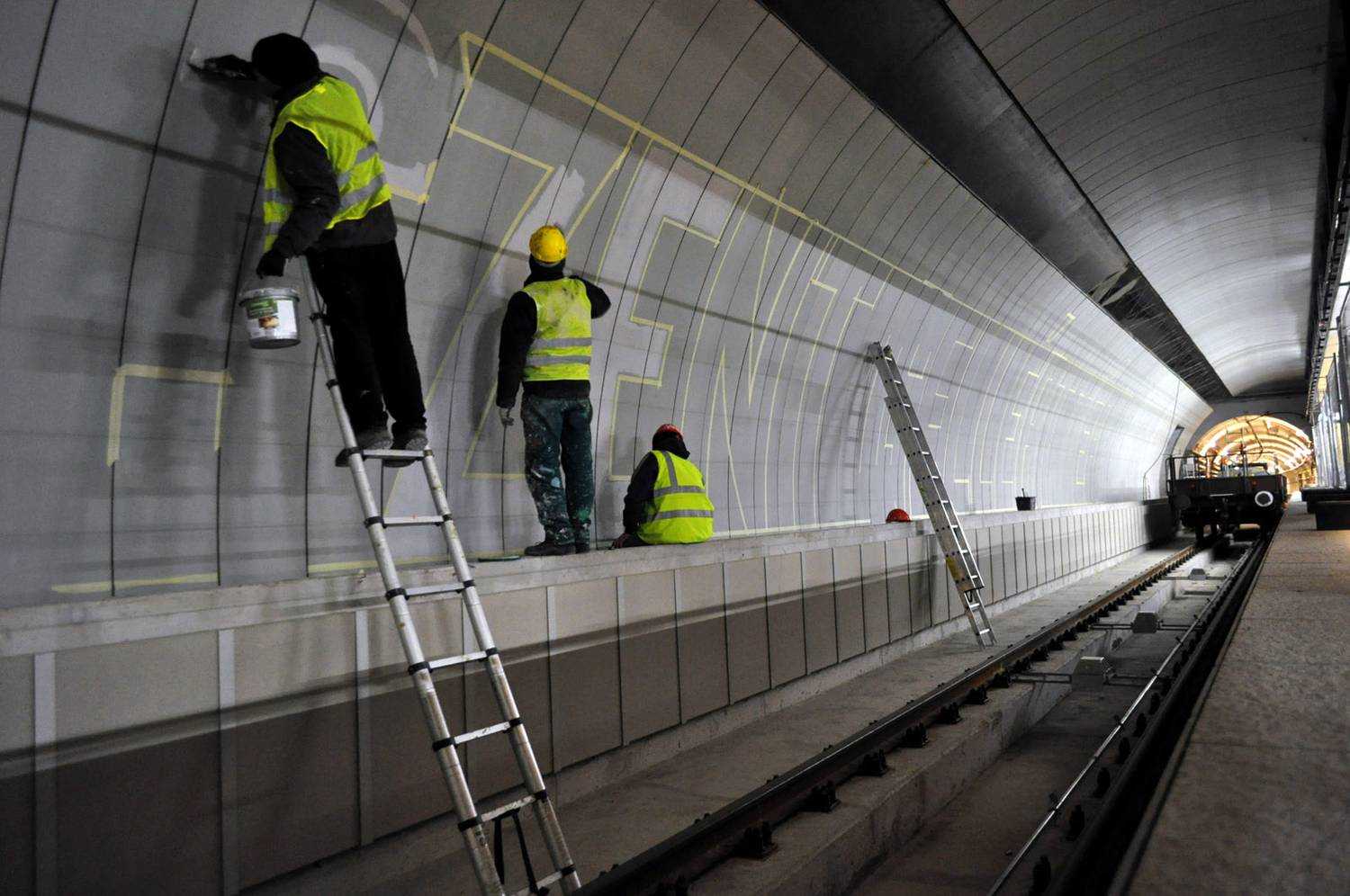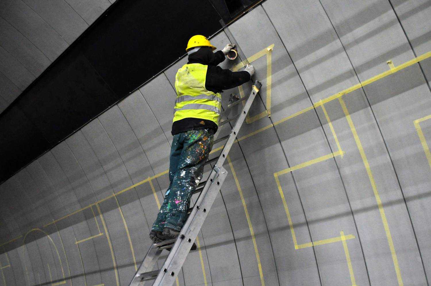 A 4-es metró Gellért téri megállójának dekorfestése. Nagyméretű betúfestés.