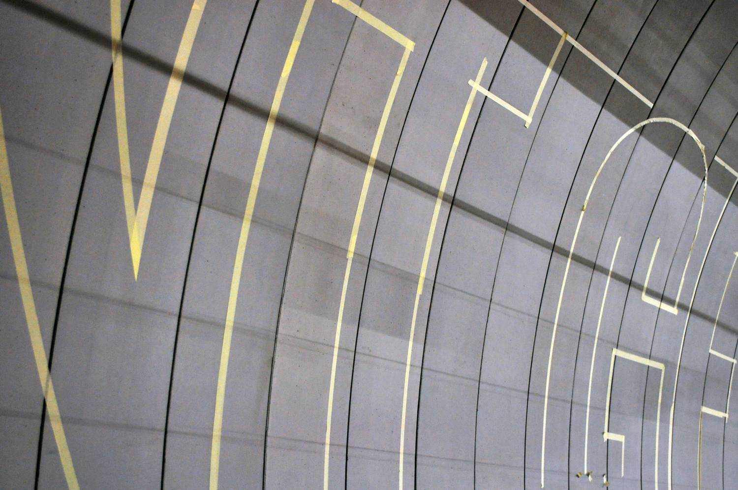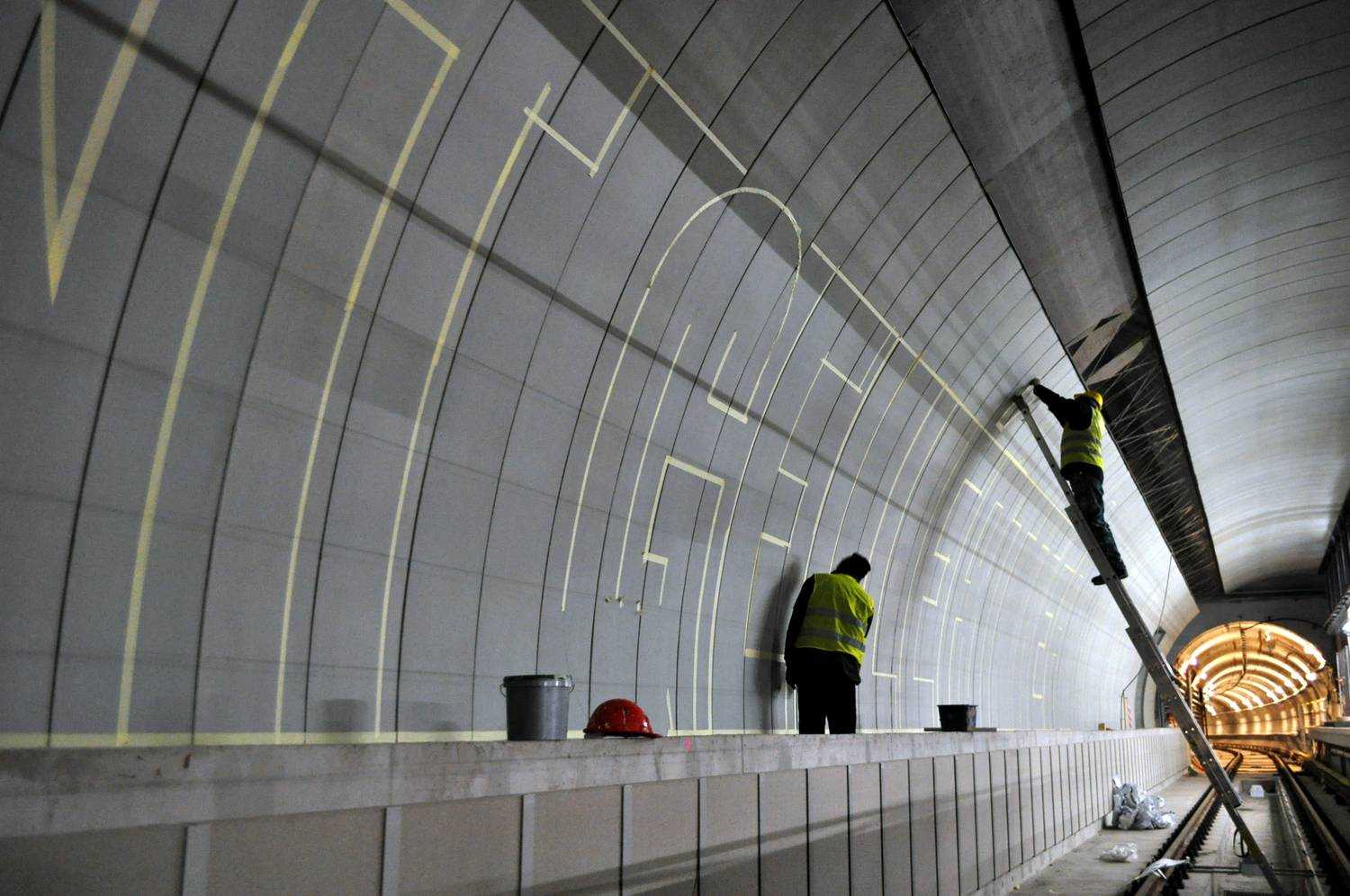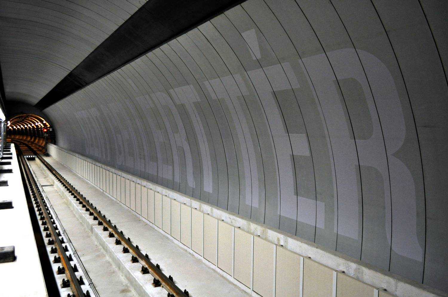 A 4-es metró Gellért téri megállójának dekorfestése. Nagyméretű betúfestés.