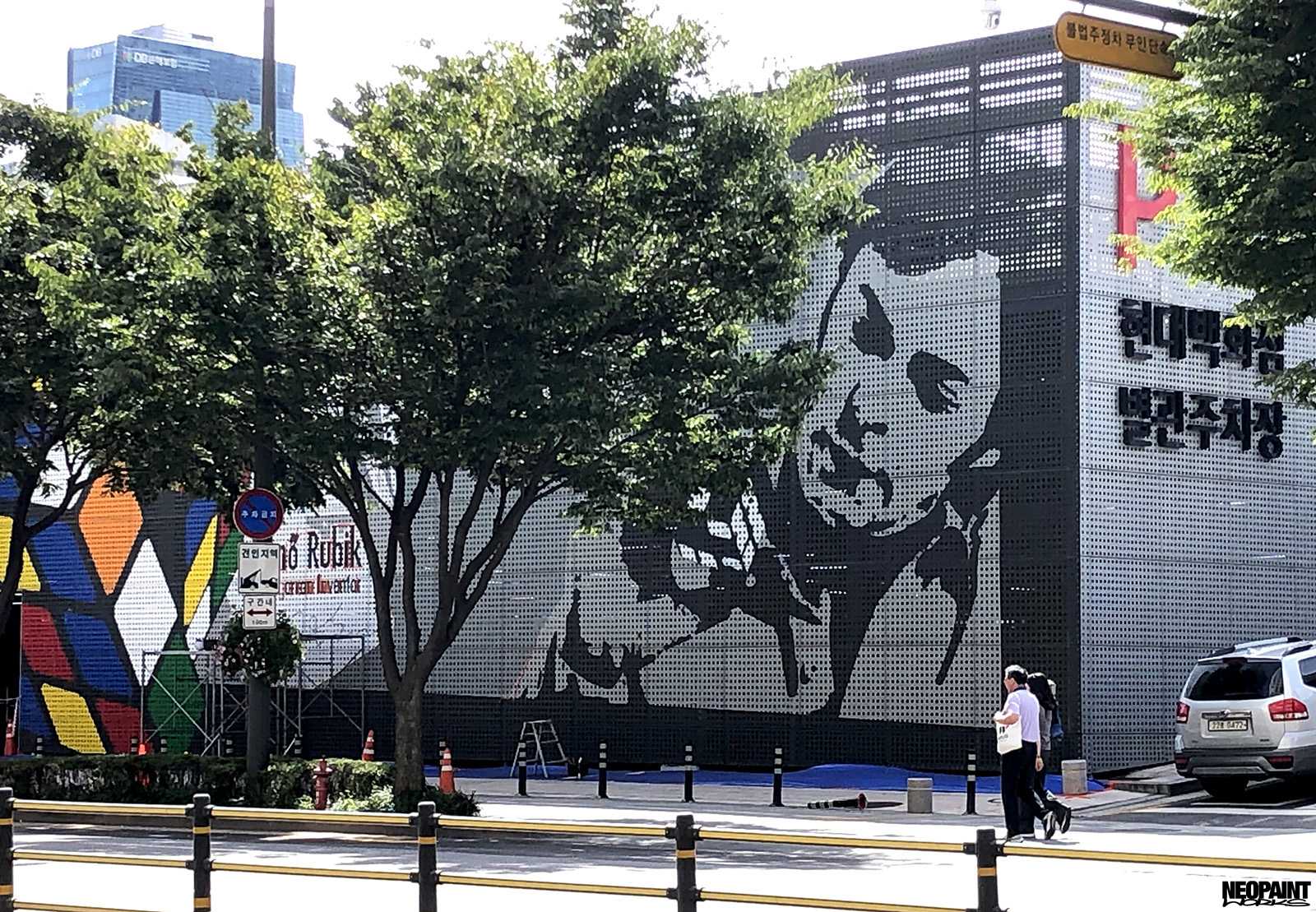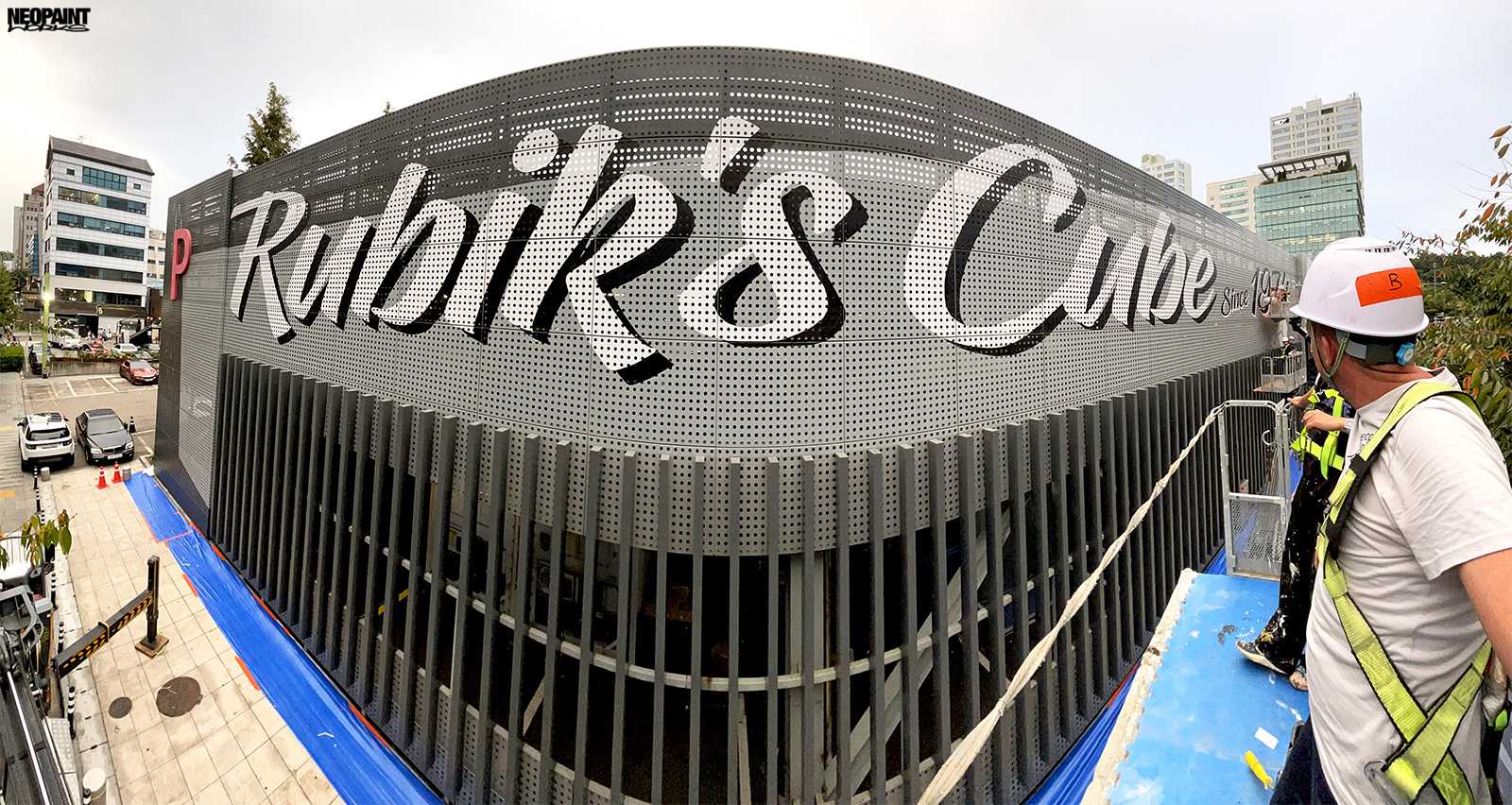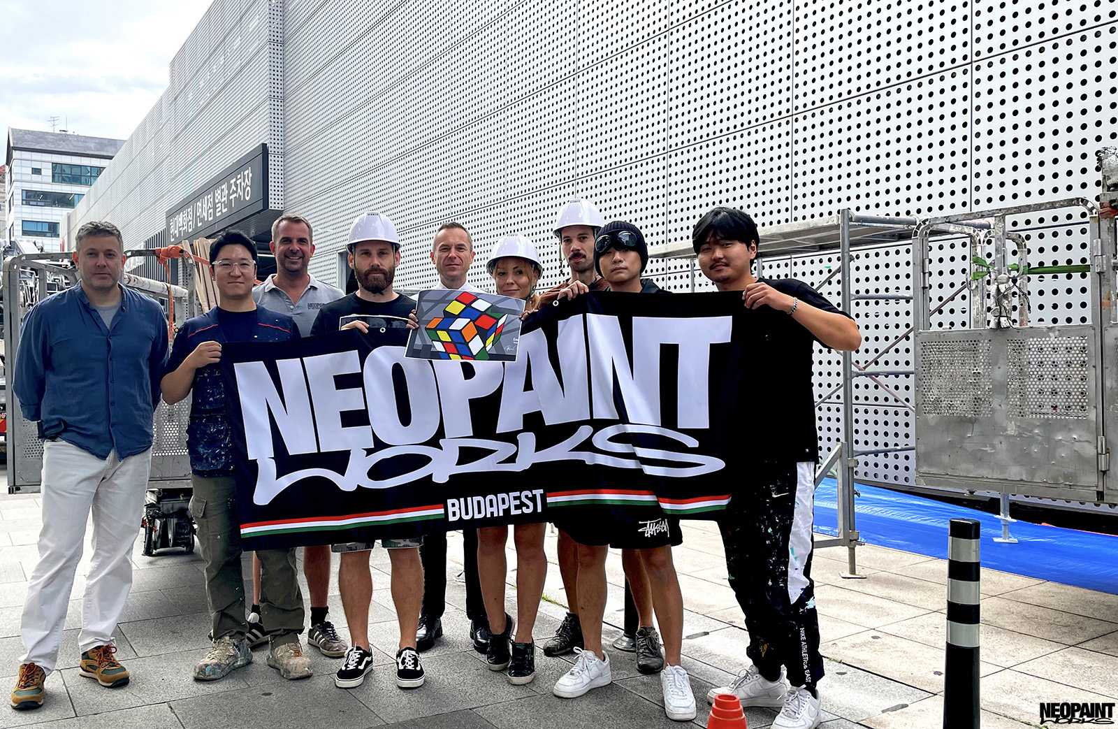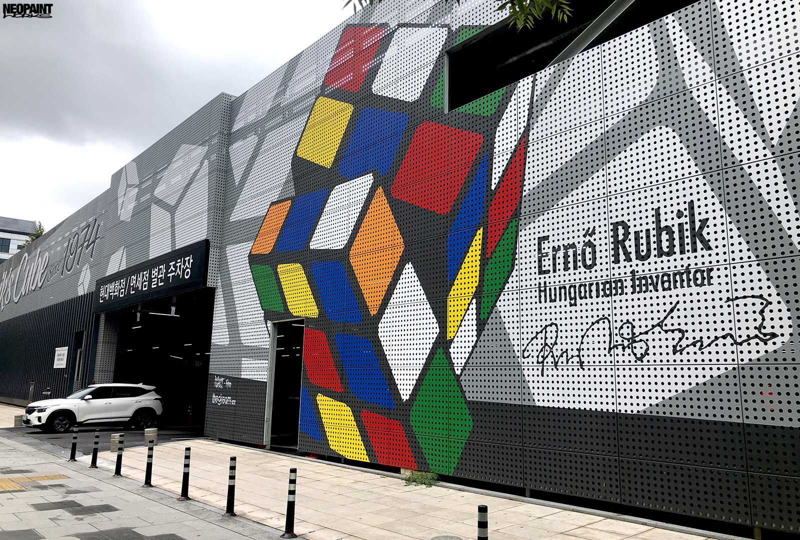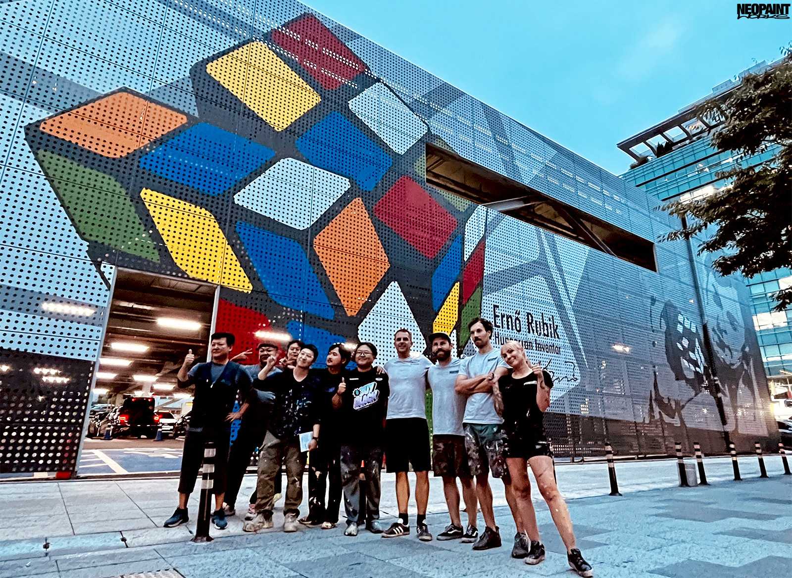 Dél-Korea fővárosába, Szöulba kaptunk meghívást a Magyar Kulturális Központtól (Liszt Intézet) valamint a Koreai Kulturális Minisztériumtól (Kofice) abból a célból, hogy készítsünk egy Rubik-kockát népszerűsítő falfestményt a város kereskedelmi városrészébe, a Gang Nam negyedbe. A 80 méter hosszú és 10 méter magas fém felületen a kocka és annak elnevezése mellett megjelenítettük Rubik Ernőt is, ahogy találmányát a kezében tartja. A grafikát mi terveztük az előzetesen leegyeztetett elképzelések és igények alapján. A teljes kivitelezés 6 napot vett igénybe, amelyben 3 koreai festő is segítségünkre volt. A monumentális utcai festmény a jövőre esedékes Rubik jubileumi évre készült, amikor is Rubik Ernő 80, a kocka pedig 50 évesek lesznek.