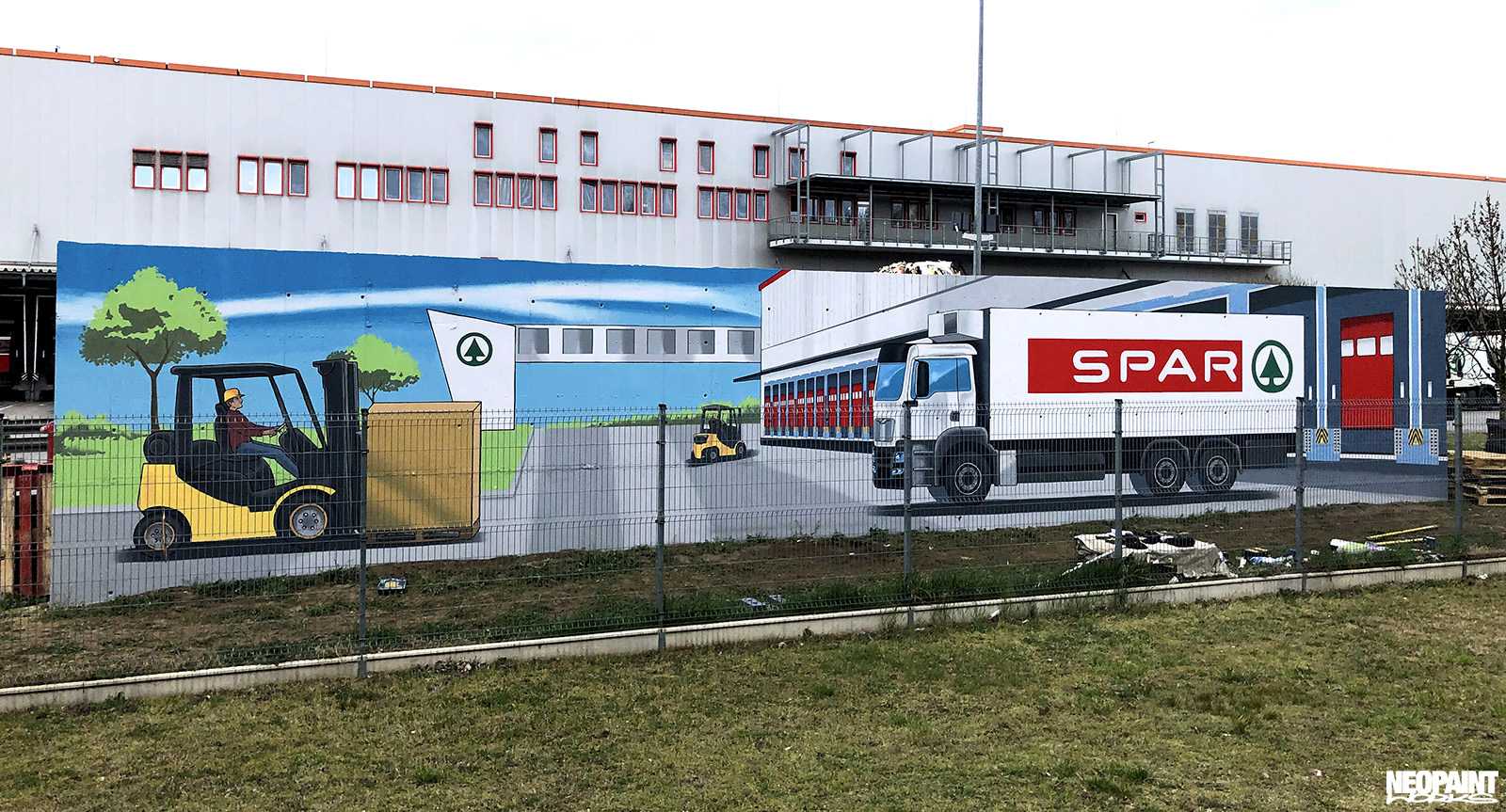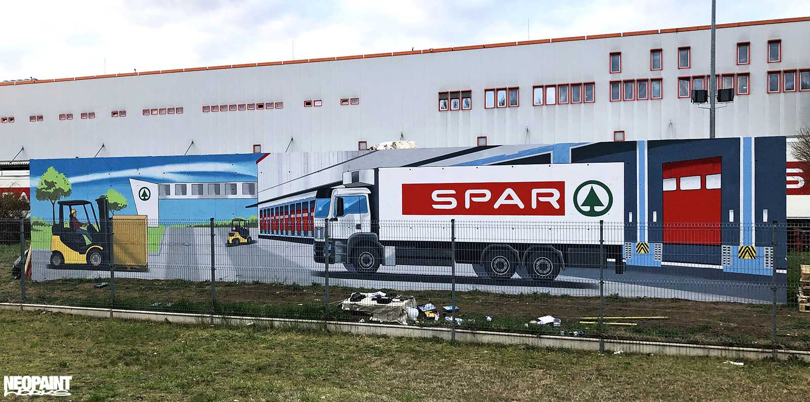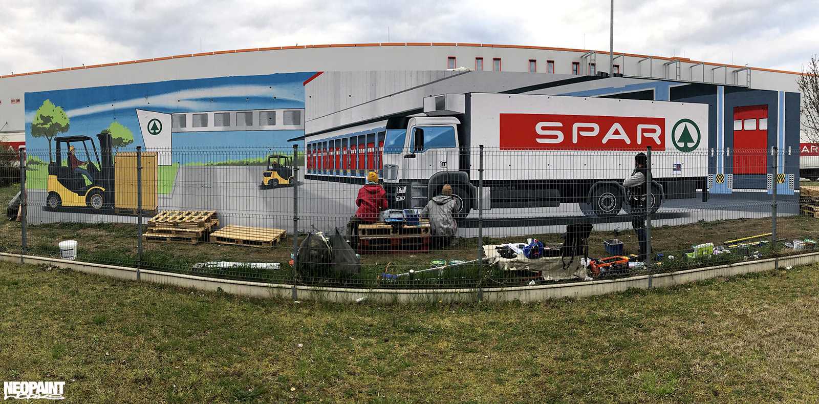 A Spar egyik logisztikai központjában készült falfestmény dekoráció. A 18 méter hosszú kép 4 nap alatt készült el amelyhez a grafikai tervet a Spice Communication Kft. biztosította.