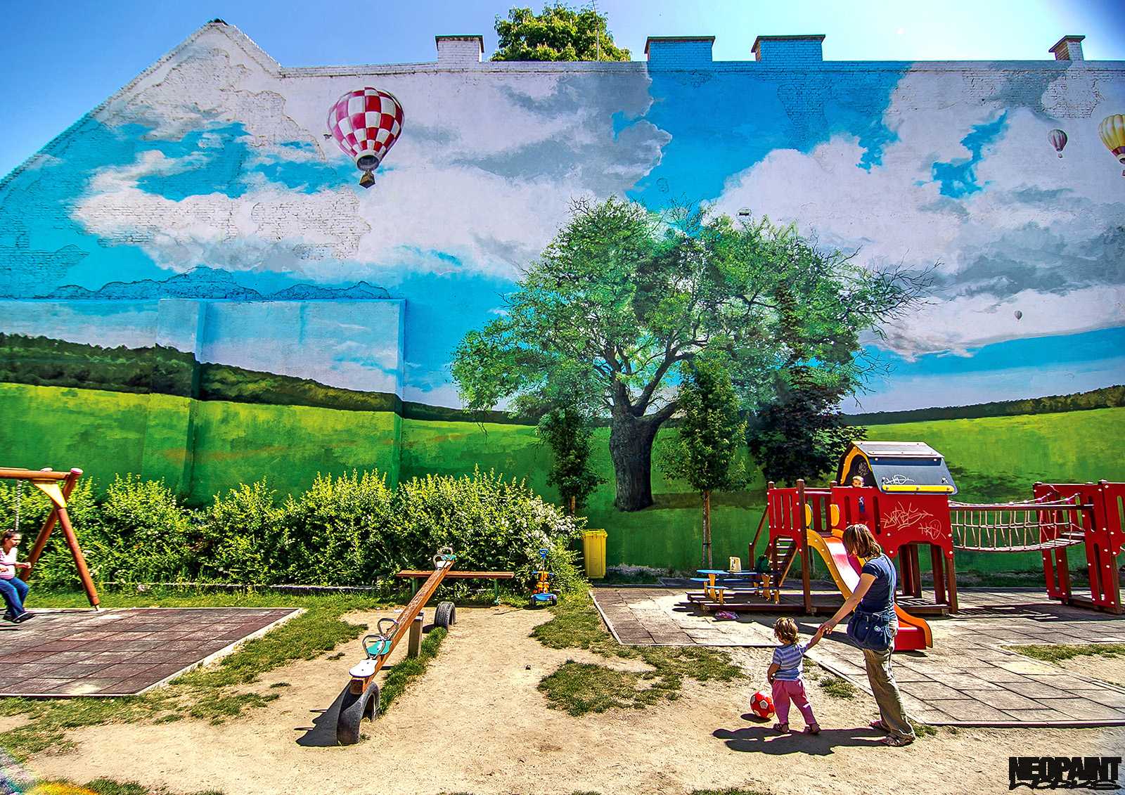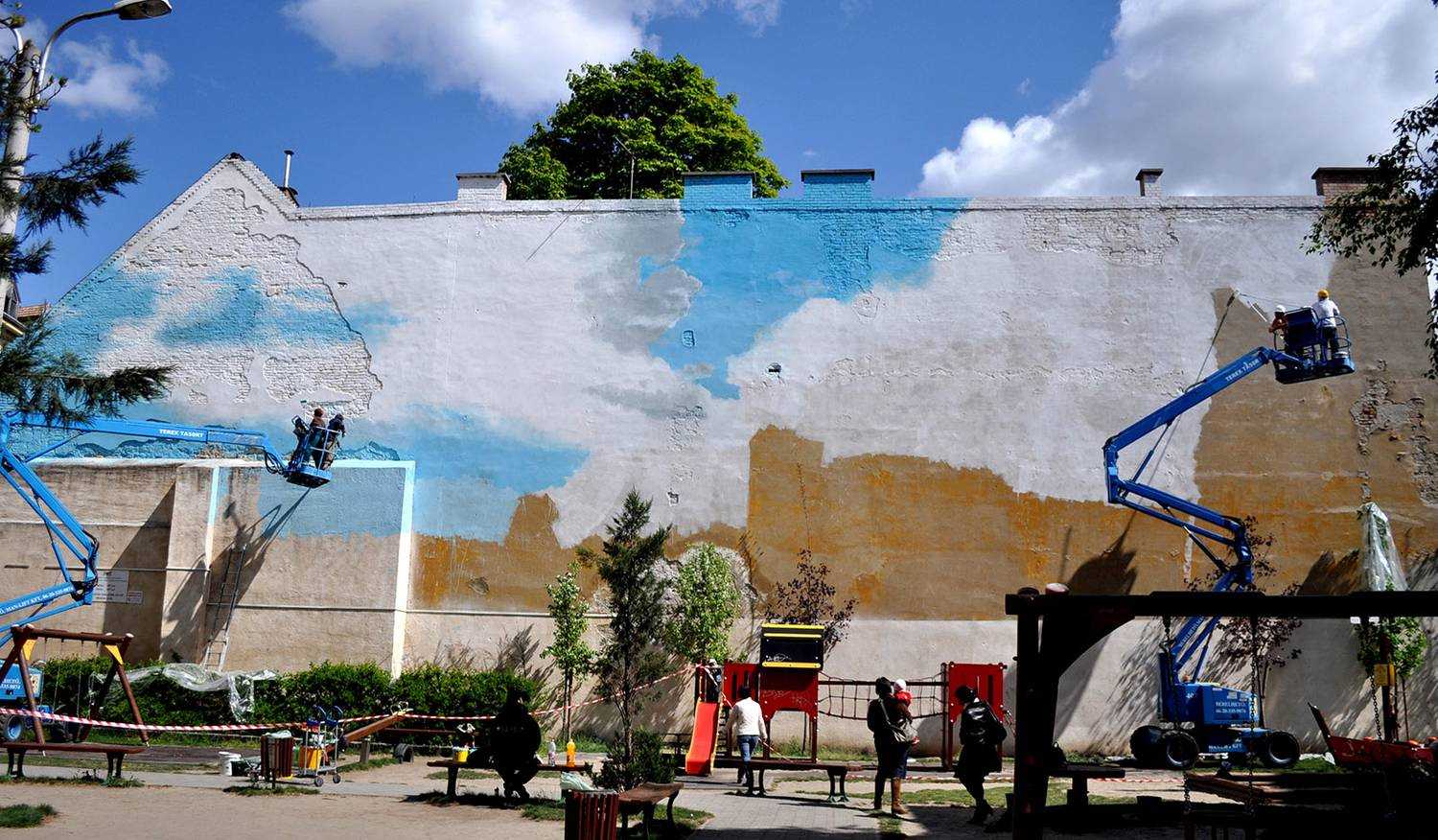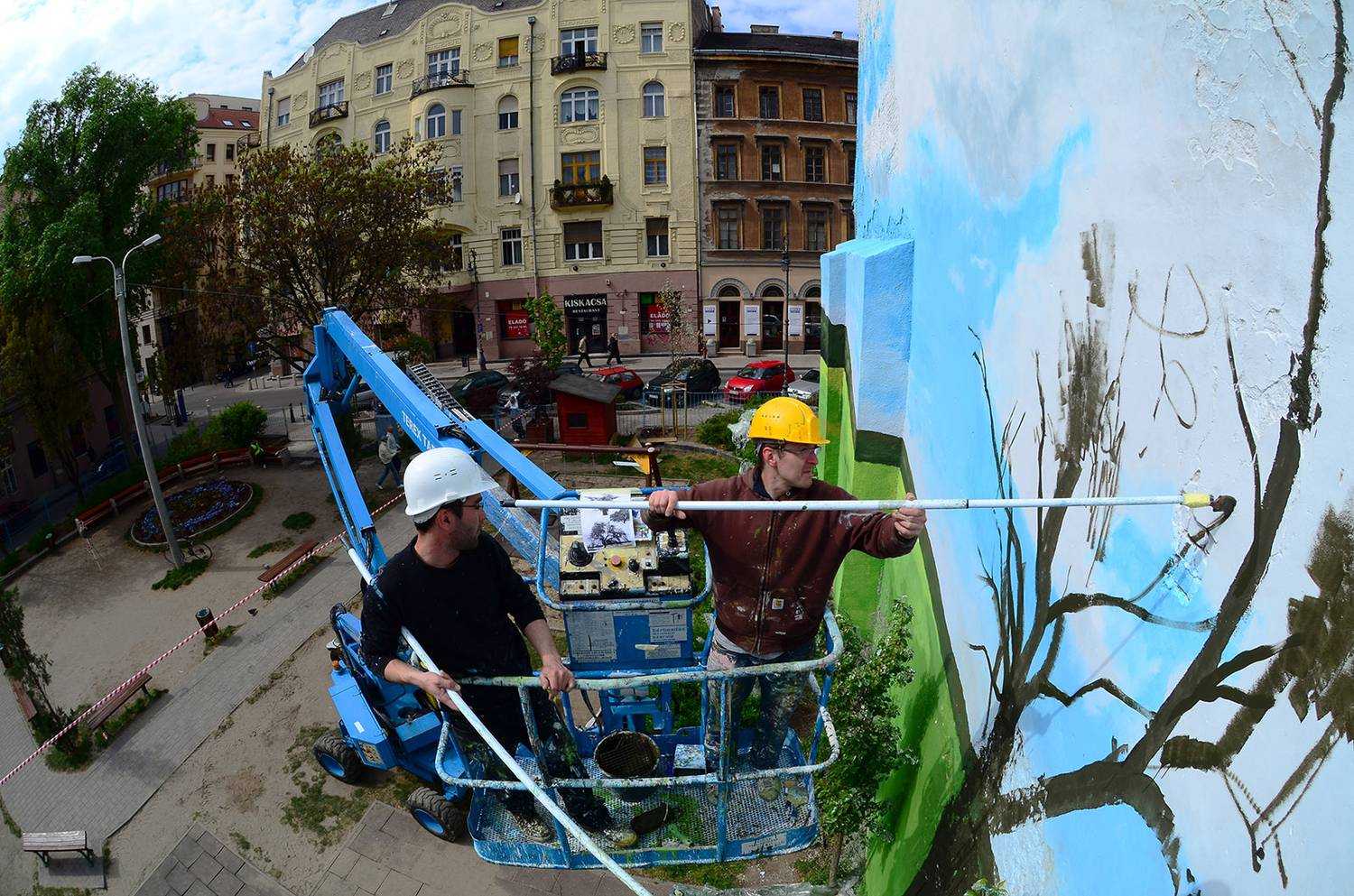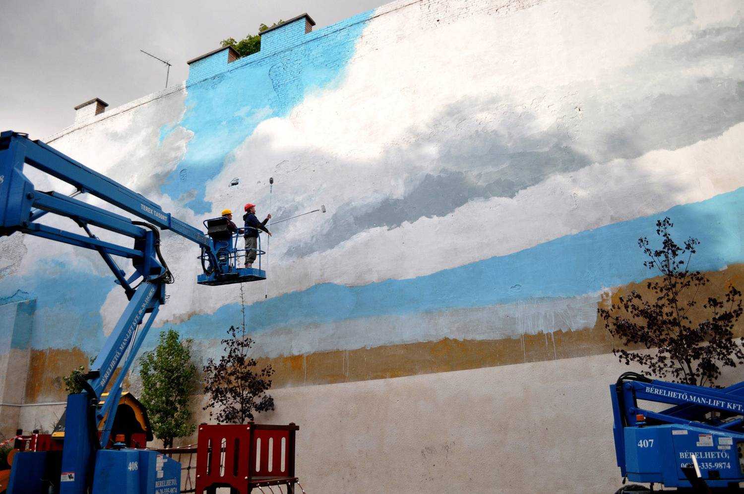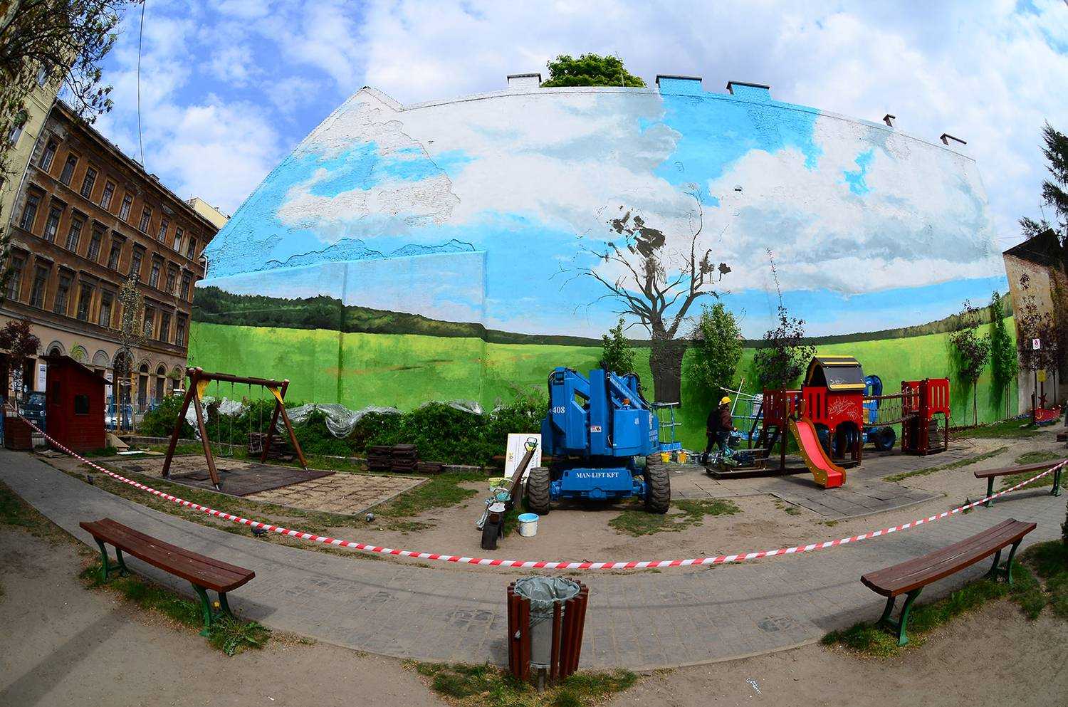 Csoportunk első tűzfalfestménye Budapest belvárosában. Az évekig szürkén, kopottan álló falfelületen 6 napig dolgoztunk, aminek eredményeként egy óriási mező lett a háttere a fal előtti játszótérnek. A festmény alapvetően megváltoztatta a budapesti lakosság hozzáállását a köztéri falfestményekhez. Egy pozitív példa, hogy miként változhat meg gyorsan és hatásosan egy hatalmas felület, feldobva ezzel az egész környék hangulatát. A tűzfalfestmény Budapest egyik turisztikai nevezetessége lett. Tájkép.