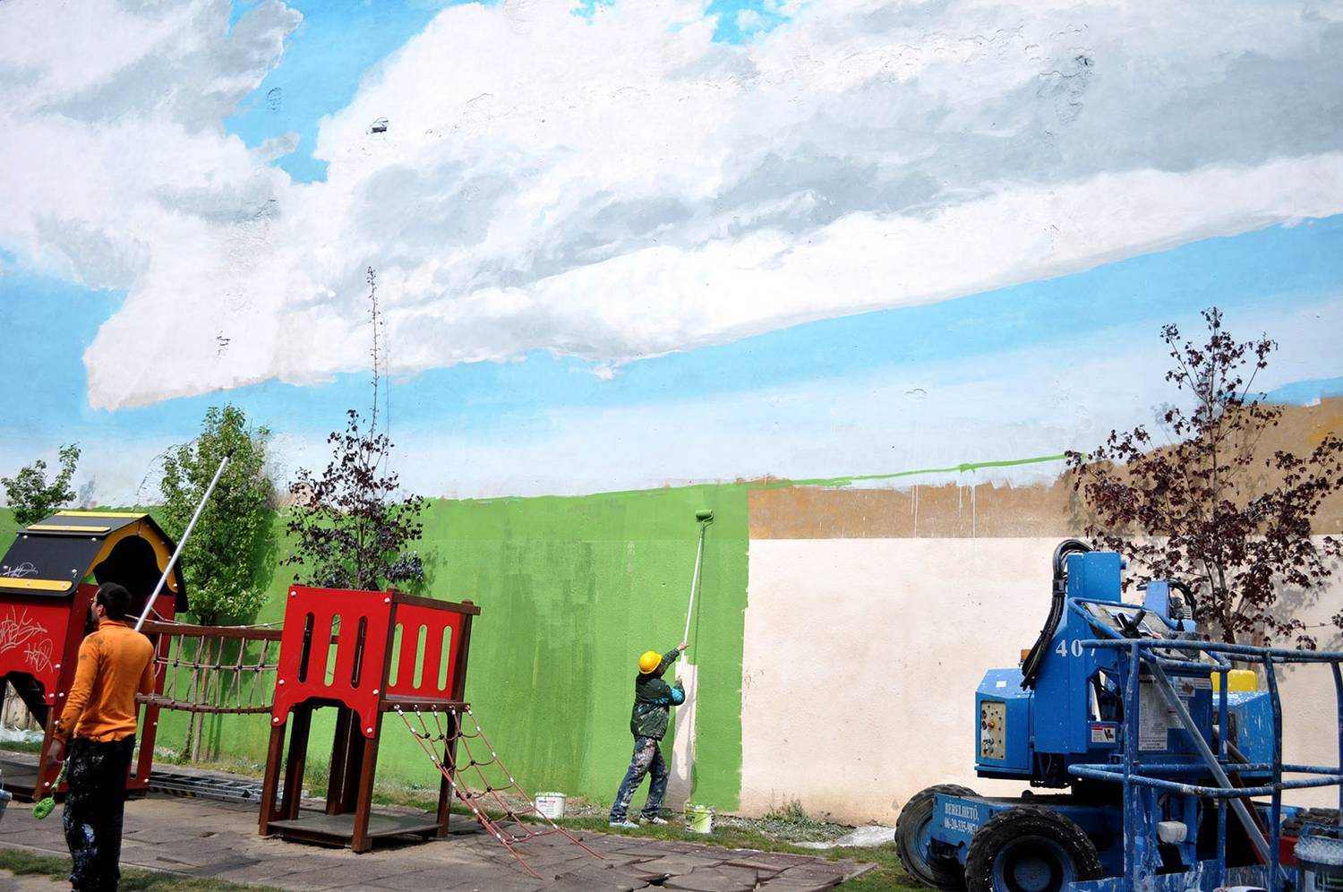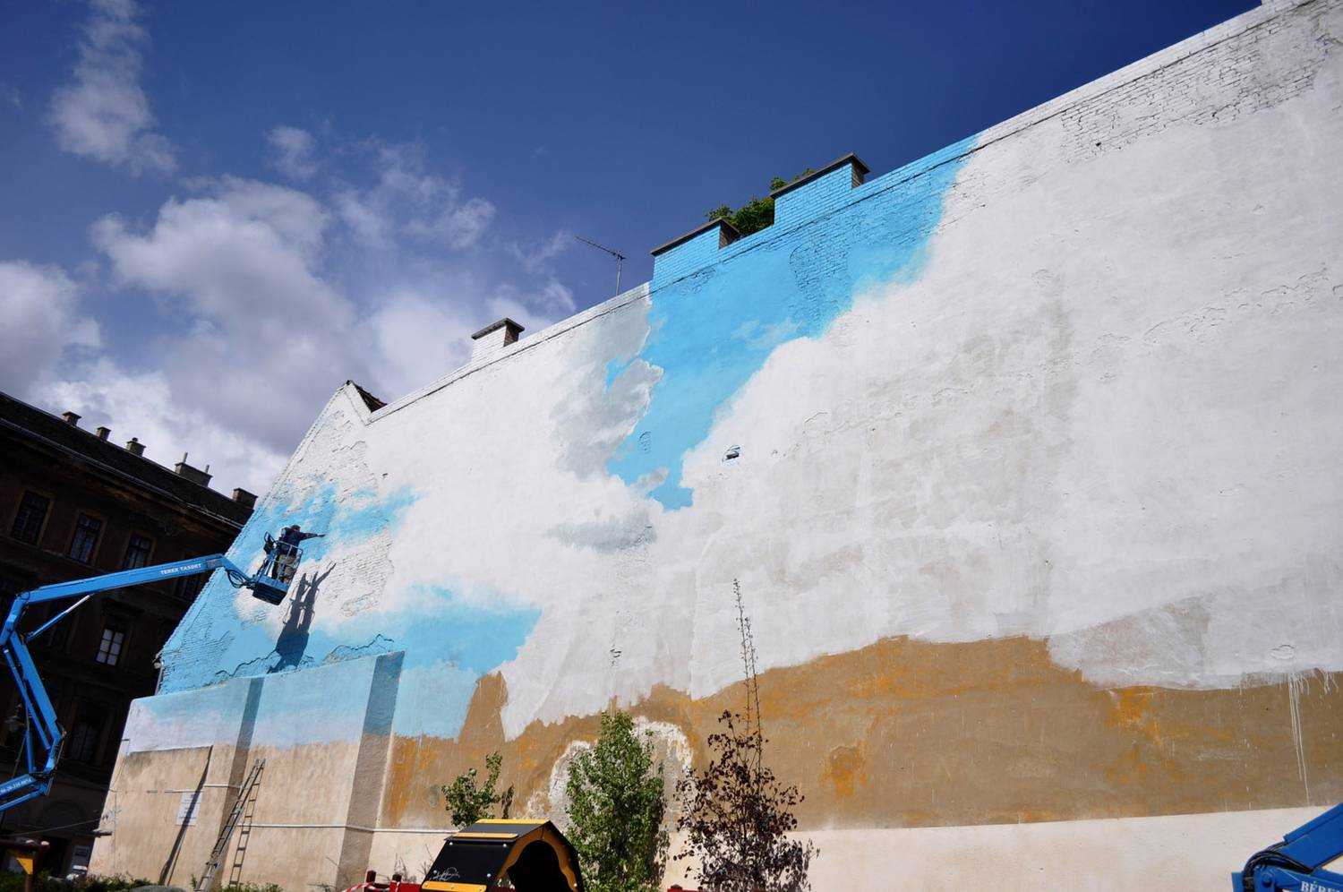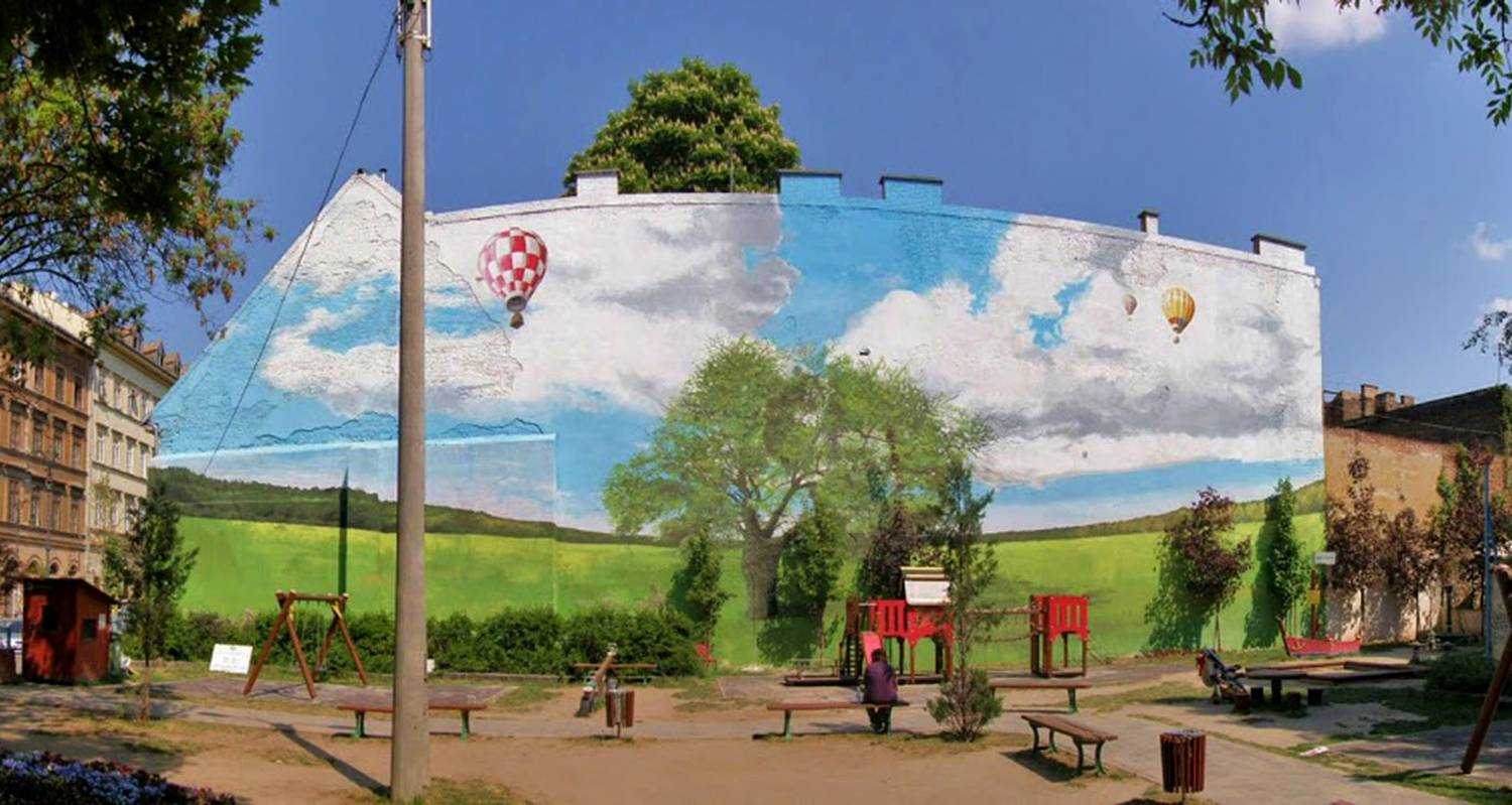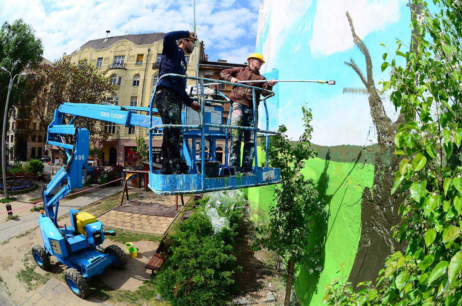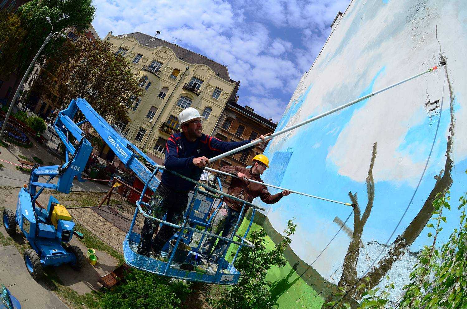 Csoportunk első tűzfalfestménye Budapest belvárosában. Az évekig szürkén, kopottan álló falfelületen 6 napig dolgoztunk, aminek eredményeként egy óriási mező lett a háttere a fal előtti játszótérnek. A festmény alapvetően megváltoztatta a budapesti lakosság hozzáállását a köztéri falfestményekhez. Egy pozitív példa, hogy miként változhat meg gyorsan és hatásosan egy hatalmas felület, feldobva ezzel az egész környék hangulatát. A tűzfalfestmény Budapest egyik turisztikai nevezetessége lett. Tájkép.