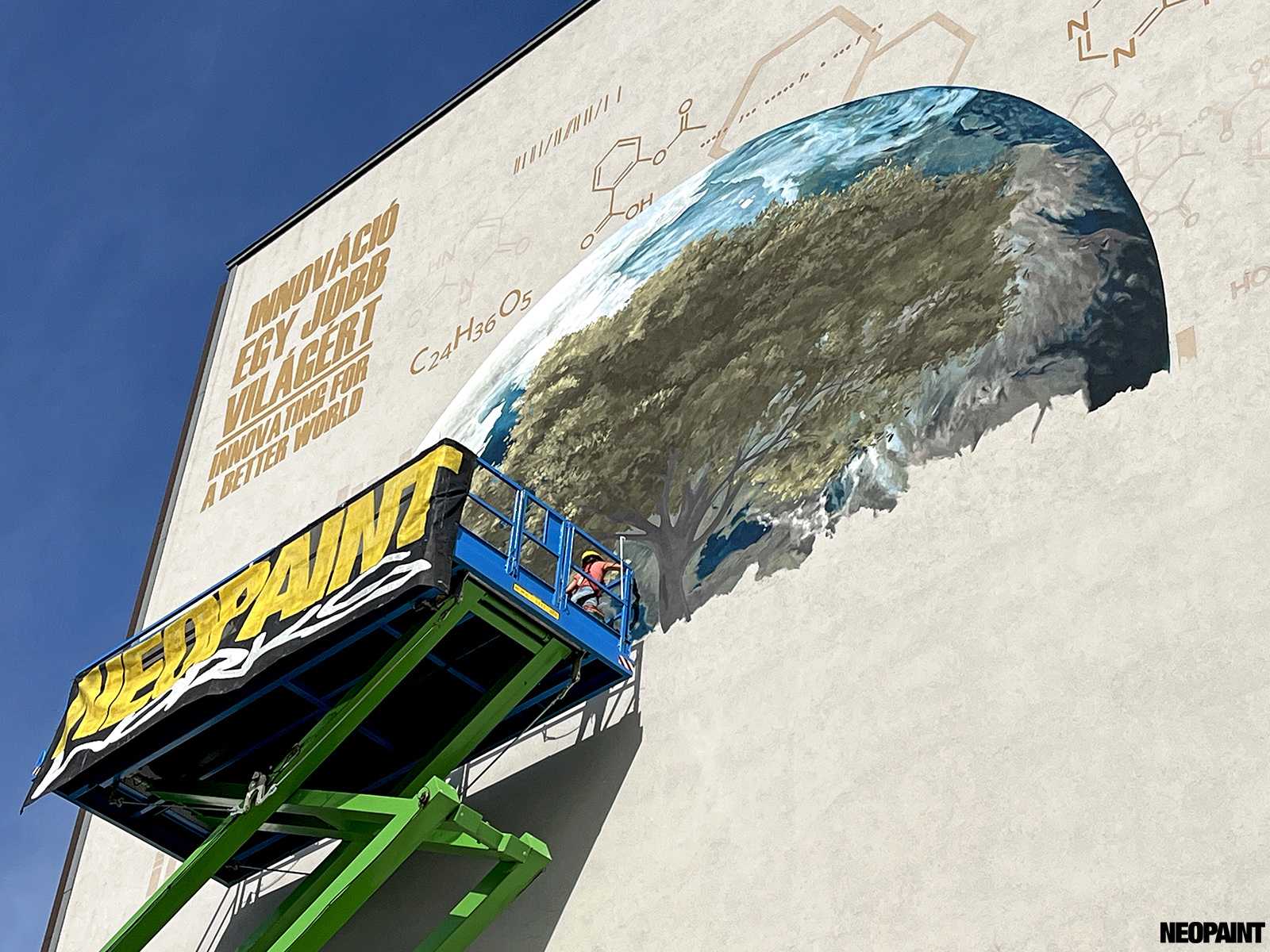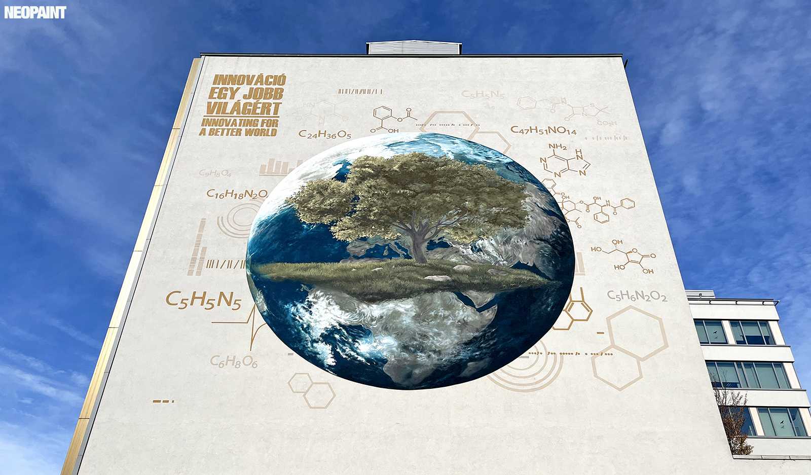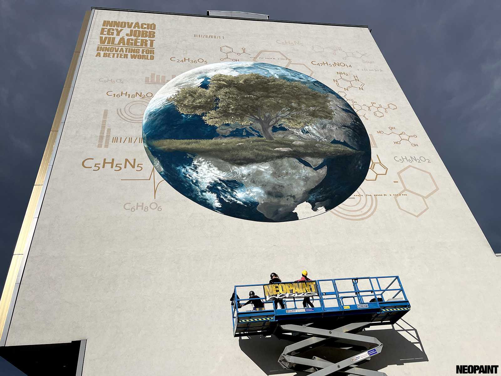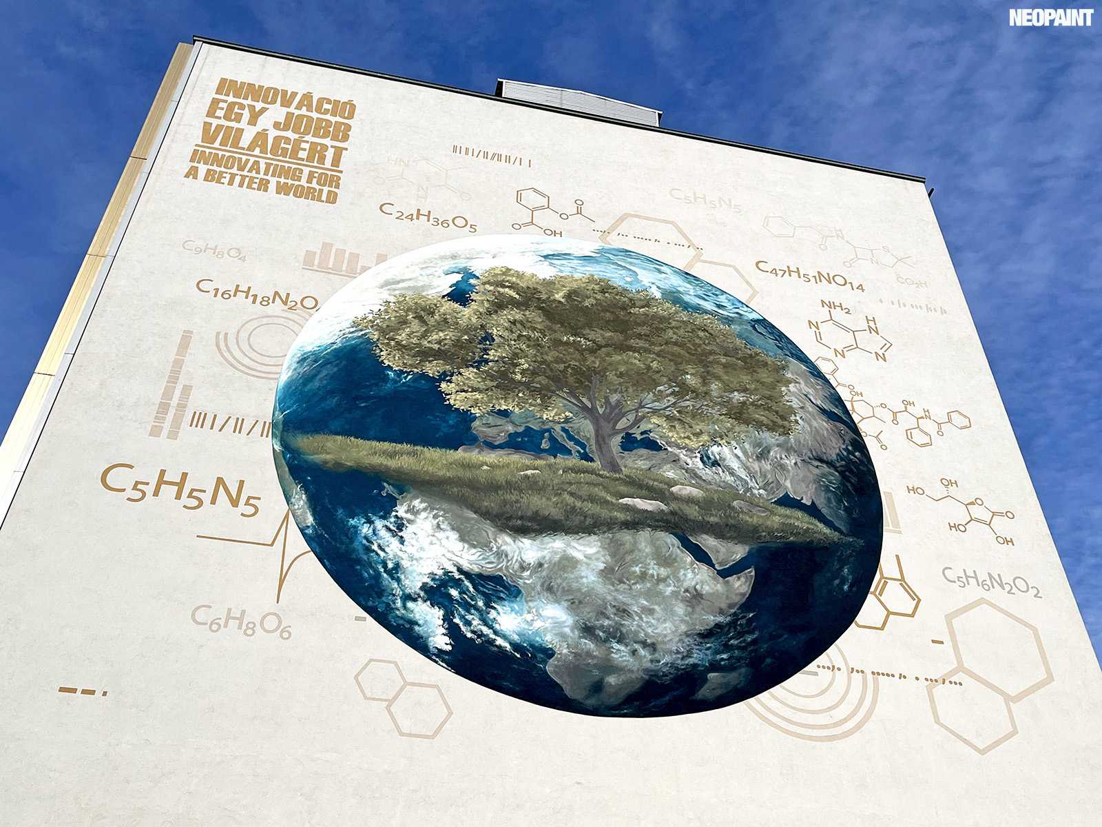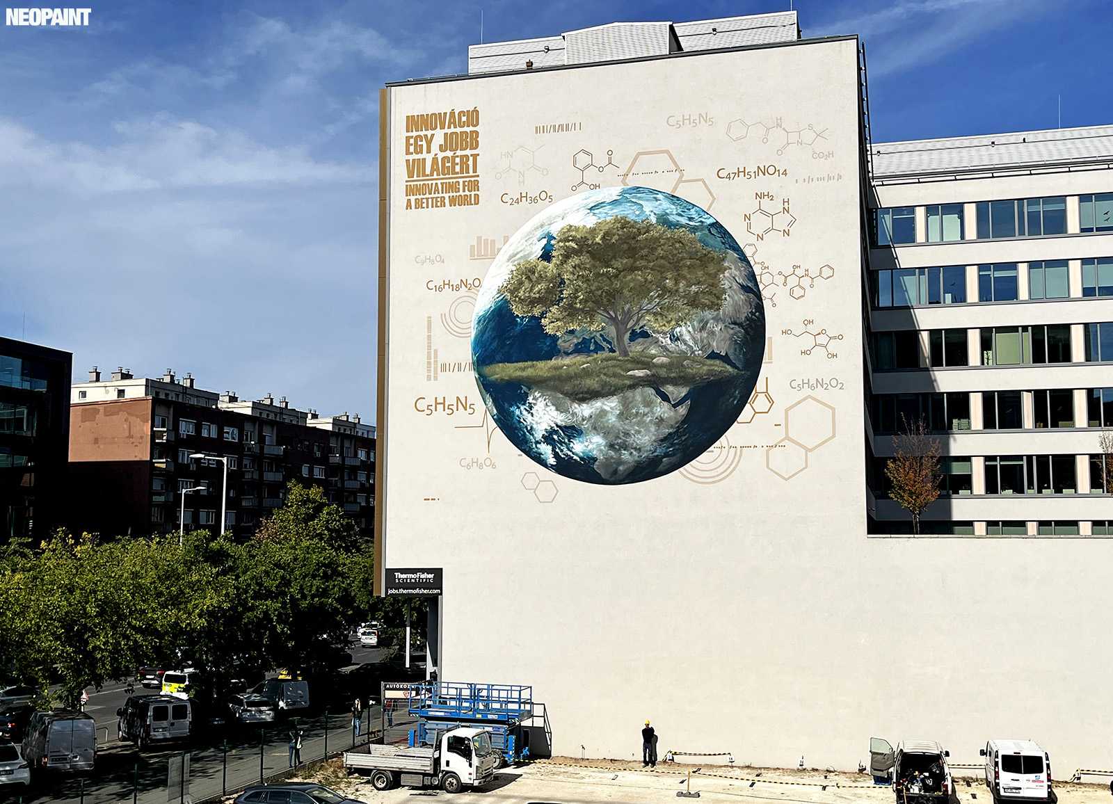 A megrendelő cégnek határozott elképzlései voltak arról, hogy mit és mlyen forméban szeretnének megjeleníteni a falon, kiemelten a földgolyót a természettel és a tudományokkal szoros együttműködésében.