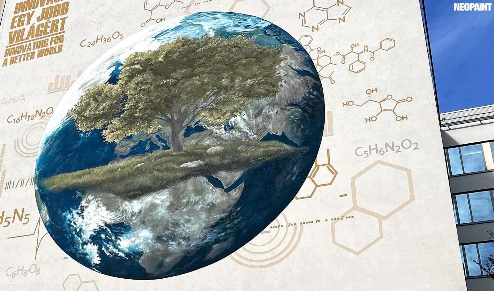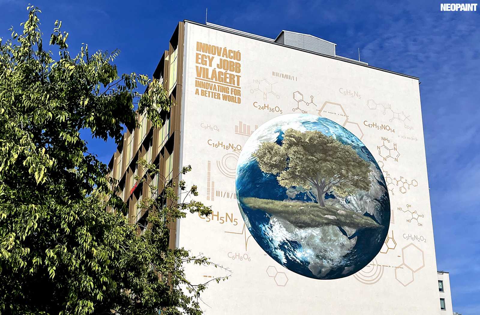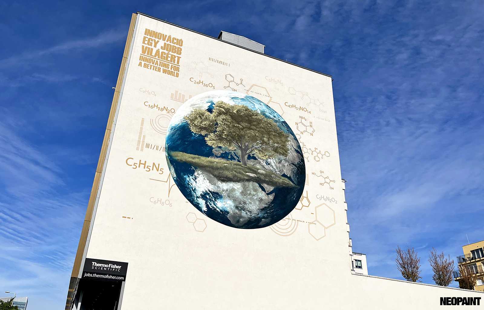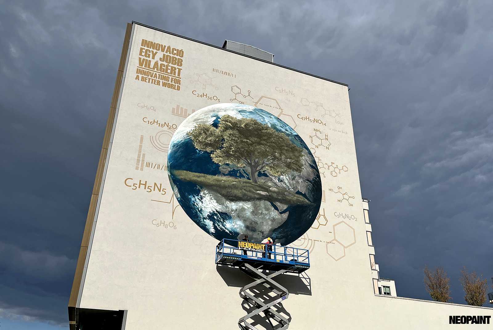 A megrendelő cégnek határozott elképzlései voltak arról, hogy mit és mlyen forméban szeretnének megjeleníteni a falon, kiemelten a földgolyót a természettel és a tudományokkal szoros együttműködésében.