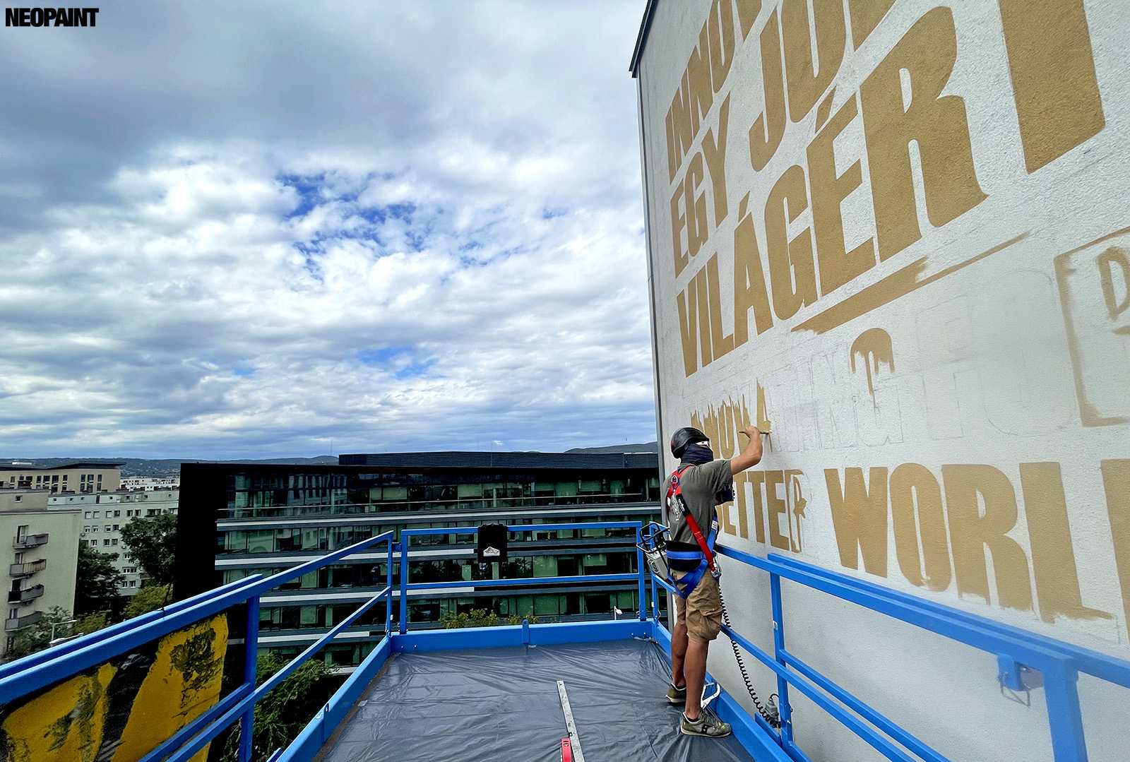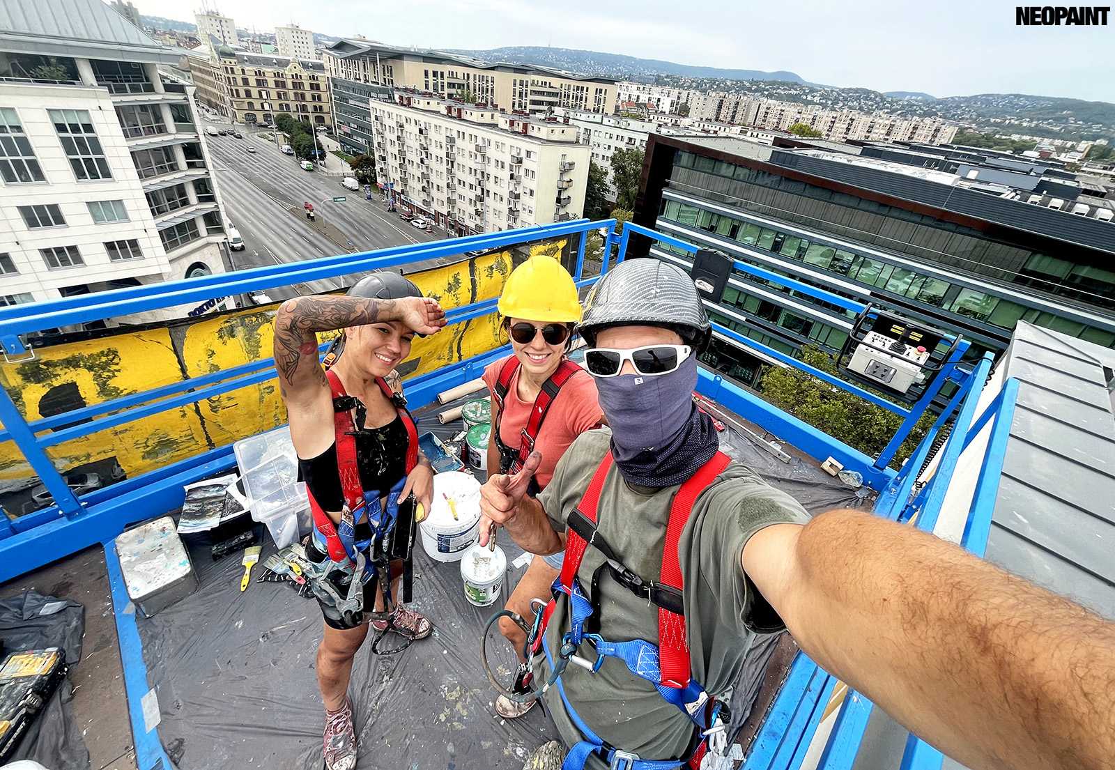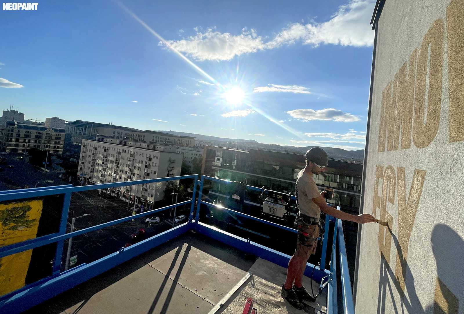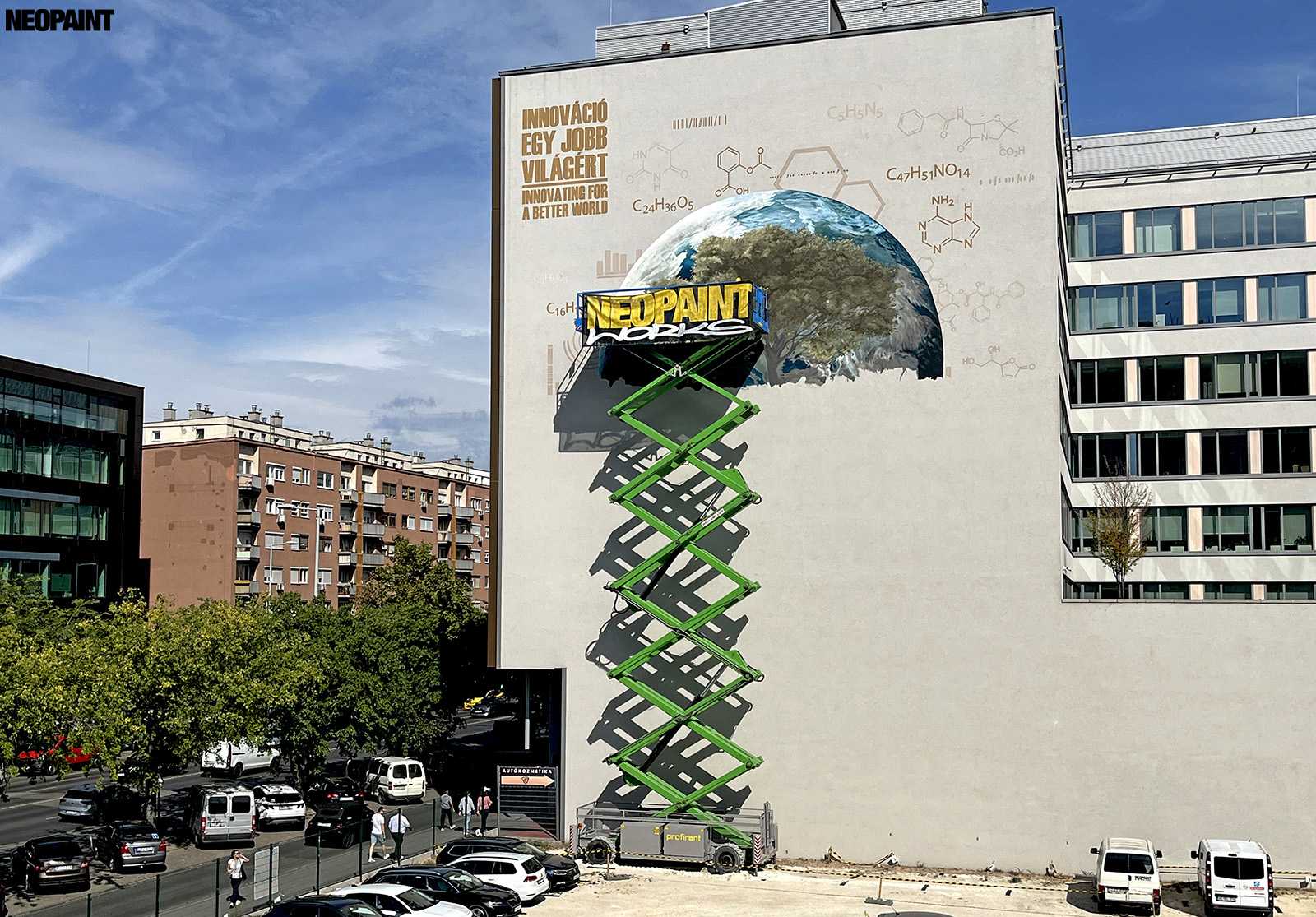 Egy közel 600 m2-es tűzfal felületre készült falfestményünk a budapesti XIII. kerület, Váci út egyik irodaház oldalán.