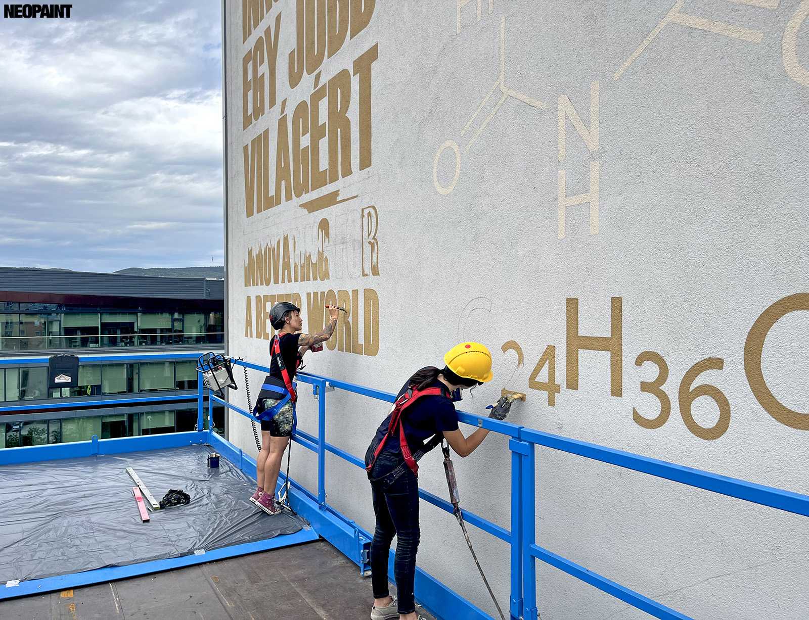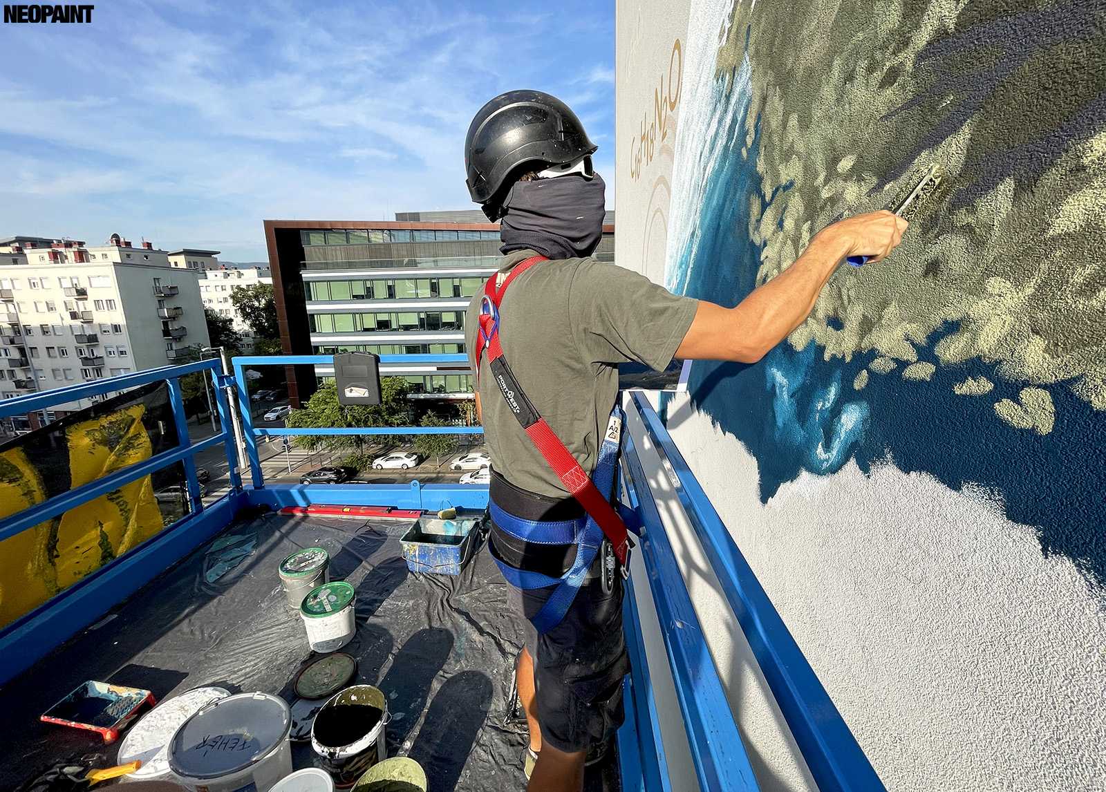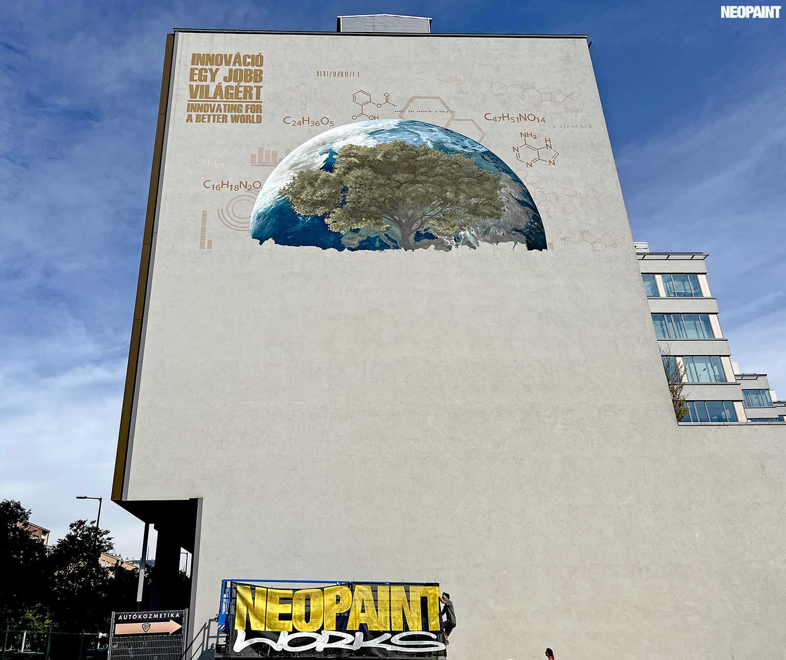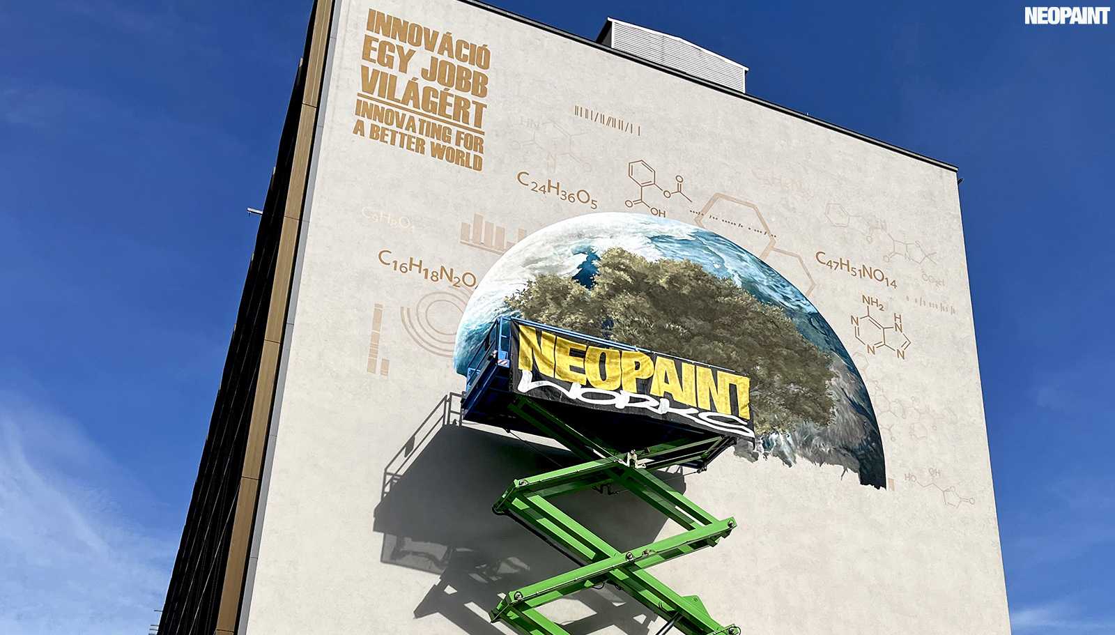Egy közel 600 m2-es tűzfal felületre készült falfestményünk a budapesti XIII. kerület, Váci út egyik irodaház oldalán.