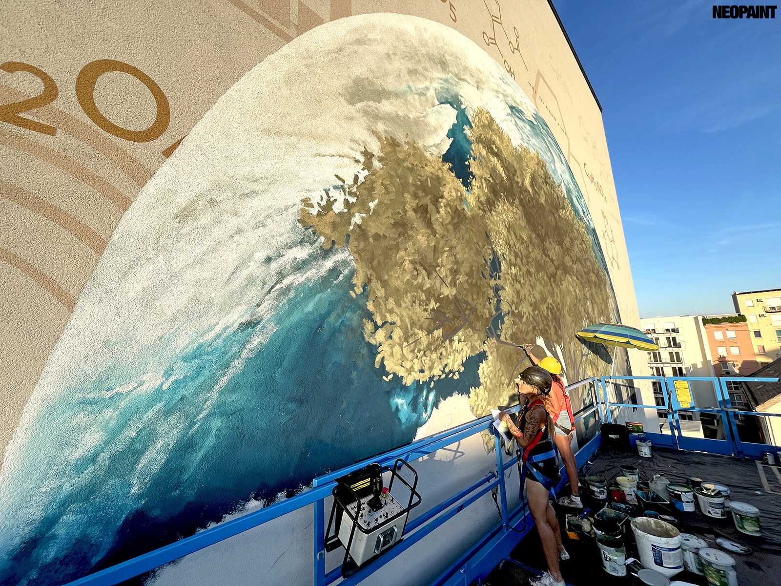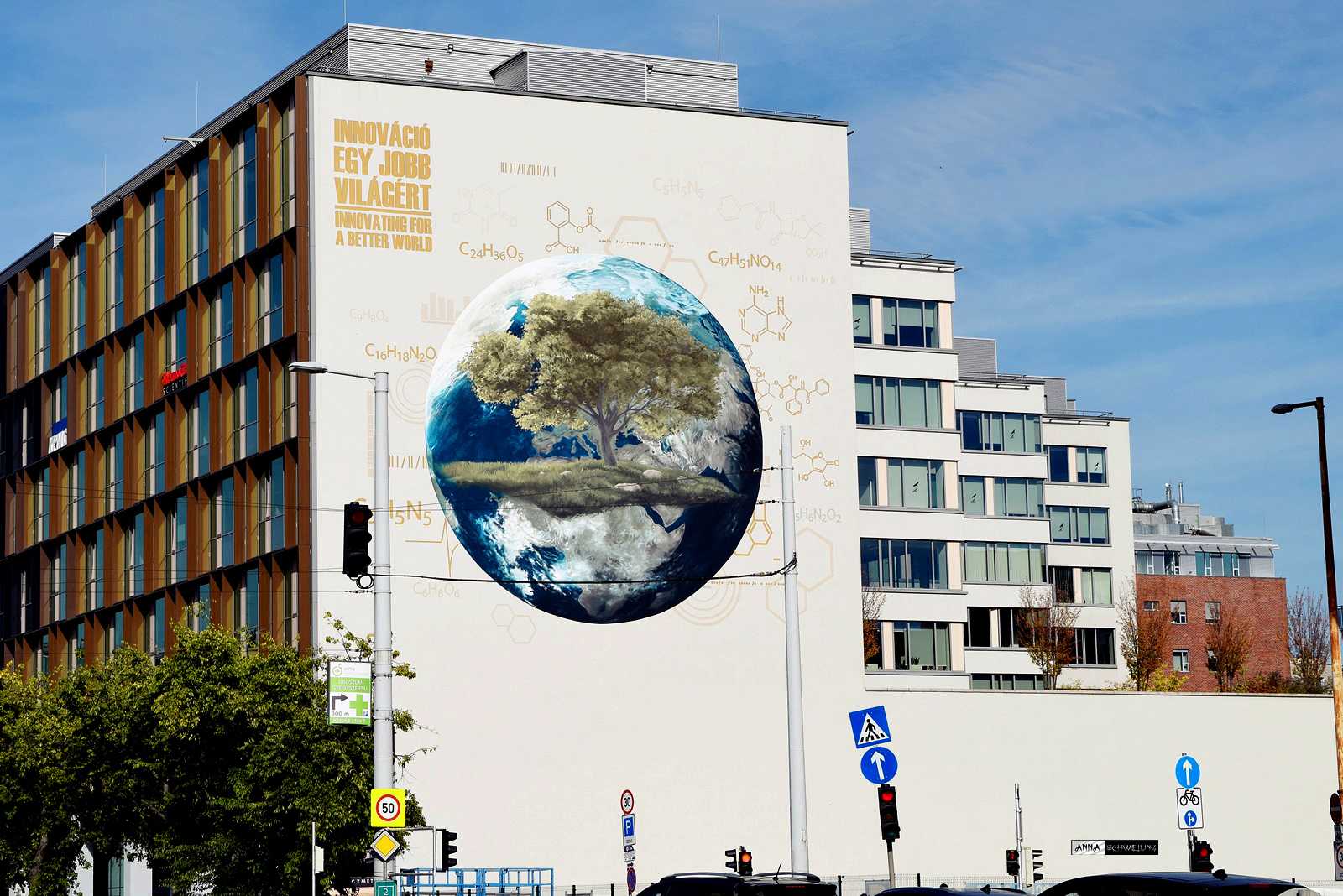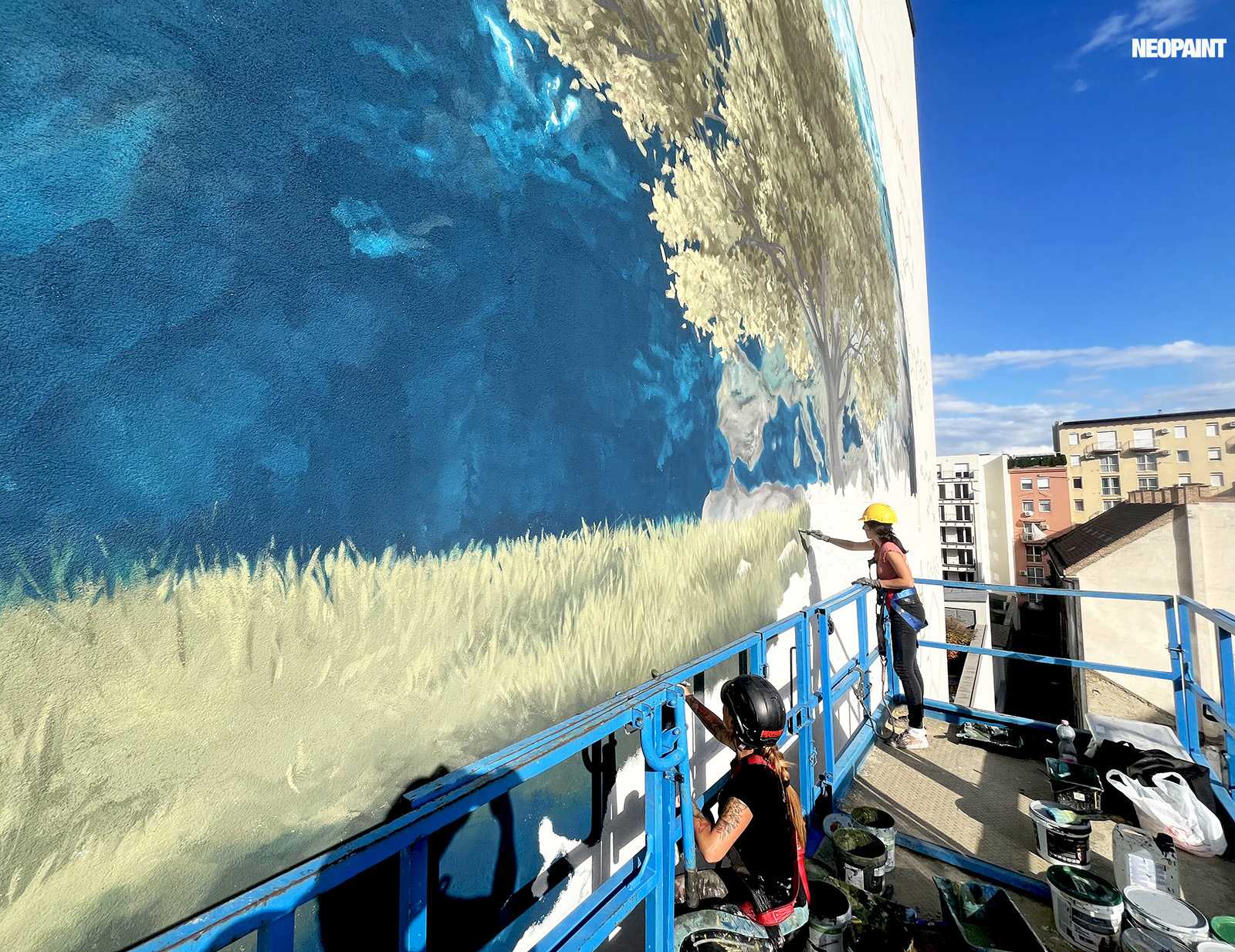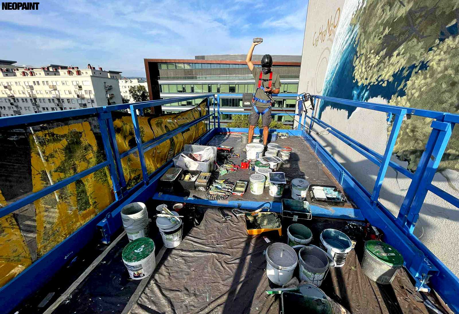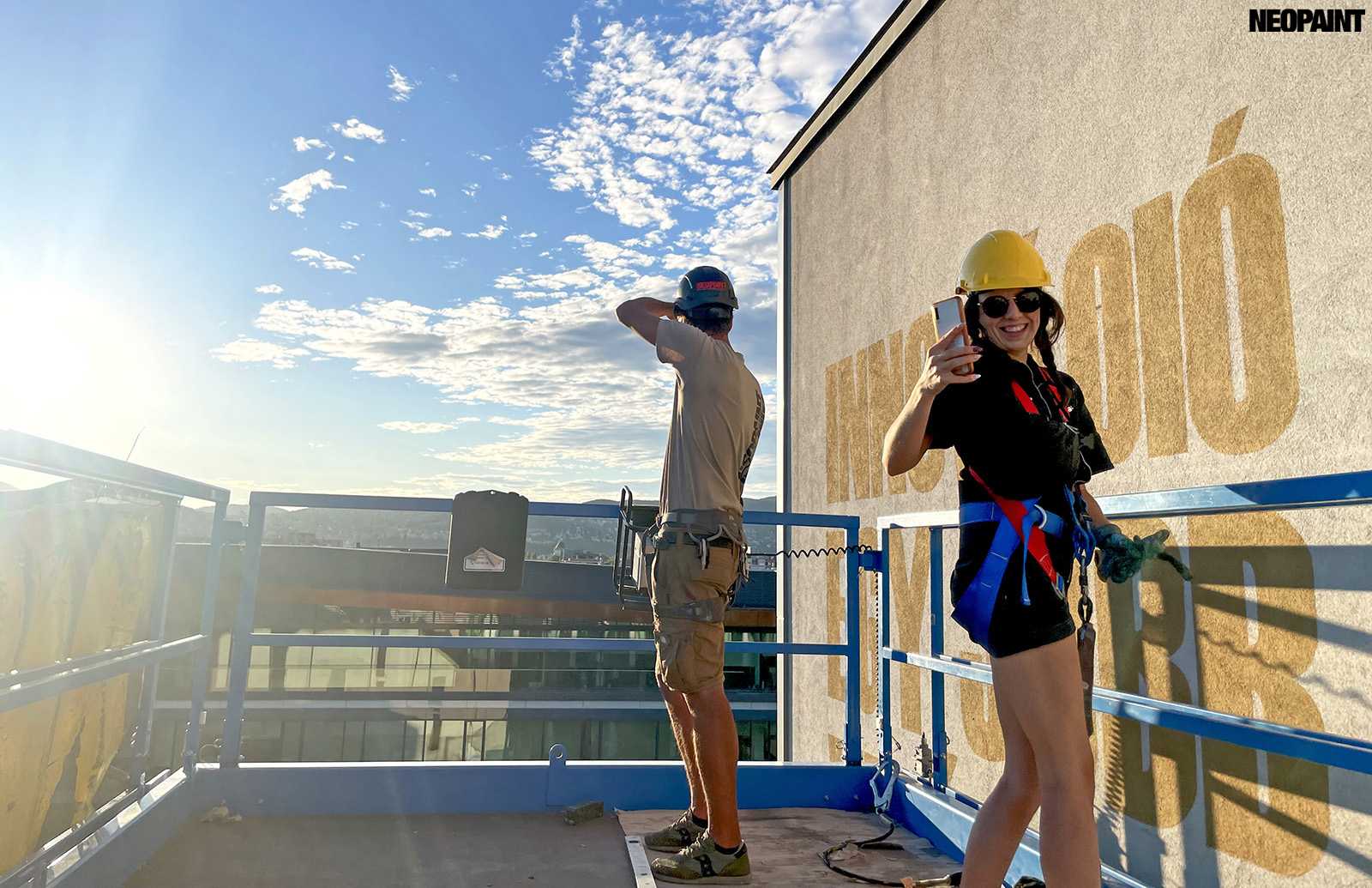 Egy közel 600 m2-es tűzfal felületre készült falfestményünk a budapesti XIII. kerület, Váci út egyik irodaház oldalán.