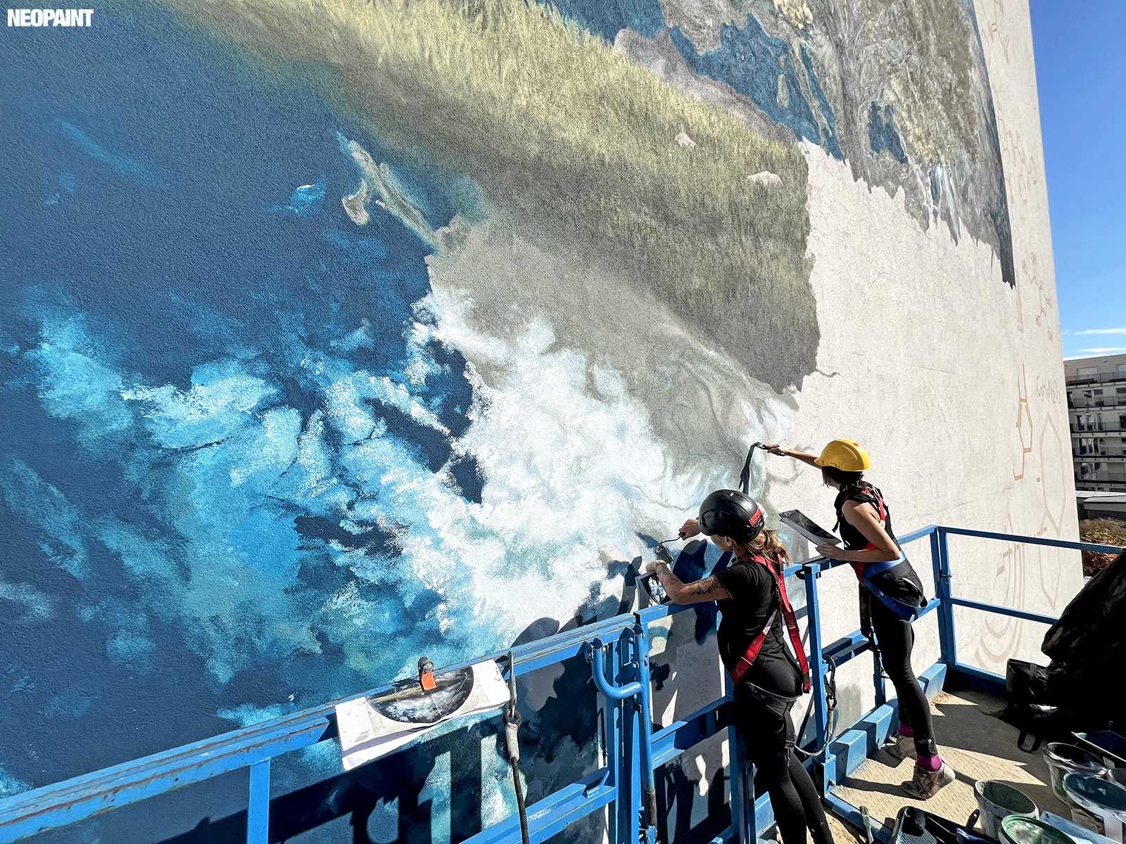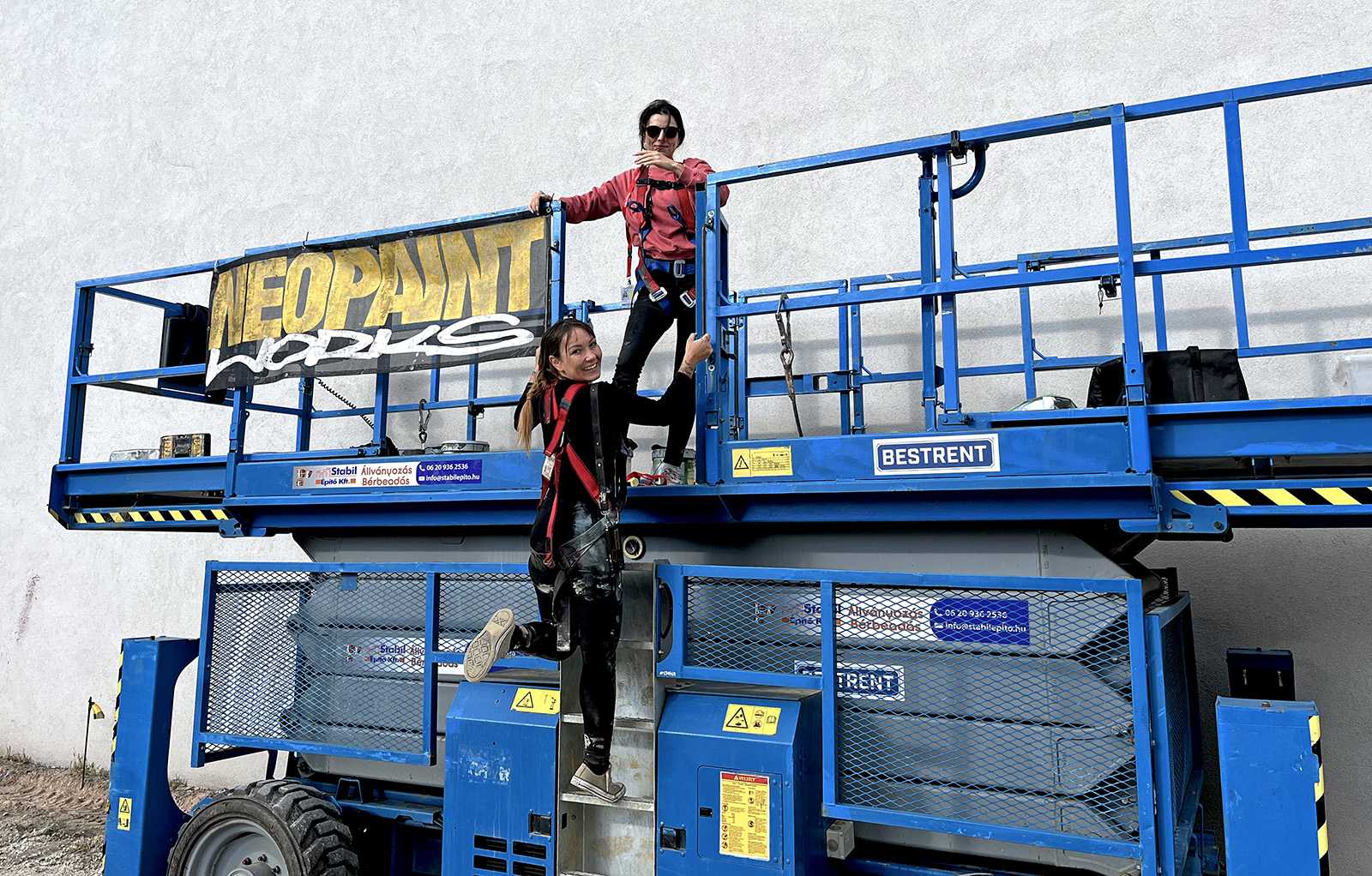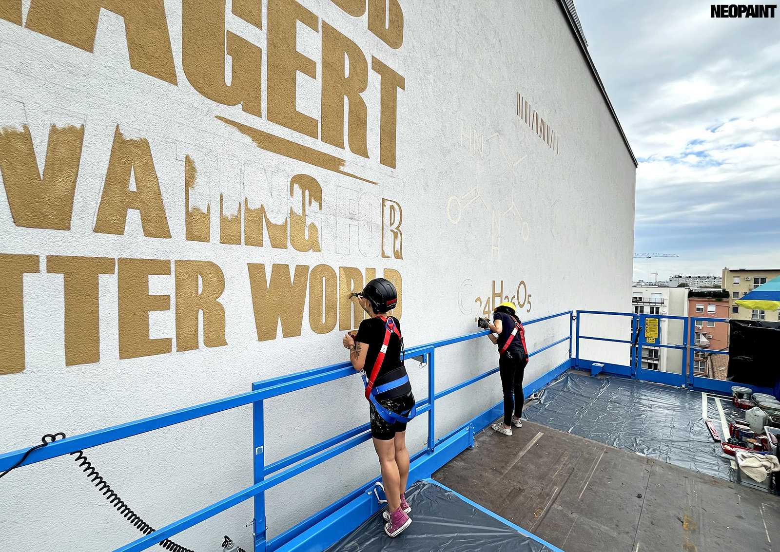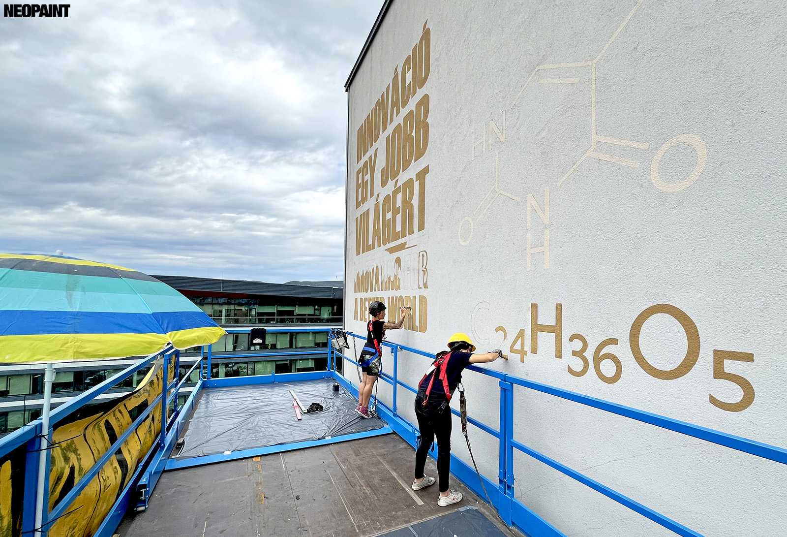 Egy közel 600 m2-es tűzfal felületre készült falfestményünk a budapesti XIII. kerület, Váci út egyik irodaház oldalán.