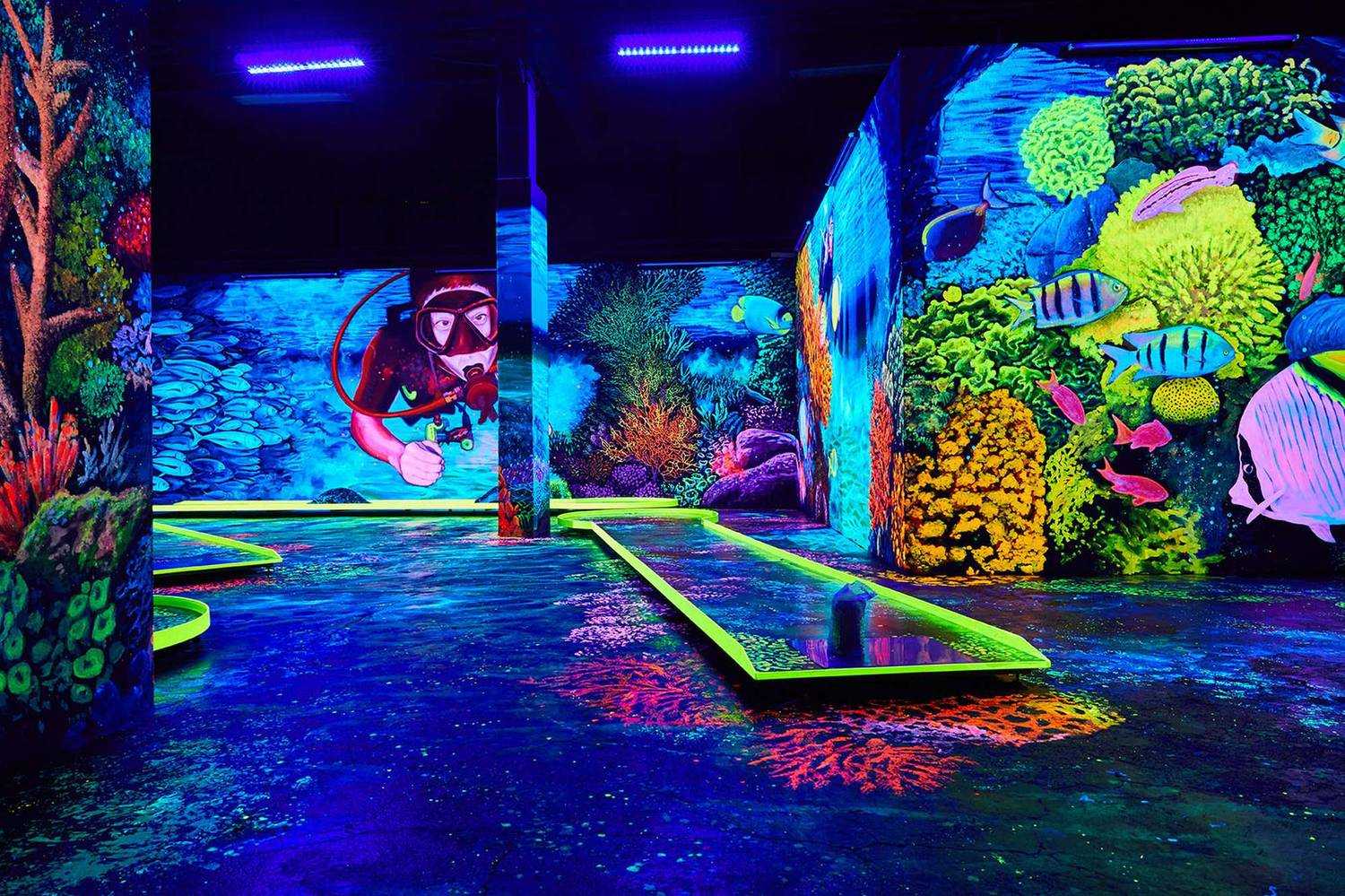 Magyarországon elsőként nyitotta meg kapuit egy olyan minigolf centrum, ahol a játék UV fényben történik. A falfelületekre UV reagáns festékkel készültek a 3D-s festmények több, mint 1000nm-en, 3 témakörben: óceán, űr és egy “képzelt” Magyarország. Díszletfestés.
